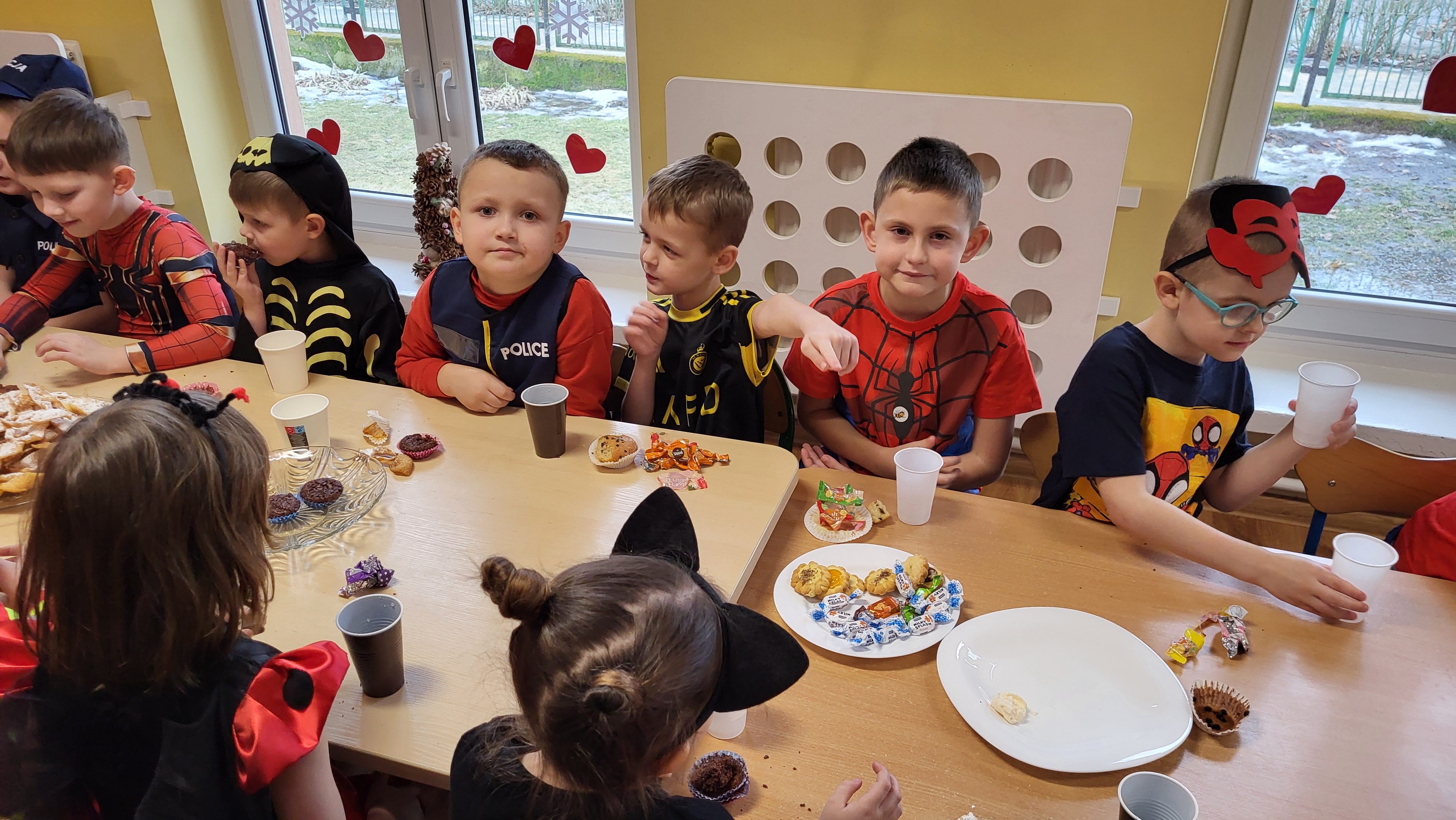 Na koniec, na małych tancerzy czekał słodki poczęstunek, przygotowany przez niezawodną Radę Rodziców. Były pyszne chruściki, babeczki, bezy i inne pyszności. Bal dostarczył dzieciom niezapomnianych wrażeń, budując atmosferę życzliwości i pozytywne relacje w grupach.