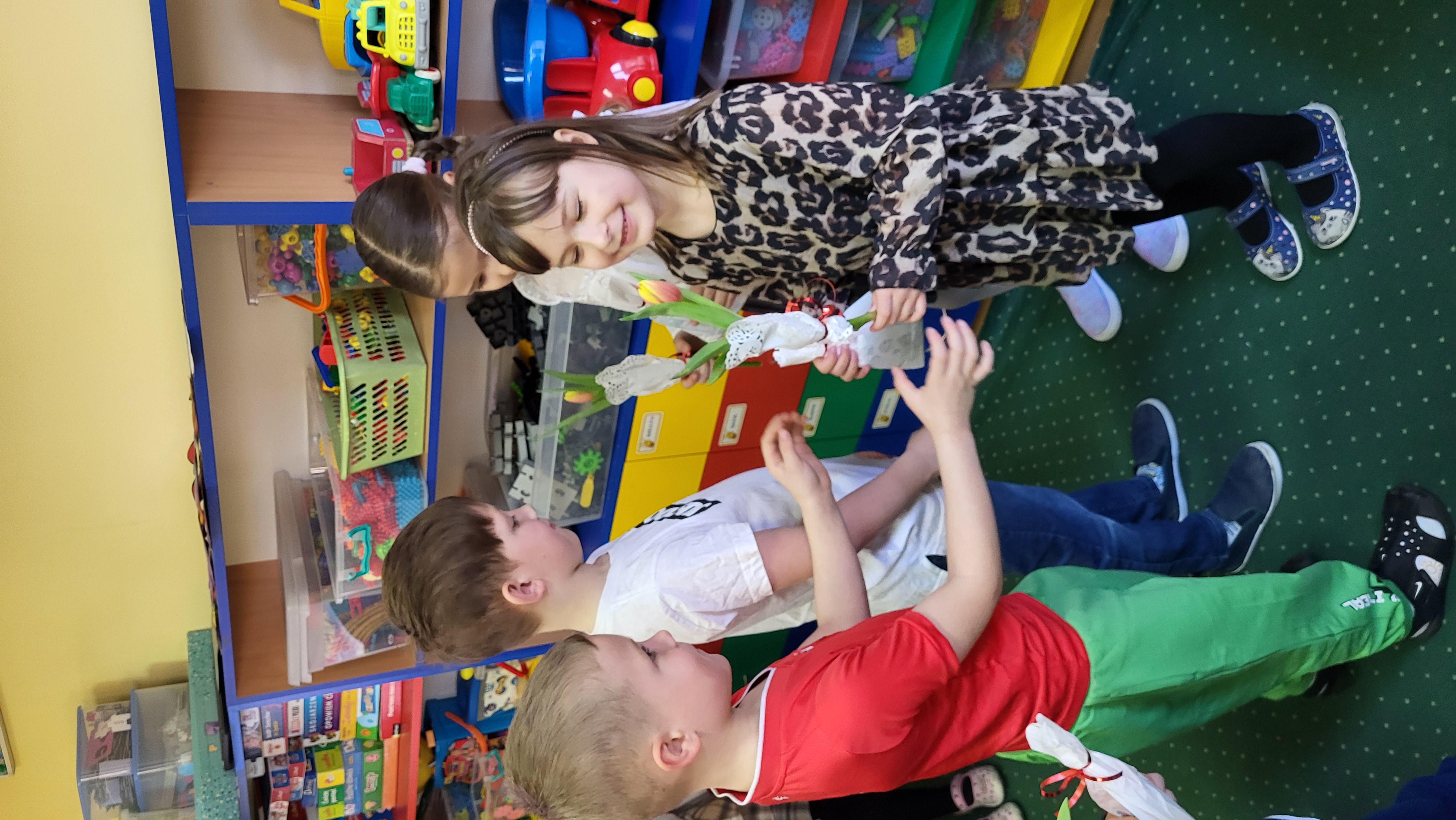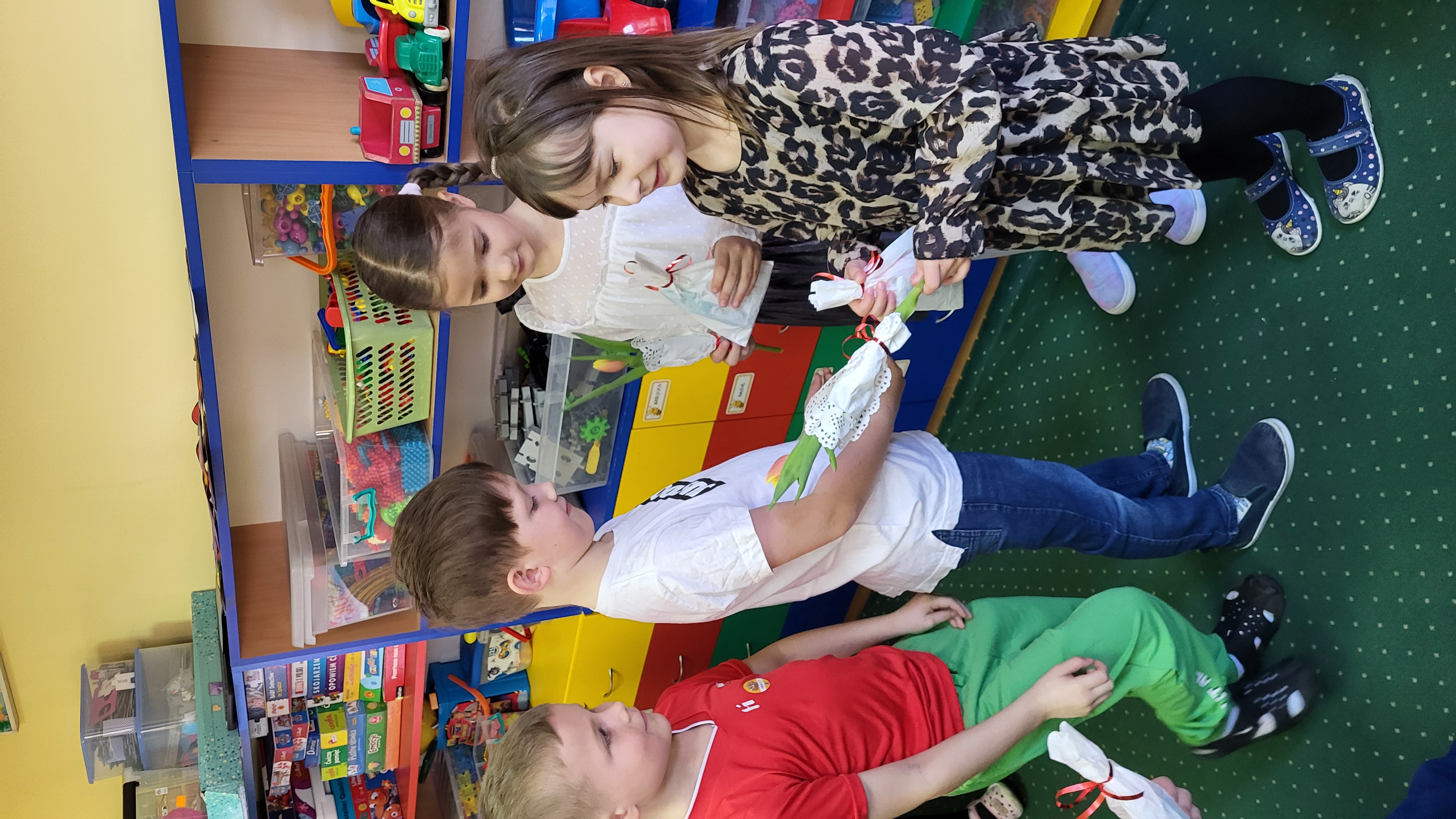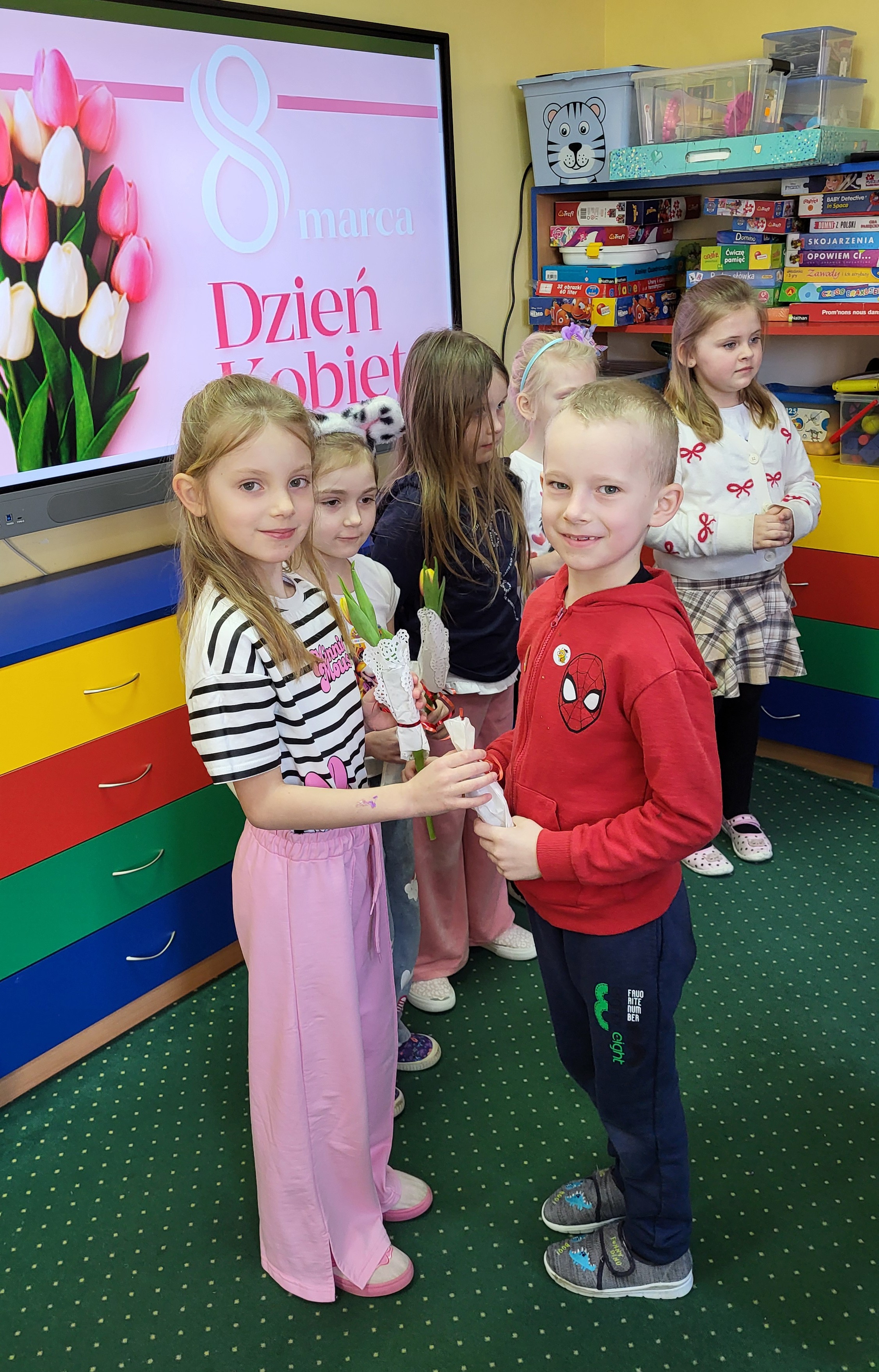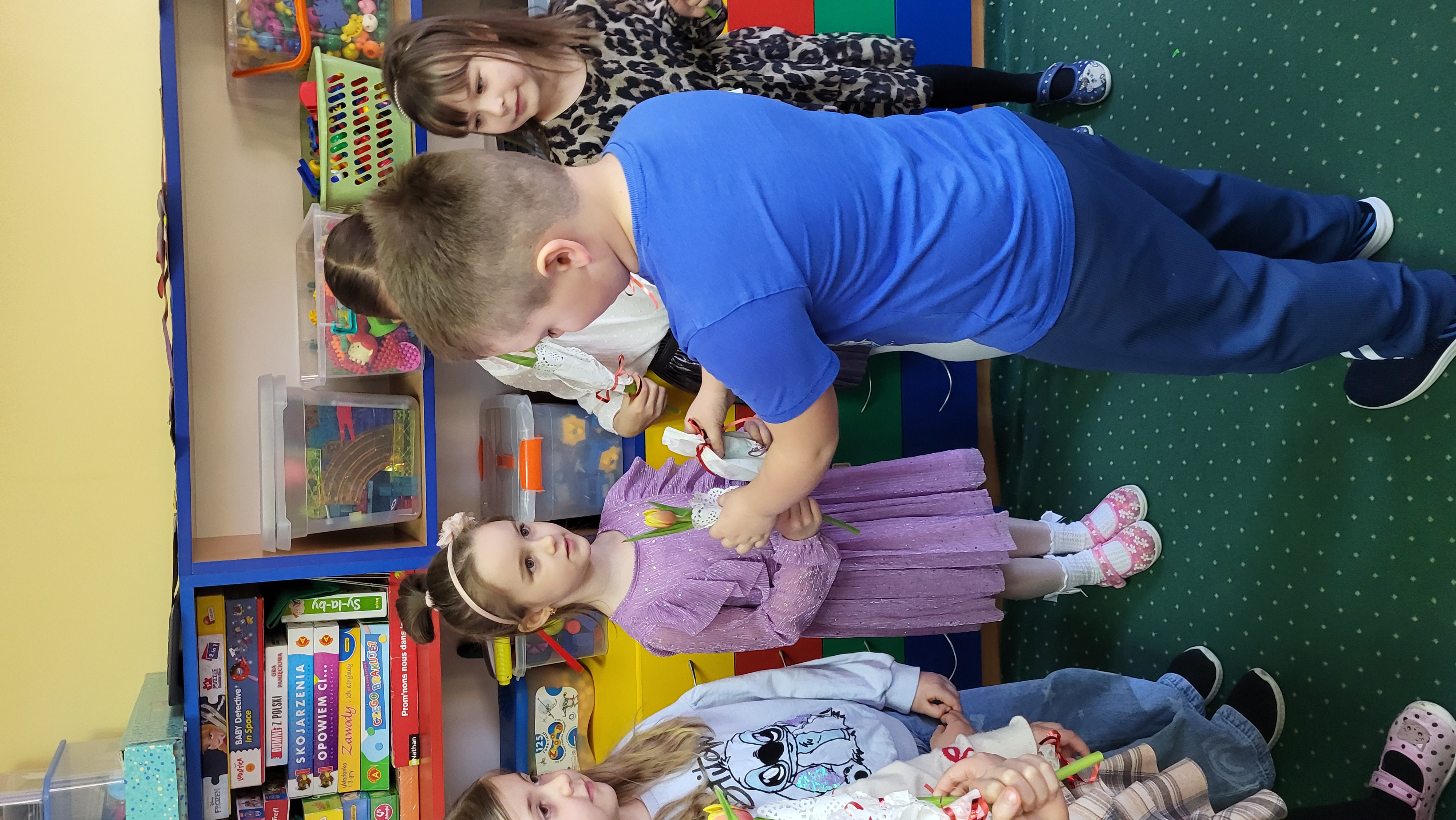 Święto Kobiet obchodzimy symbolicznie już w przedszkolu. Chłopcy wręczyli dziewczynkom piękne kwiaty i drobne upominki składając przy tym serdeczne życzenia. Nie zapomnieli również o wszystkich paniach pracujących w przedszkolu.