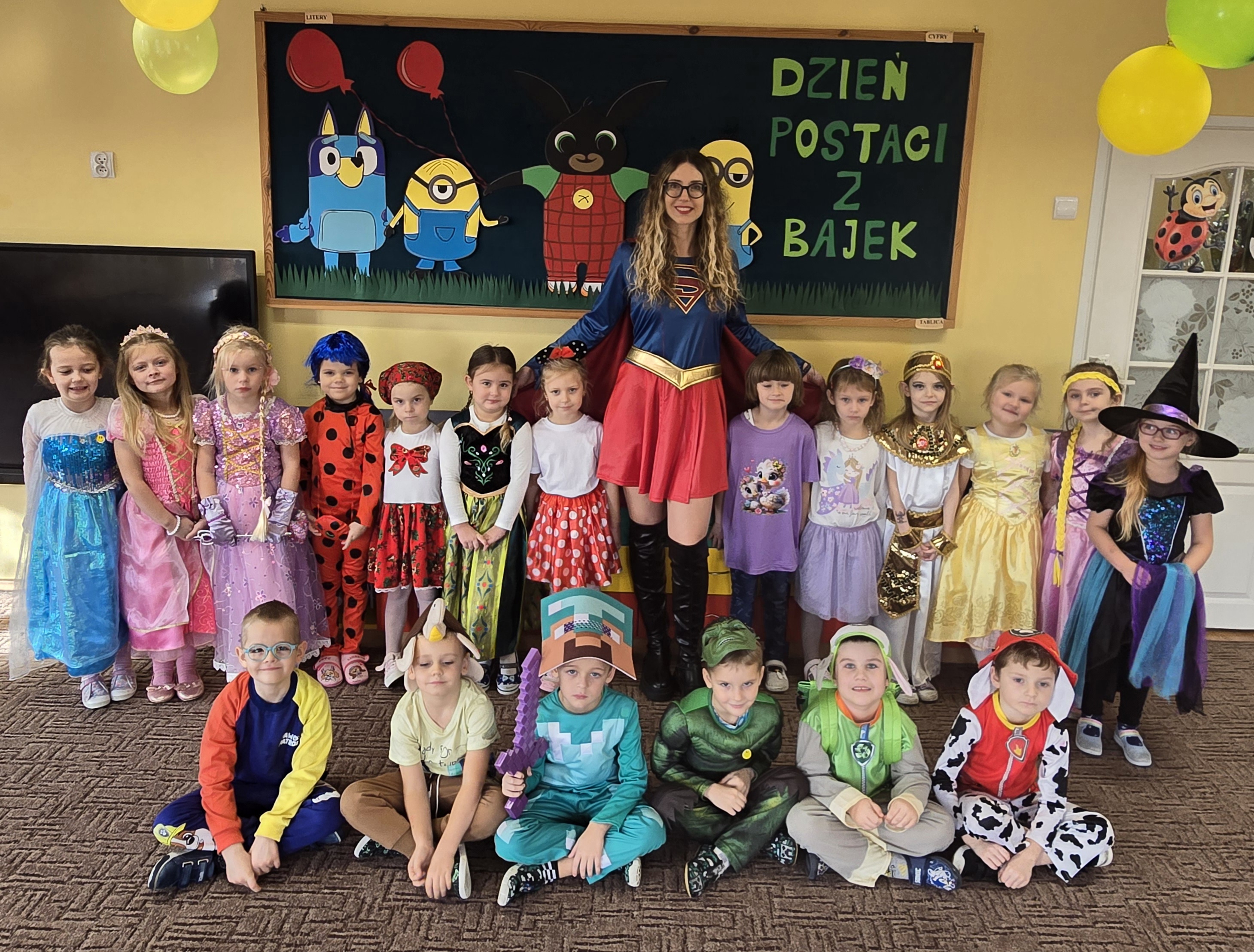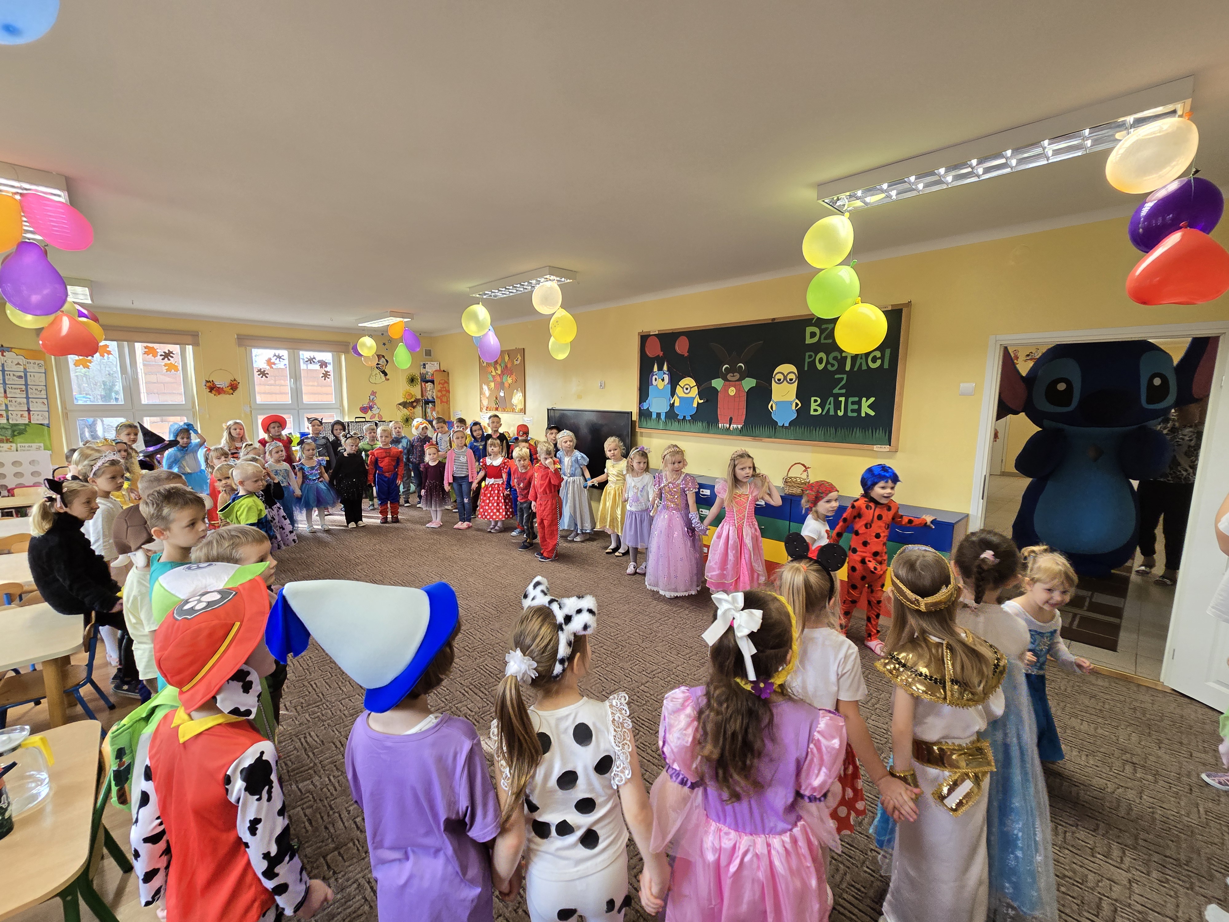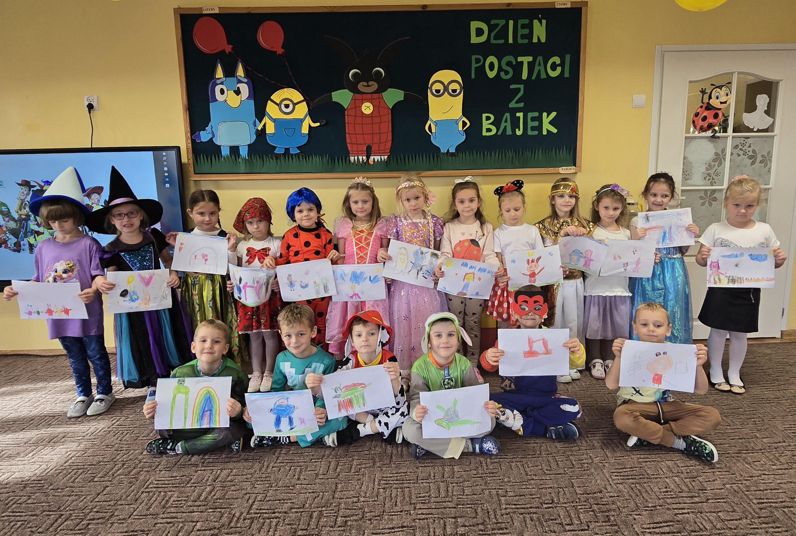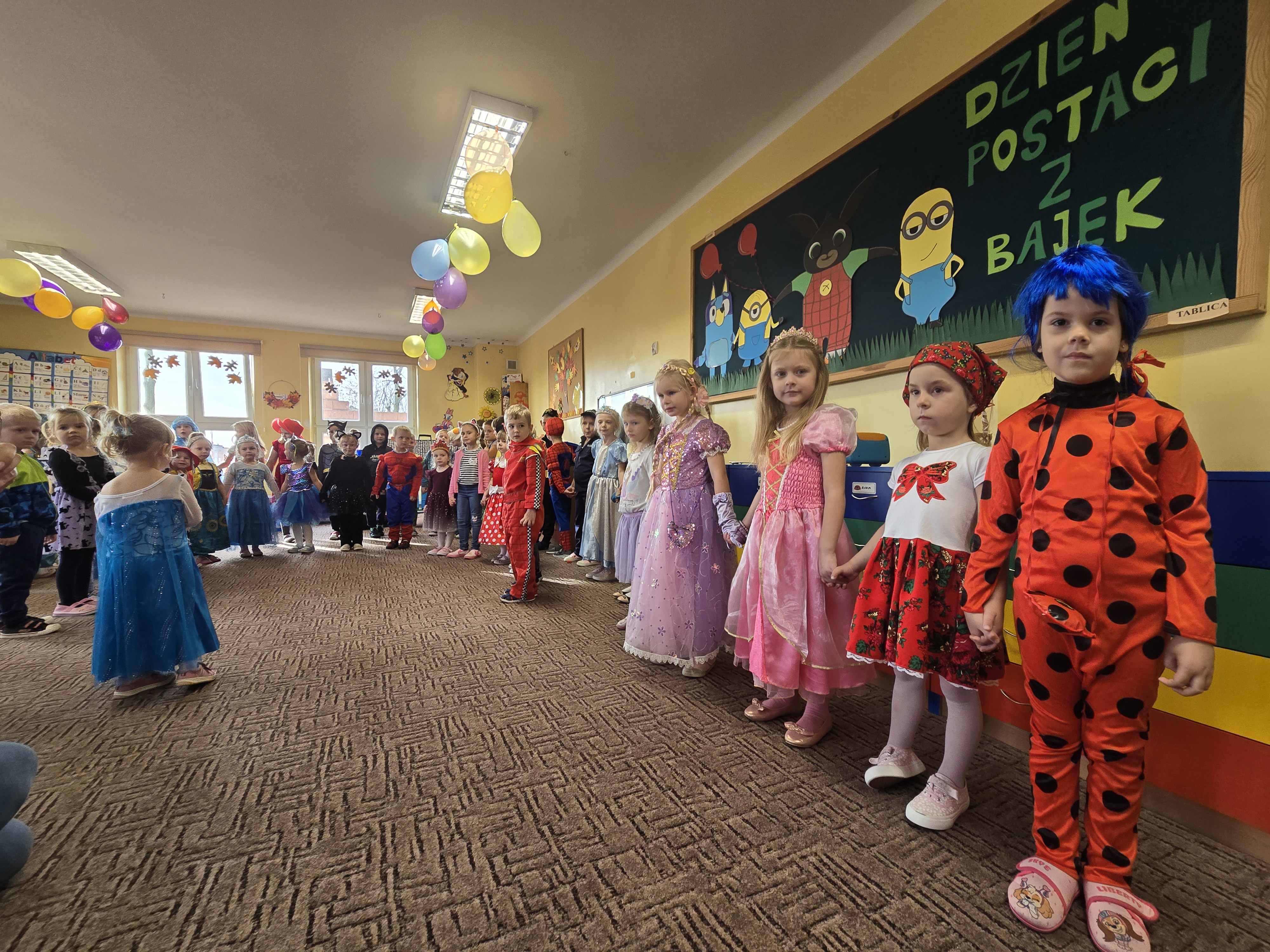 Do przedszkola dzieci przyszły przebrane w piękne bajkowe stroje. Rozwiązywały bajkowe zagadki i wykonywały bajkowe zadania. Były muzyczne zabawy ruchowe oraz prezentacje dziecięcych przebrań. Wykonały prace plastyczne prezentujące ich ulubione postacie z bajek.