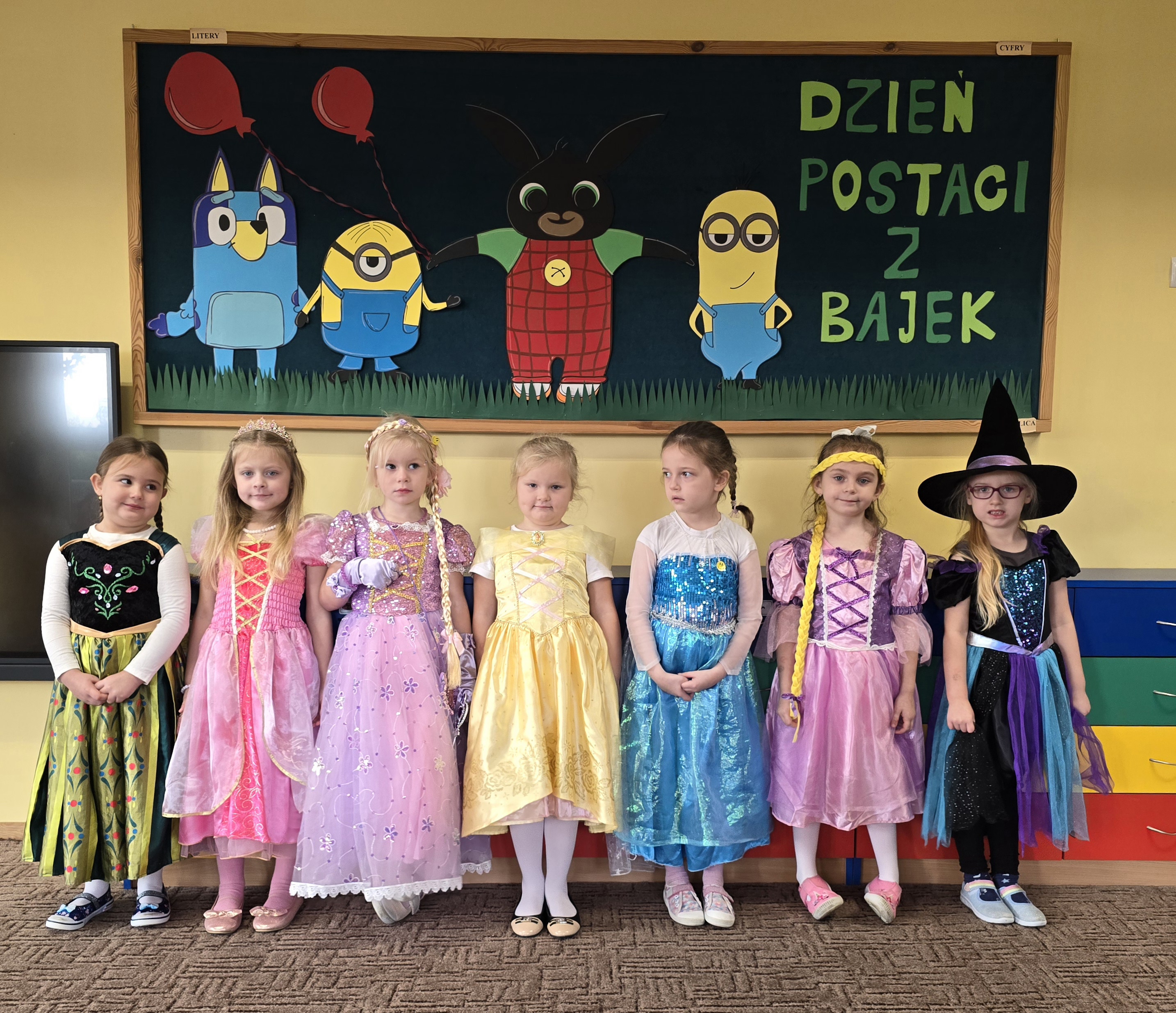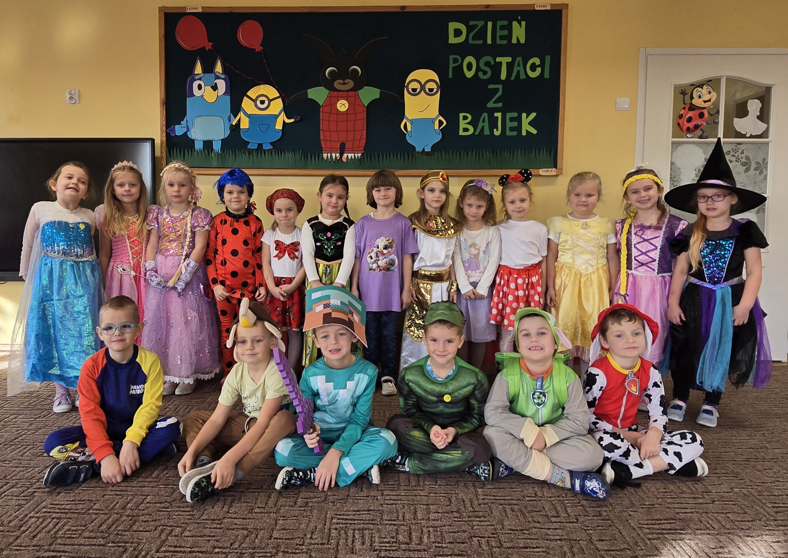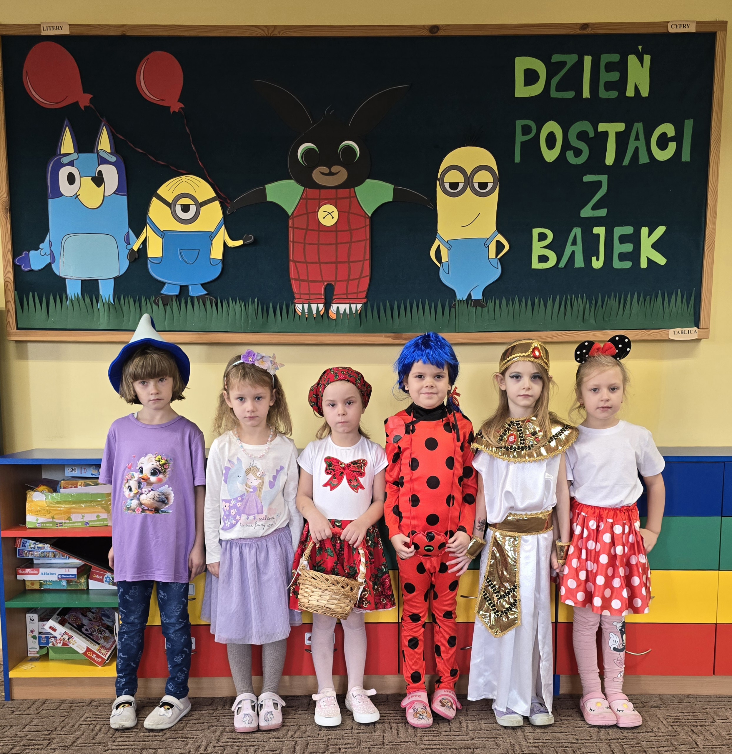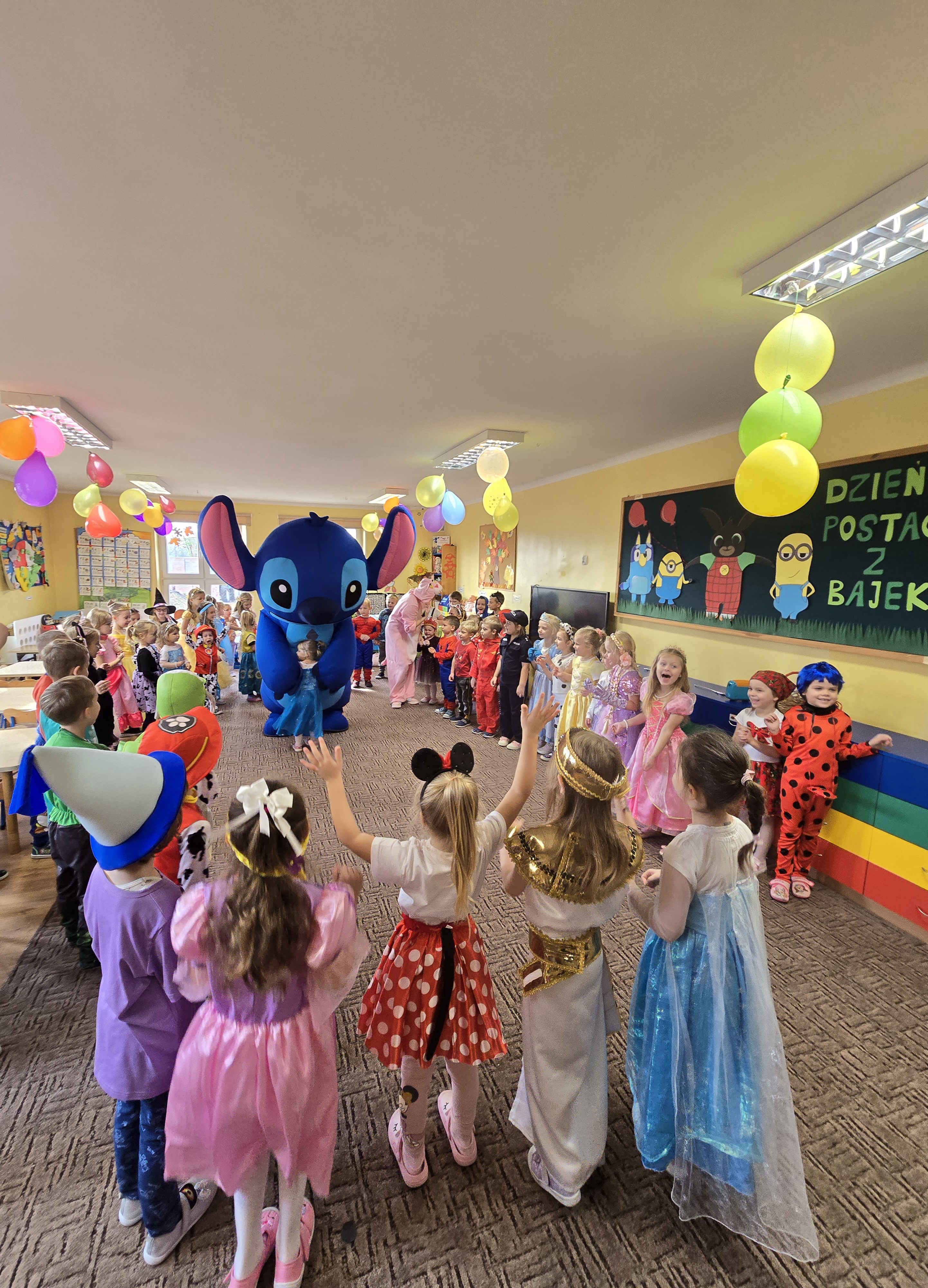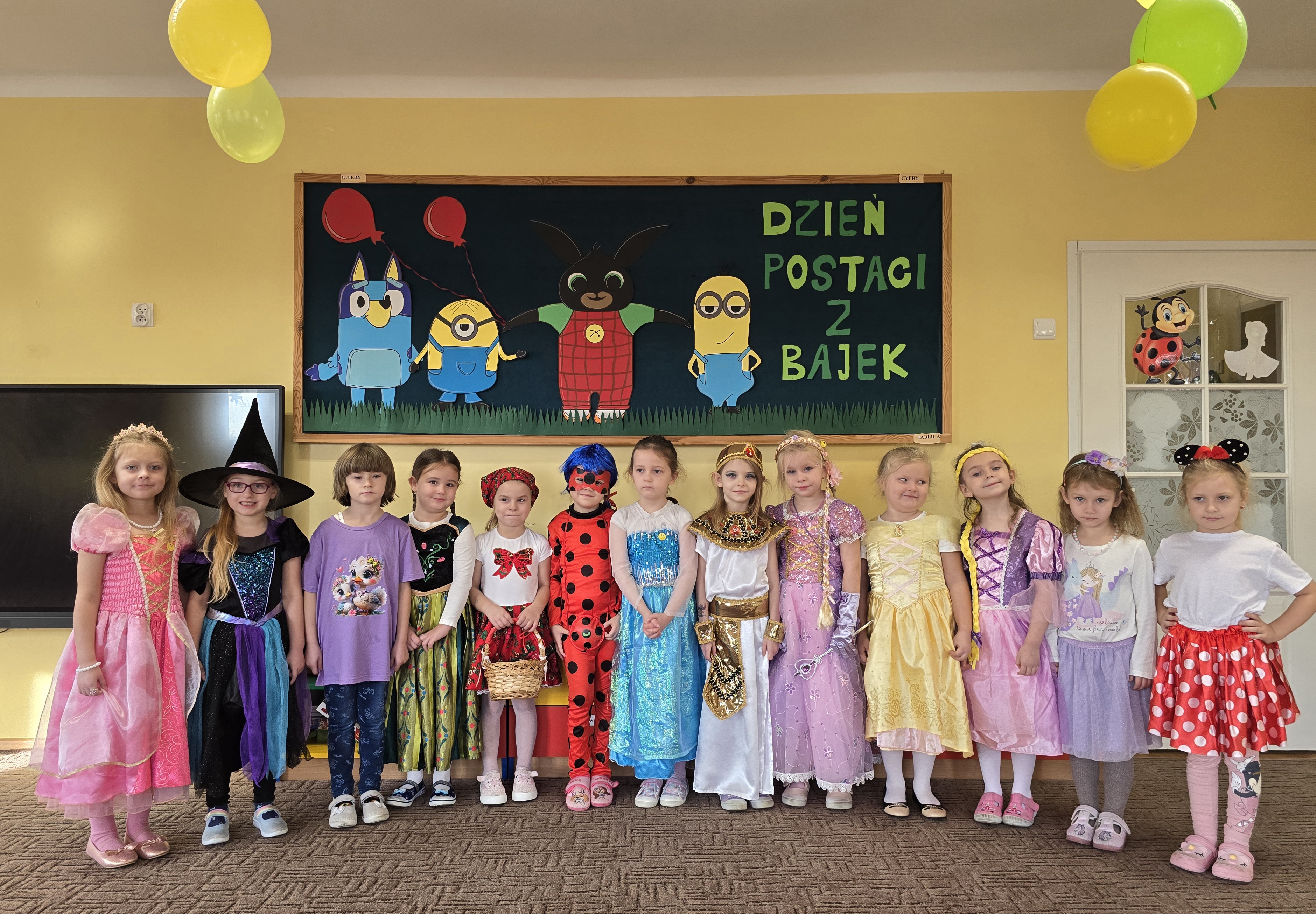 Do przedszkola dzieci przyszły przebrane w piękne bajkowe stroje. Rozwiązywały bajkowe zagadki i wykonywały bajkowe zadania. Były muzyczne zabawy ruchowe oraz prezentacje dziecięcych przebrań. Wykonały prace plastyczne prezentujące ich ulubione postacie z bajek.