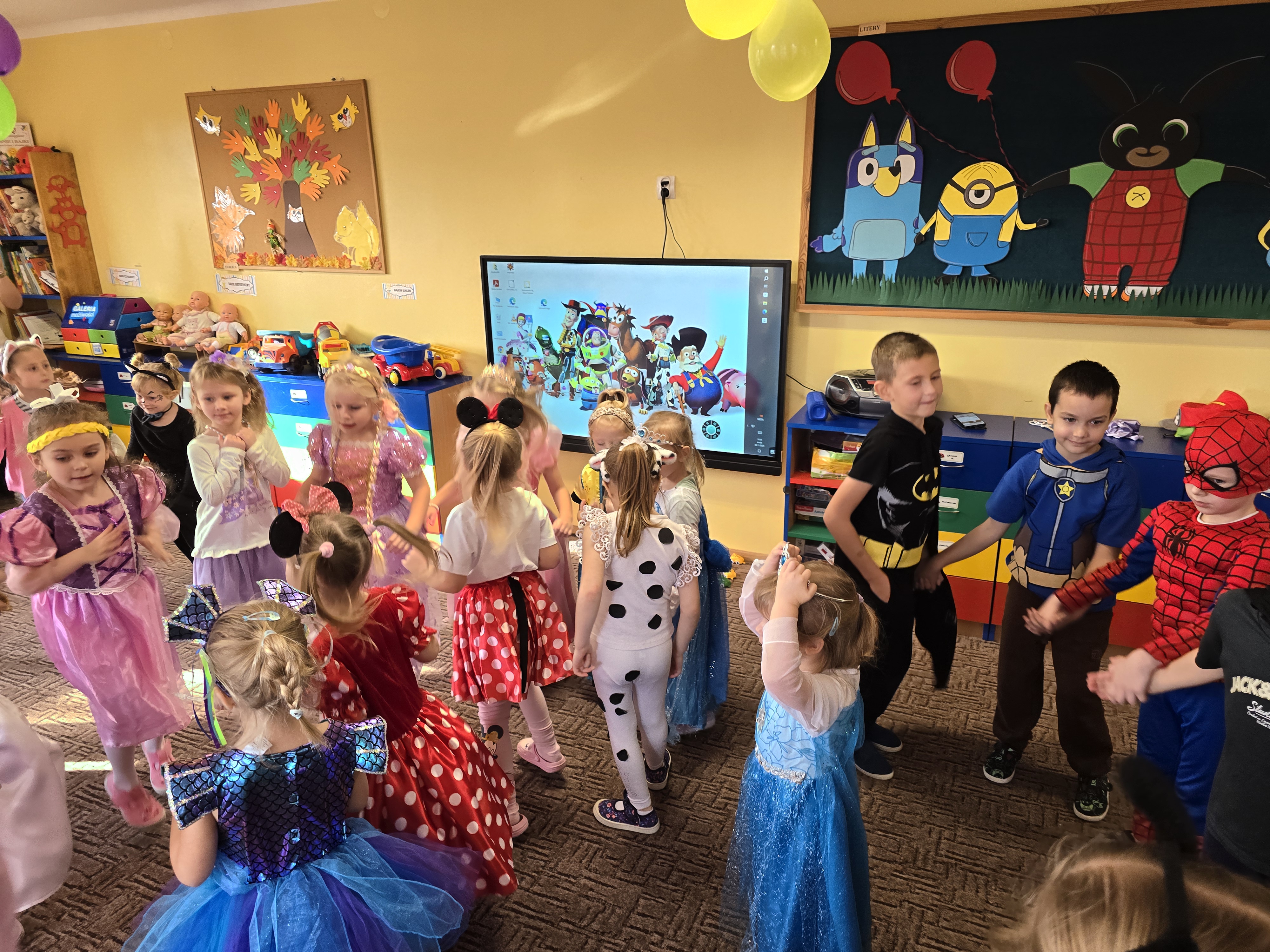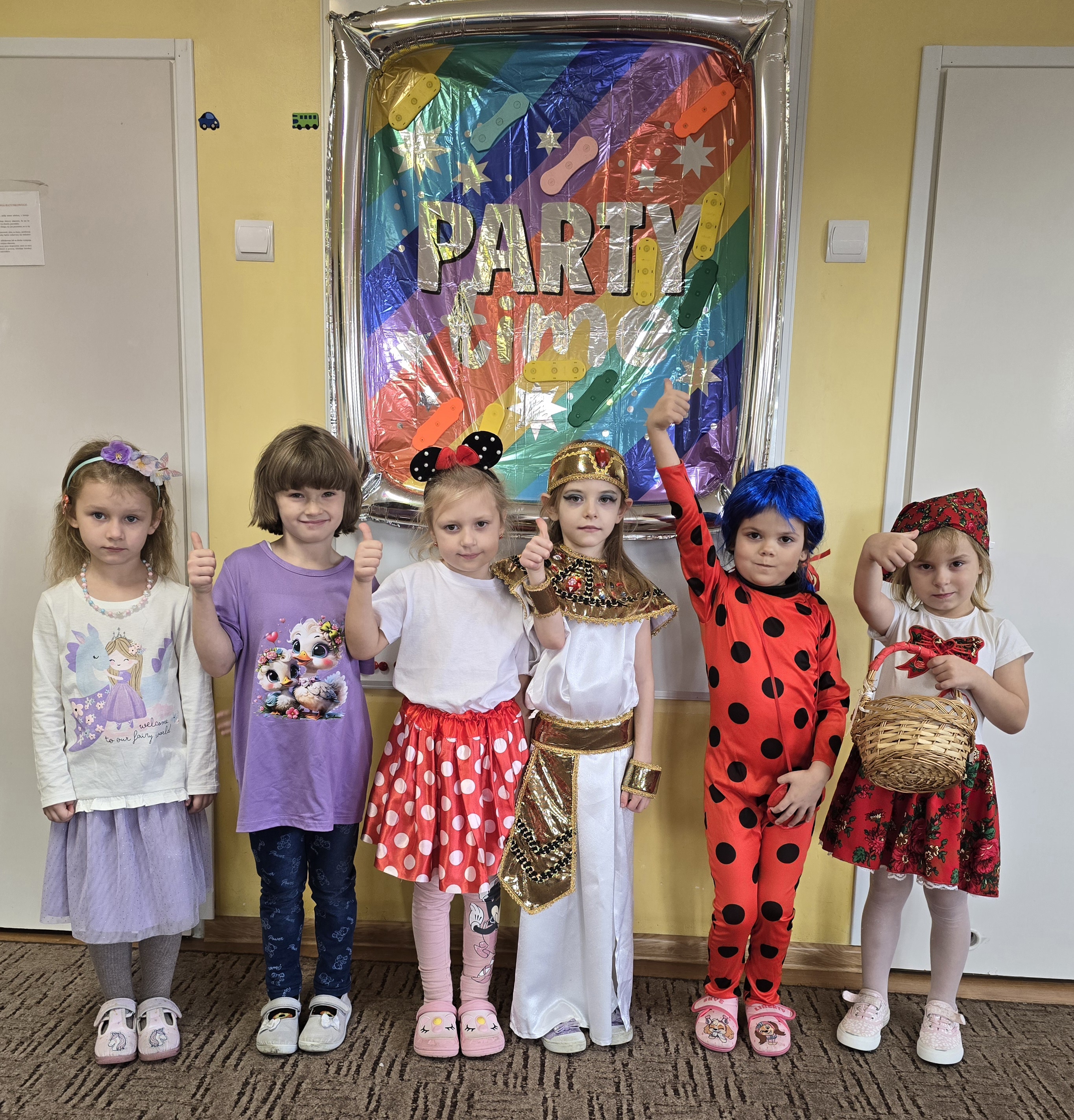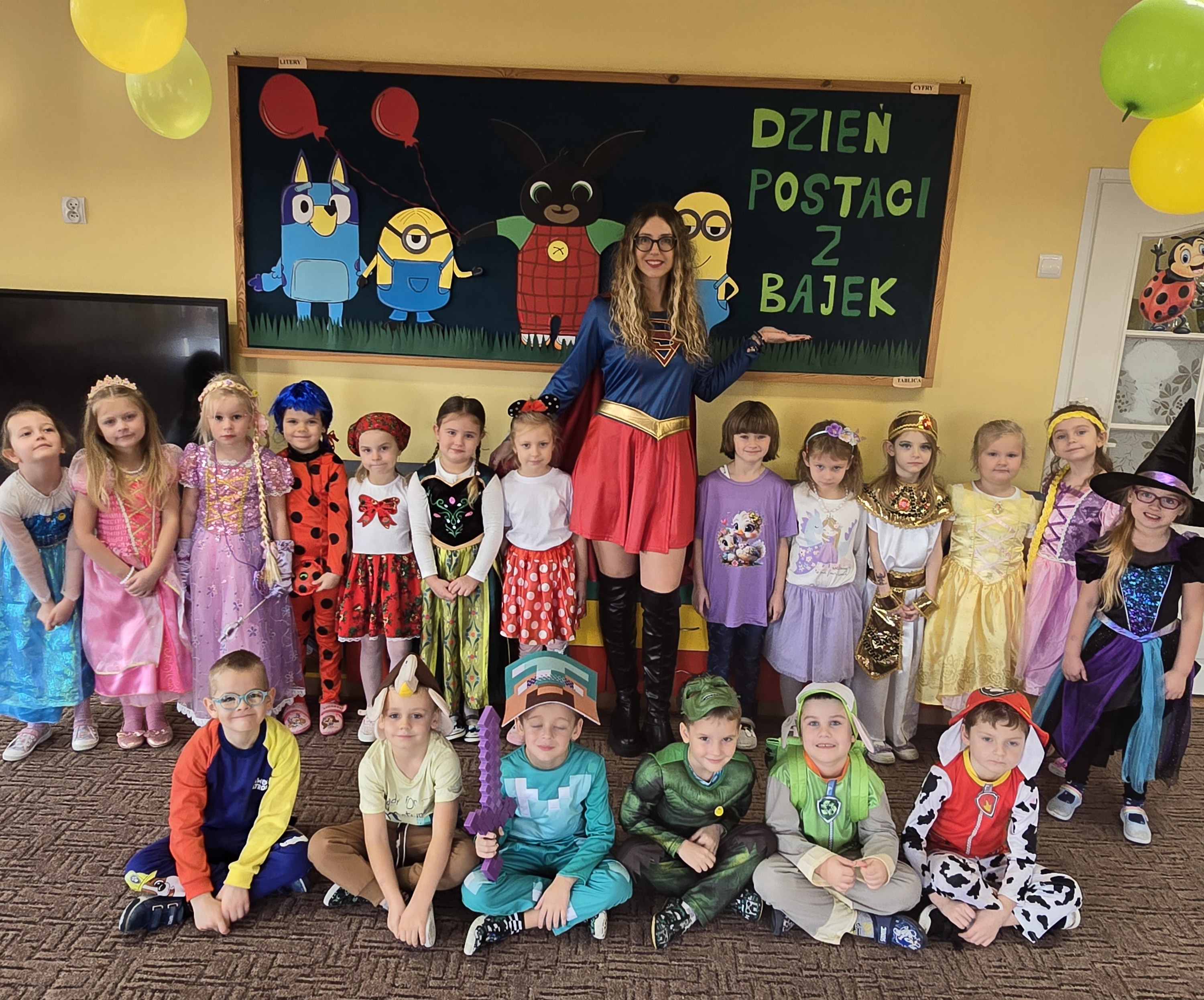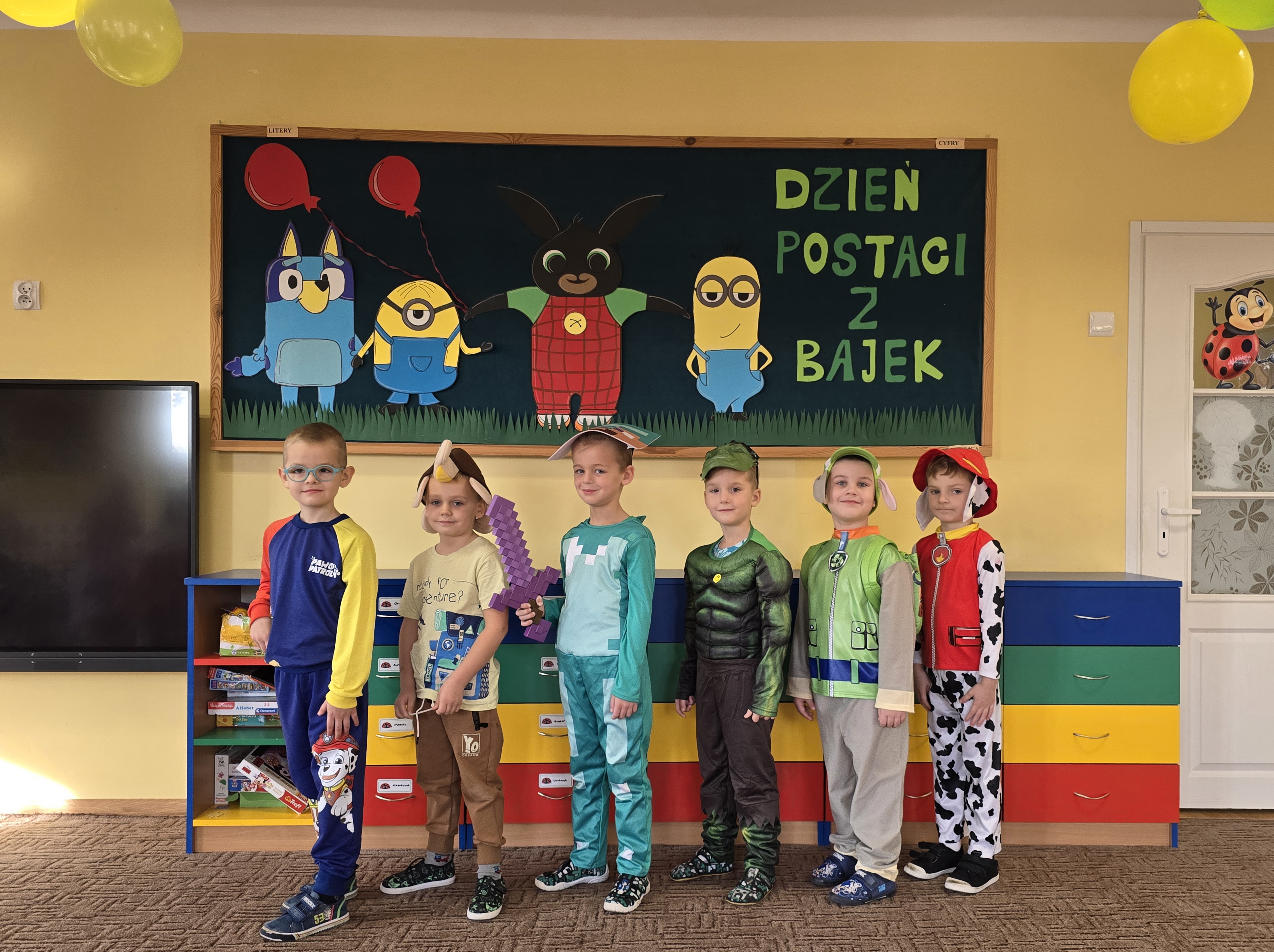 Do przedszkola dzieci przyszły przebrane w piękne bajkowe stroje. Rozwiązywały bajkowe zagadki i wykonywały bajkowe zadania. Były muzyczne zabawy ruchowe oraz prezentacje dziecięcych przebrań. Wykonały prace plastyczne prezentujące ich ulubione postacie z bajek.