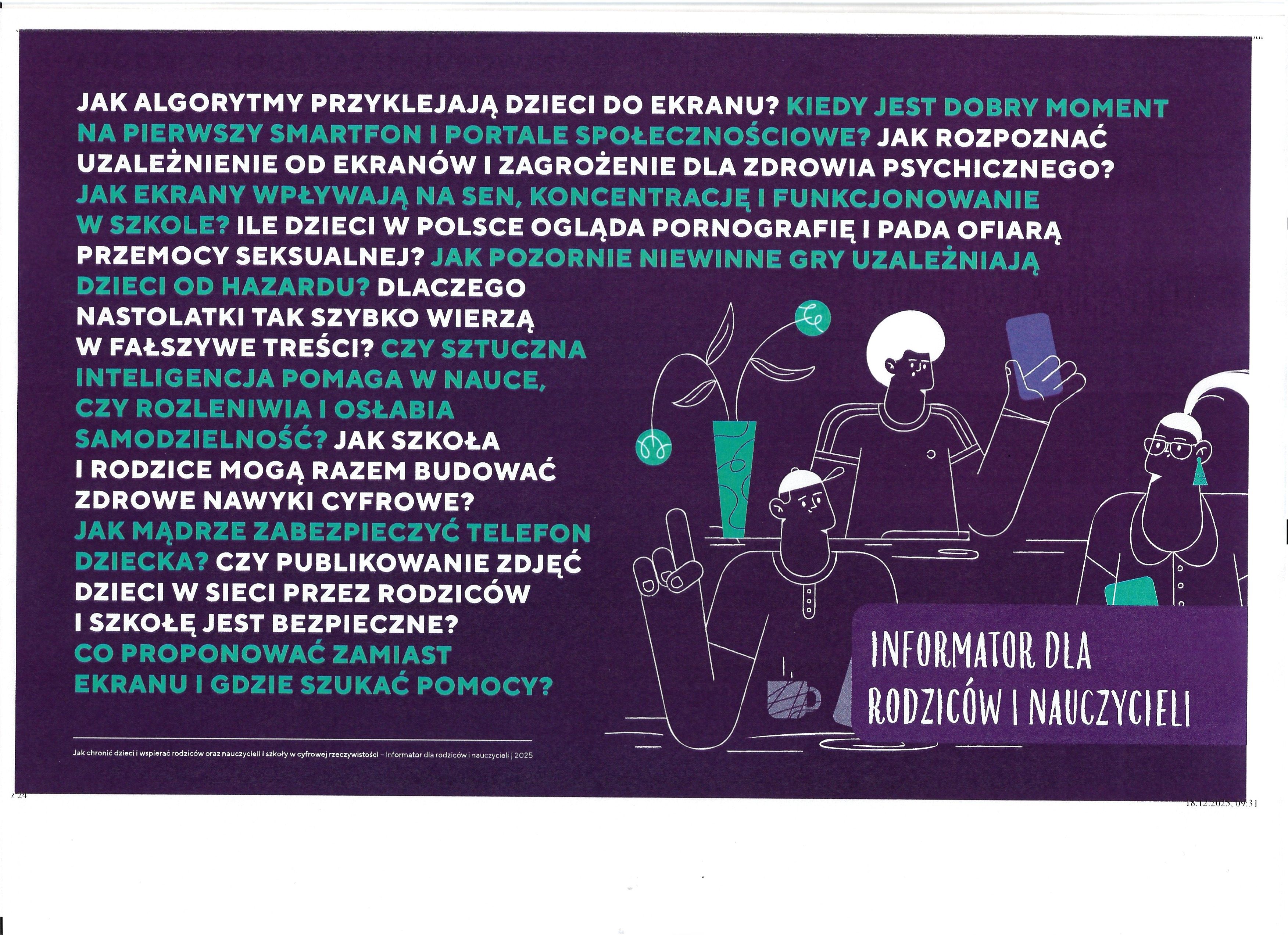 Informator ma charakter praktycznego wsparcia dla nauczycieli i rodziców. W przystępnej formie łączy aktualną wiedzę naukową z konkretnymi rekomendacjami, pomagając rozpoznawać zagrożenia, prowadzić rozmowy z uczniami oraz budować bezpieczne i zdrowe nawyki cyfrowe w środowisku szkolnym i domowym.