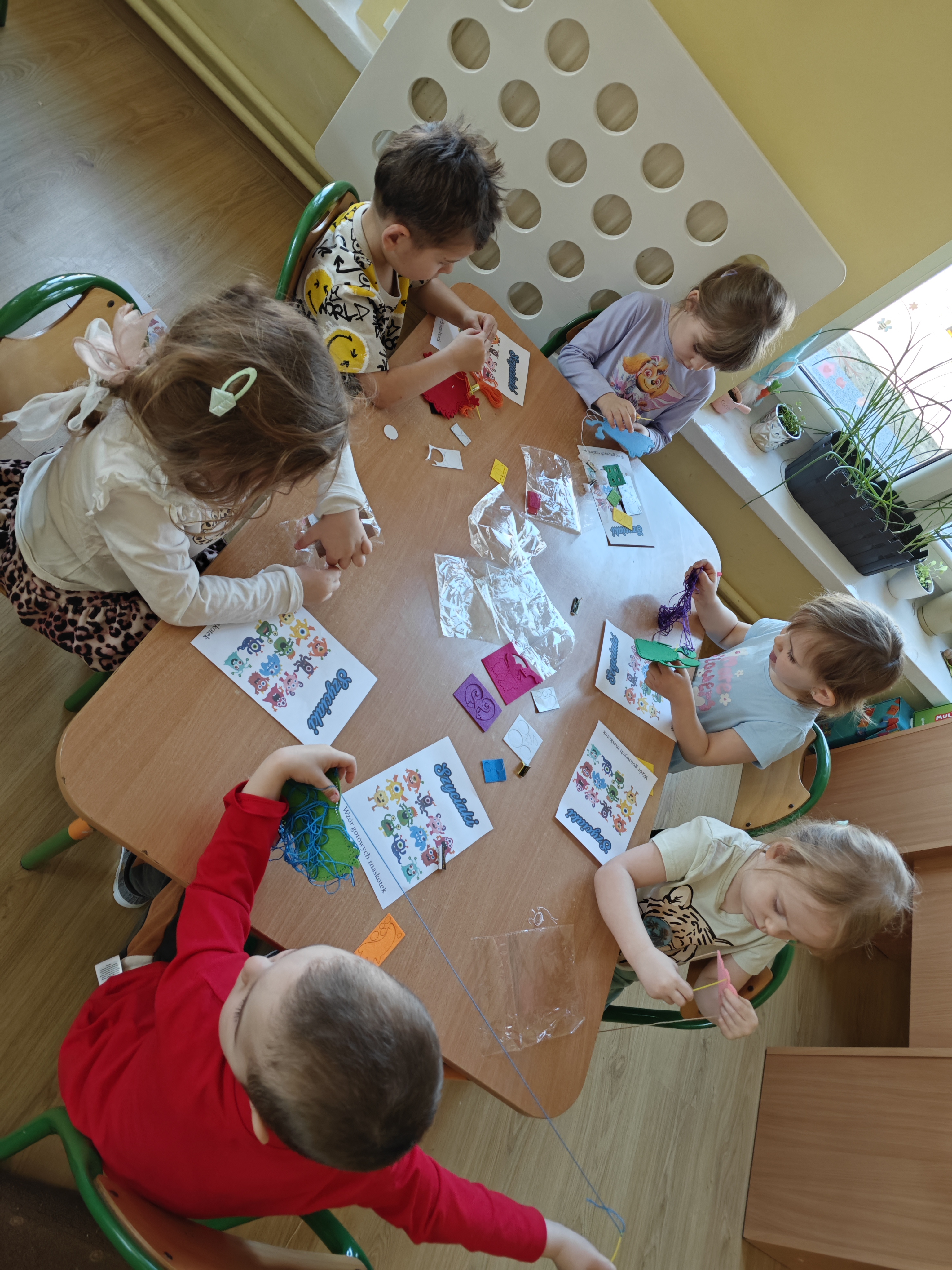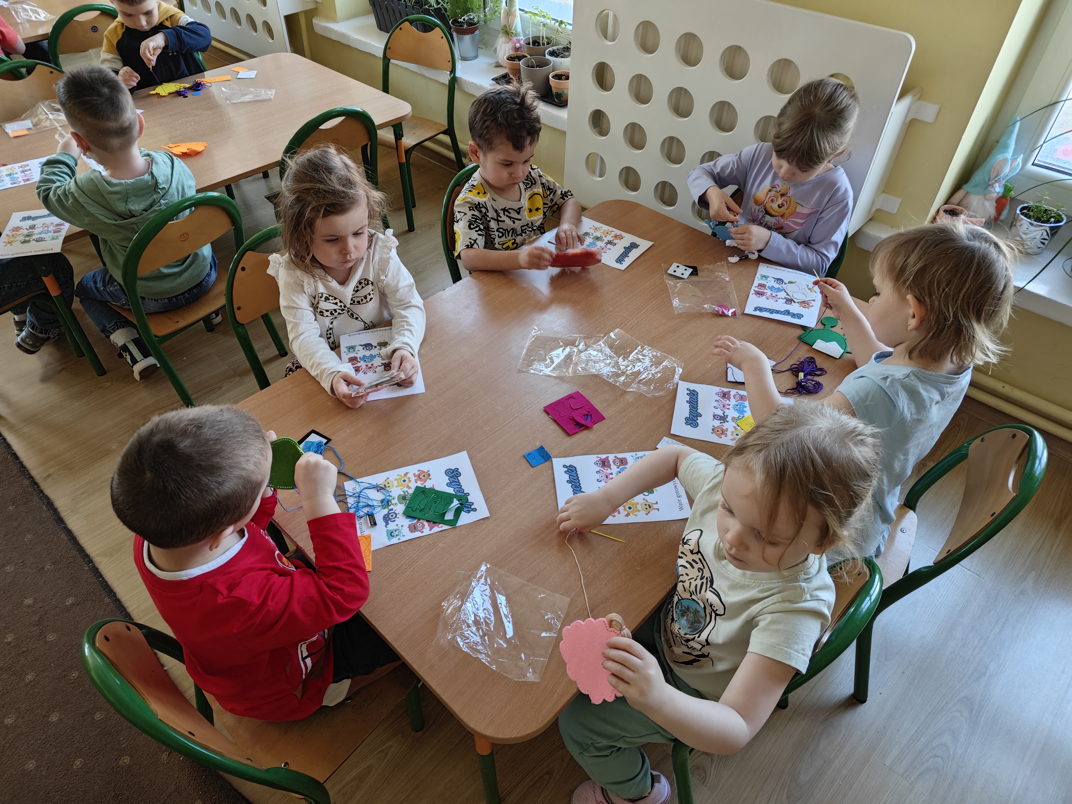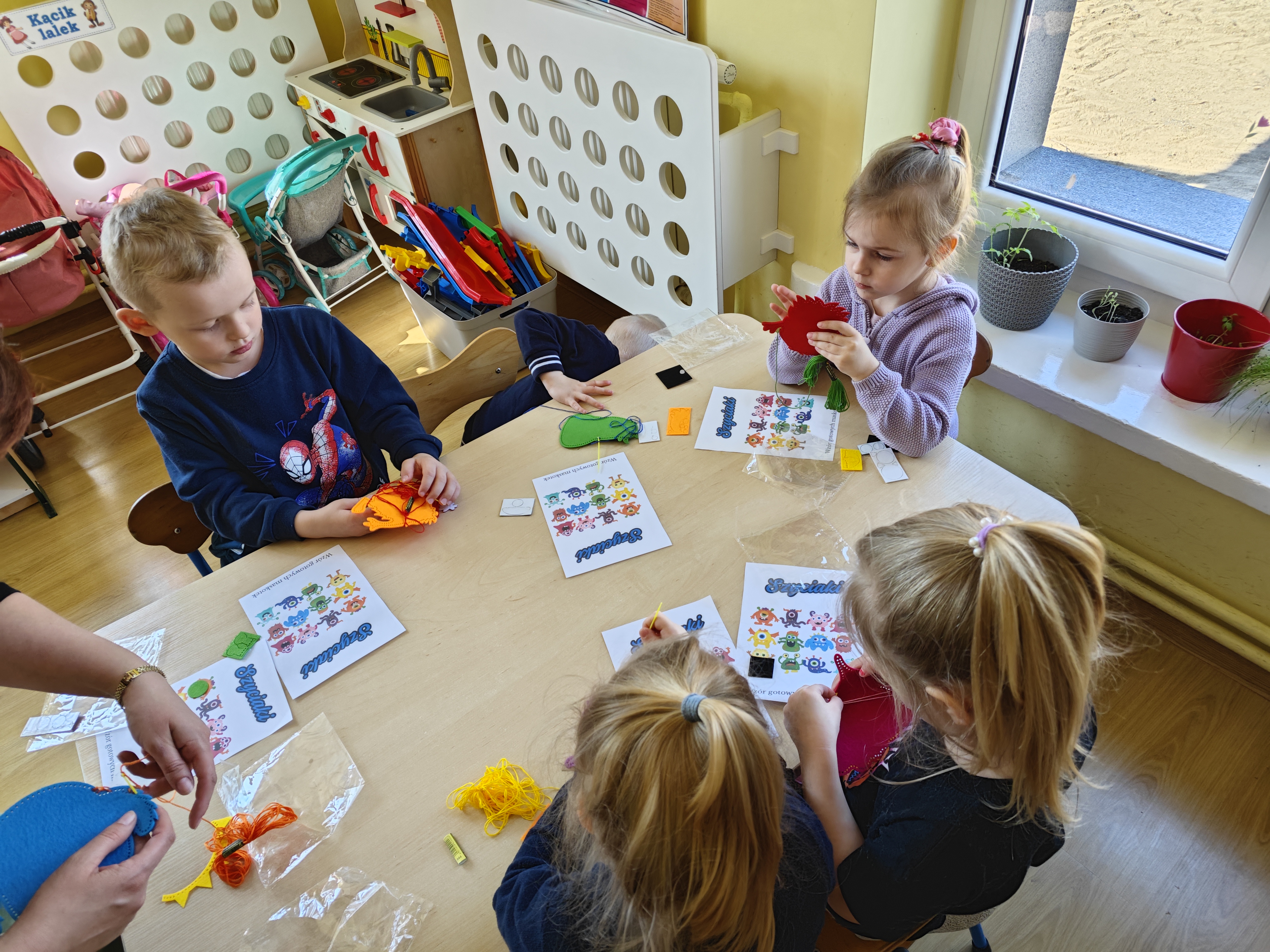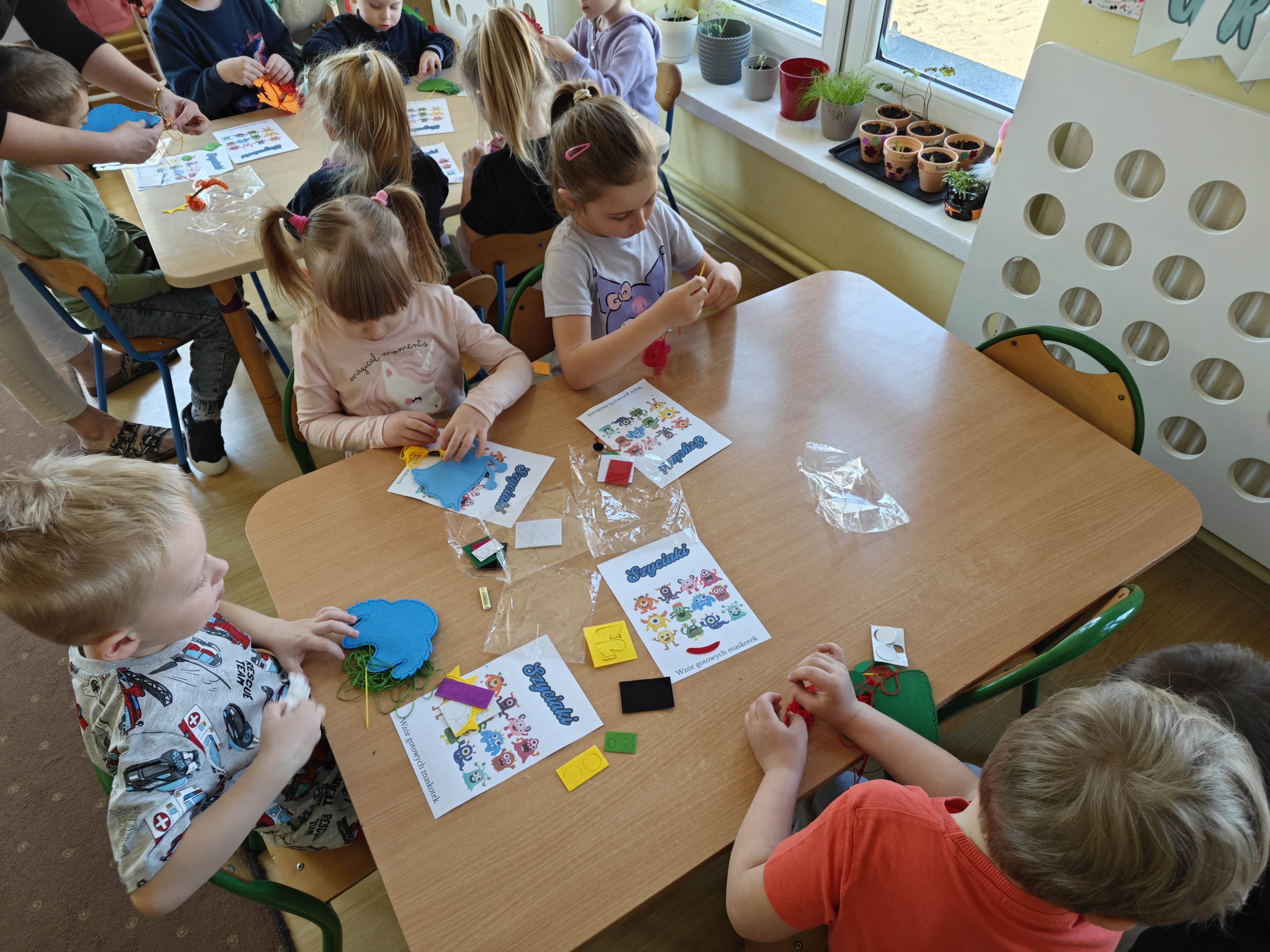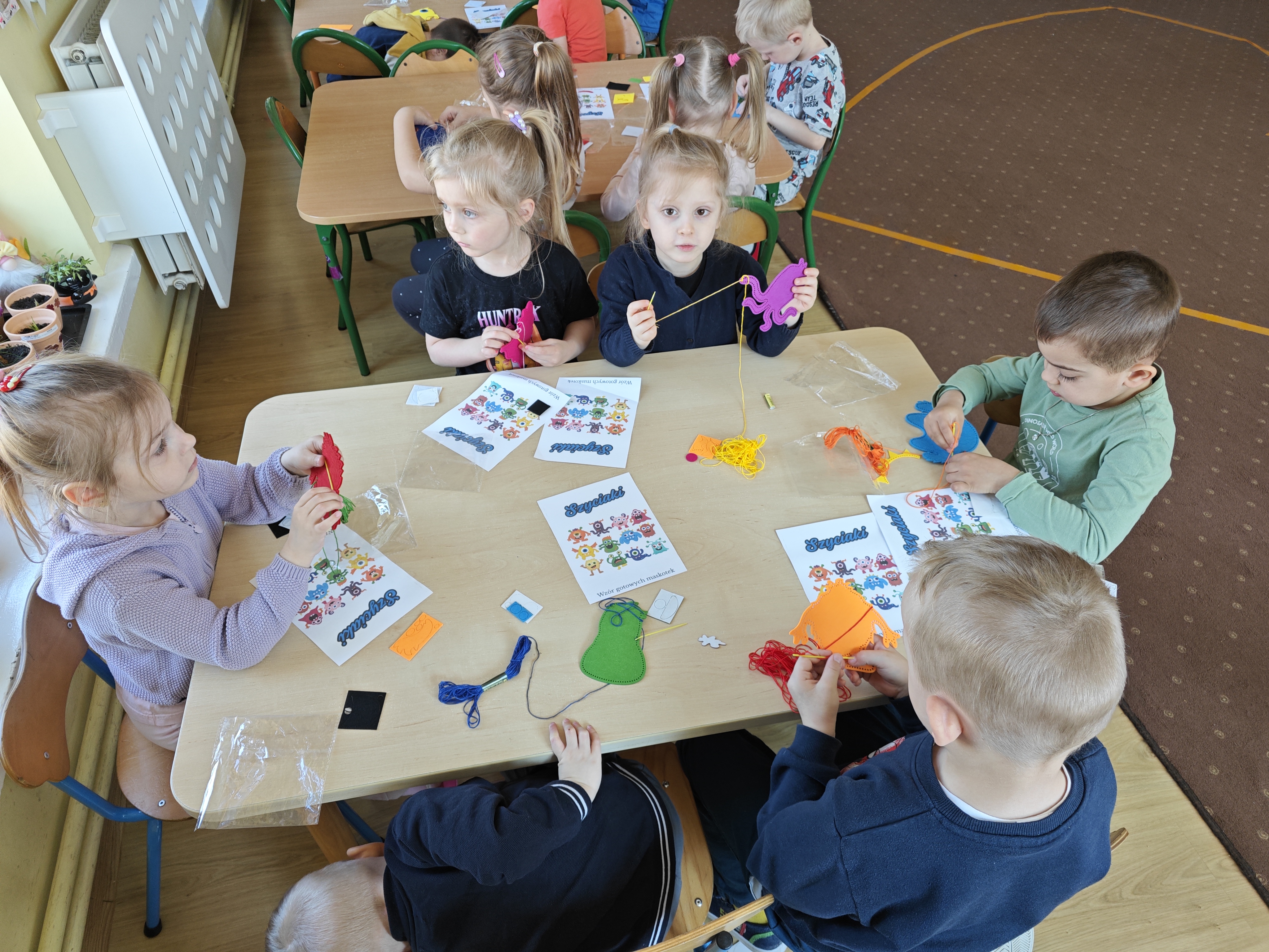 Kolejnym etapem było praktyczne szycie. Dzieci otrzymały plastikowe igły, muline oraz filc. Okazało się, że szycie wcale nie jest takie proste.