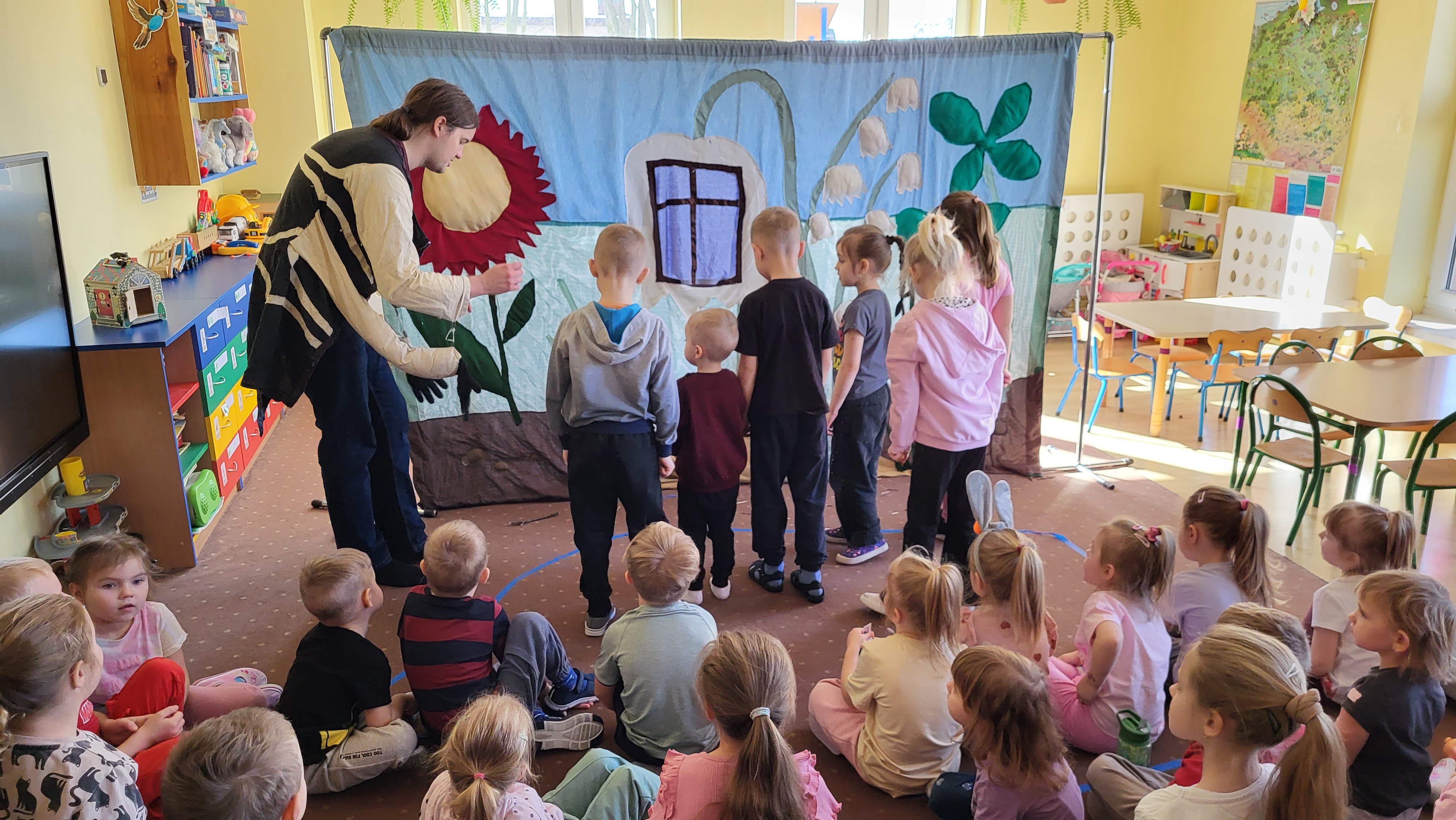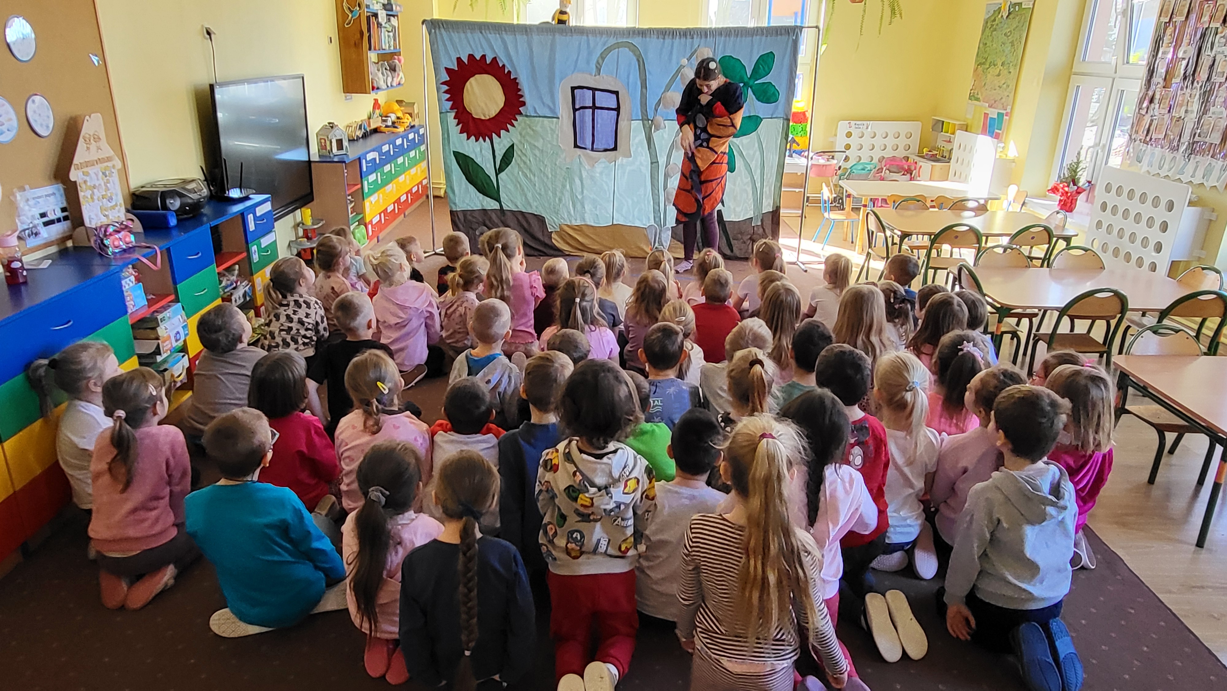 Teatrzyk był pełen humoru i zabawnych sytuacji. Została przedstawiona historia zwierzątek mieszkających na łące: leniwego motyla, pszczółki, konika polnego, pająka i mrówki. Dzieci podczas przedstawienia dowiedziały się, że nie liczy się piękny i atrakcyjny wygląd, lecz przede wszystkim dobre serce i chęć pomagania innym w potrzebie.