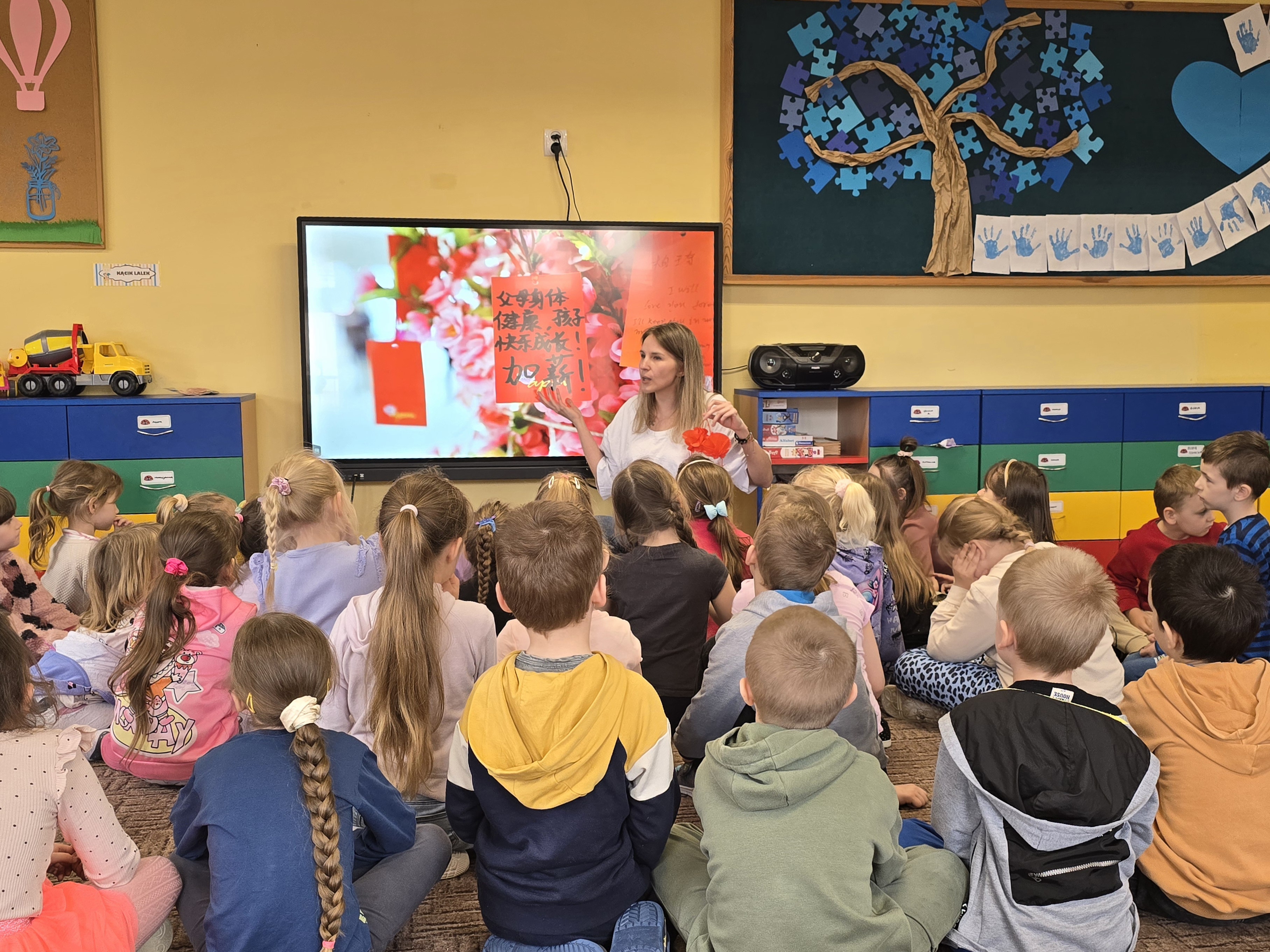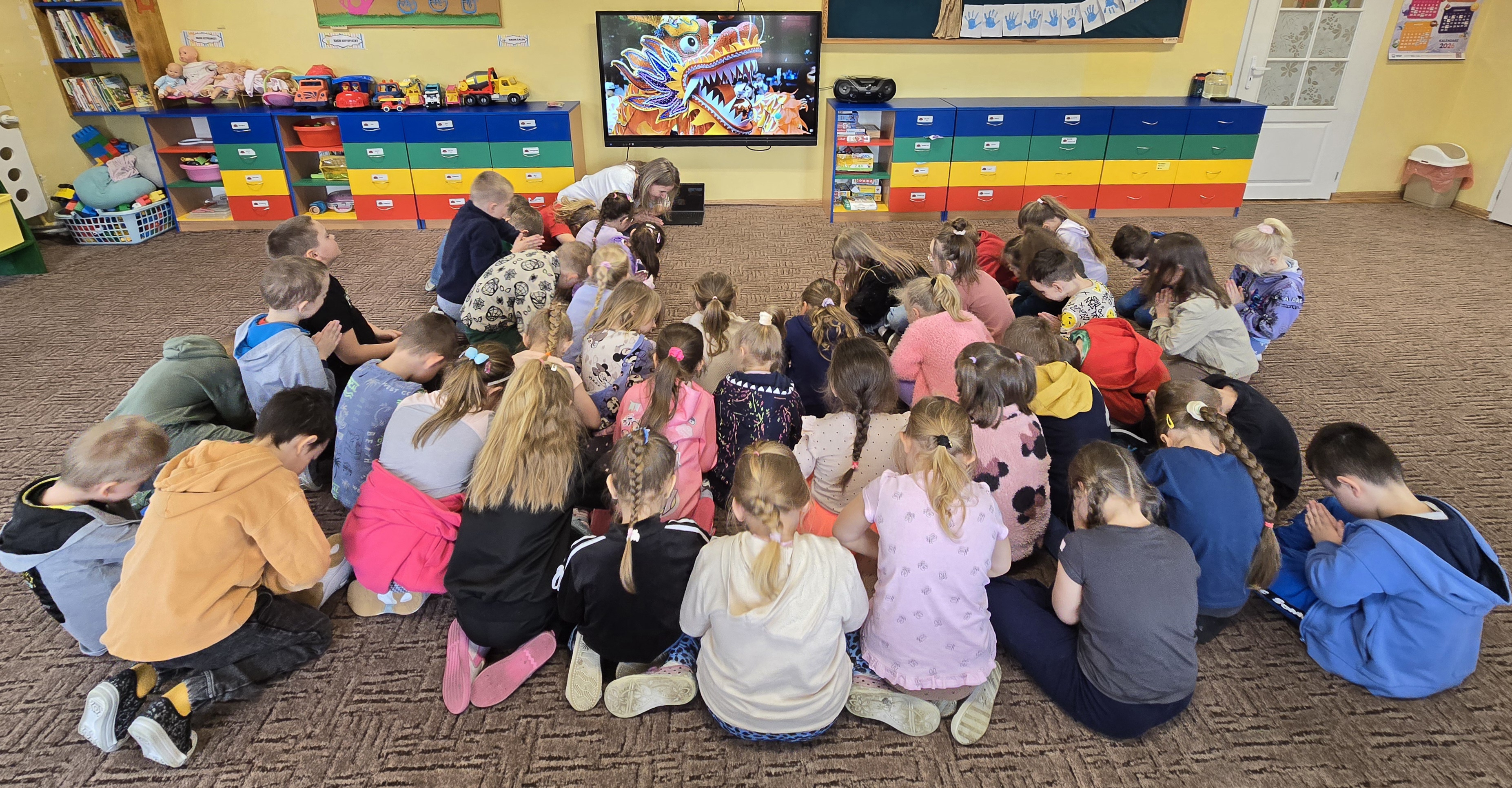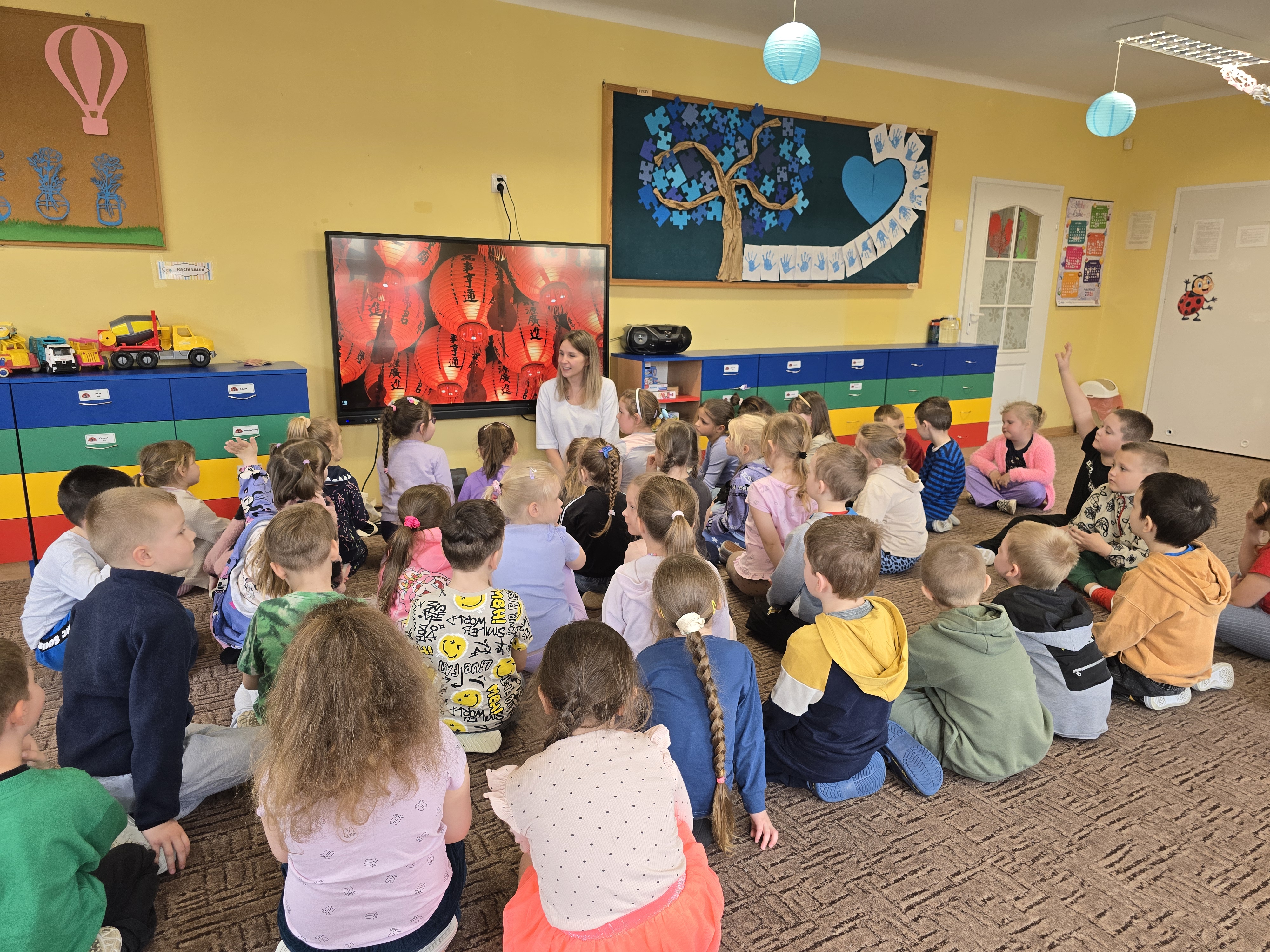 Na koniec, w nawiązaniu do chińskich tradycji, szczególnie podczas Święta Latarni lub Chińskiego Nowego Roku, dzieci narysowały lub zapisały na czerwonych karteczkach życzenia i umieściły je w pobliżu wizerunku Smoka. Ogromnie dziękujemy.
