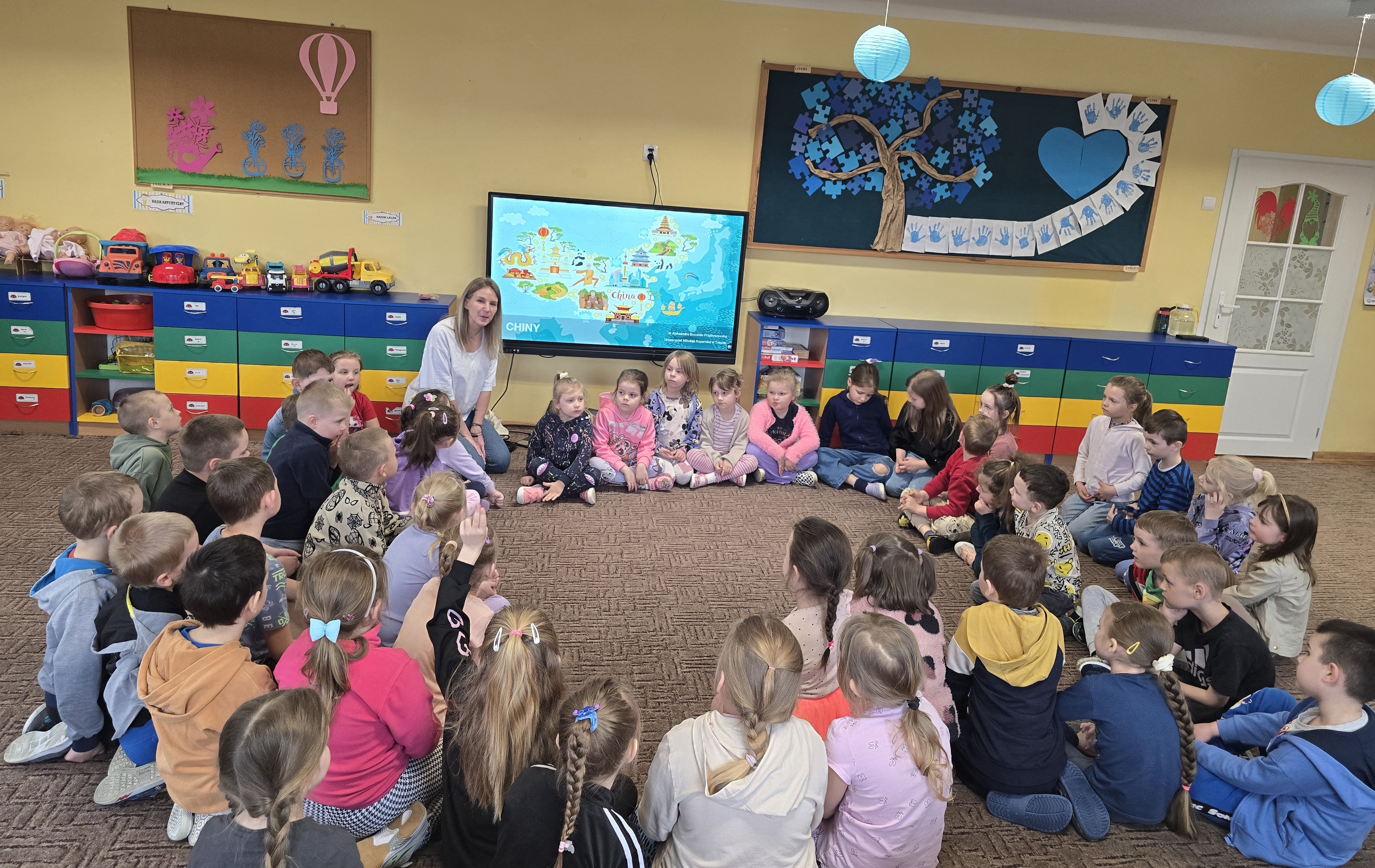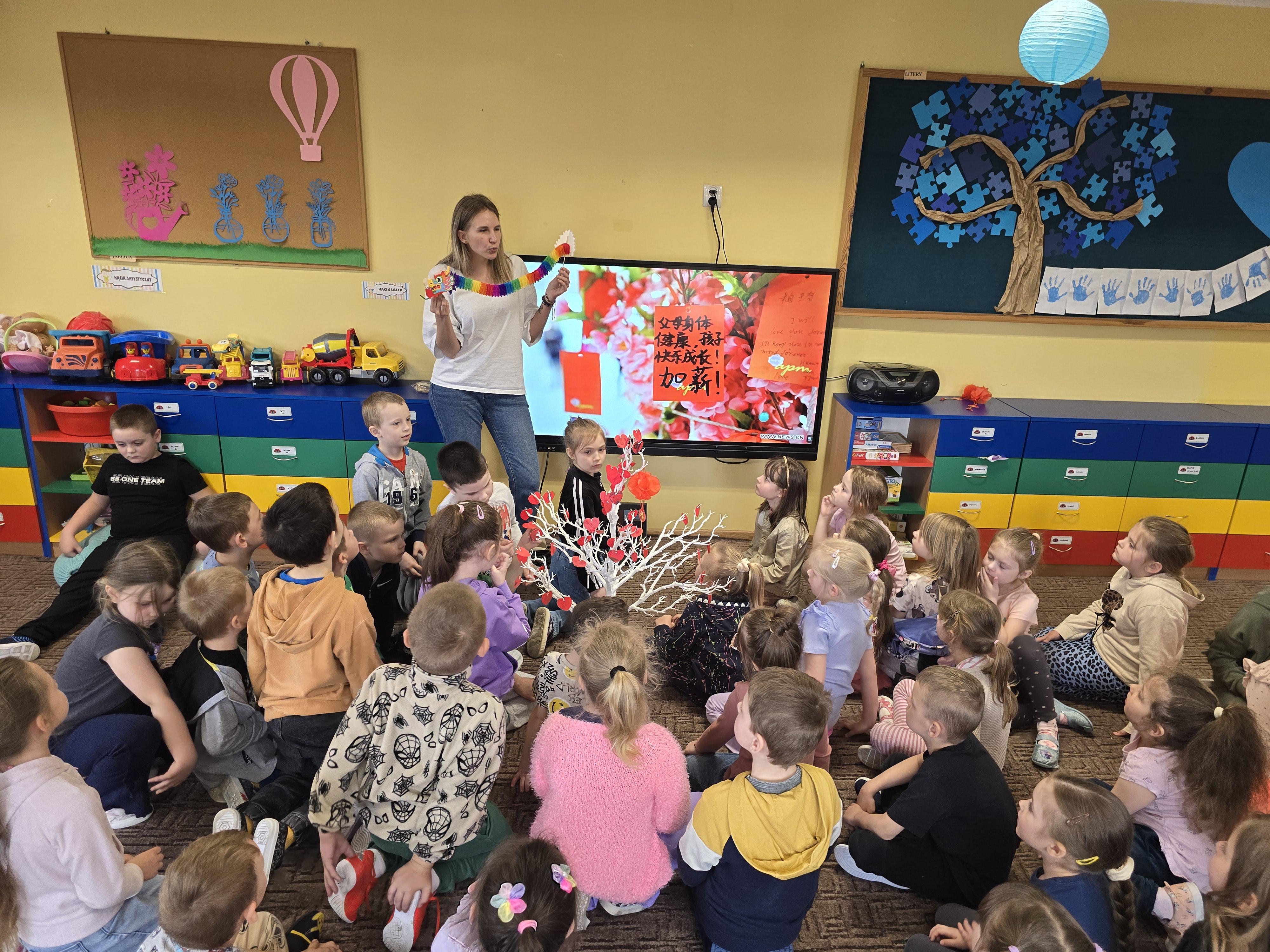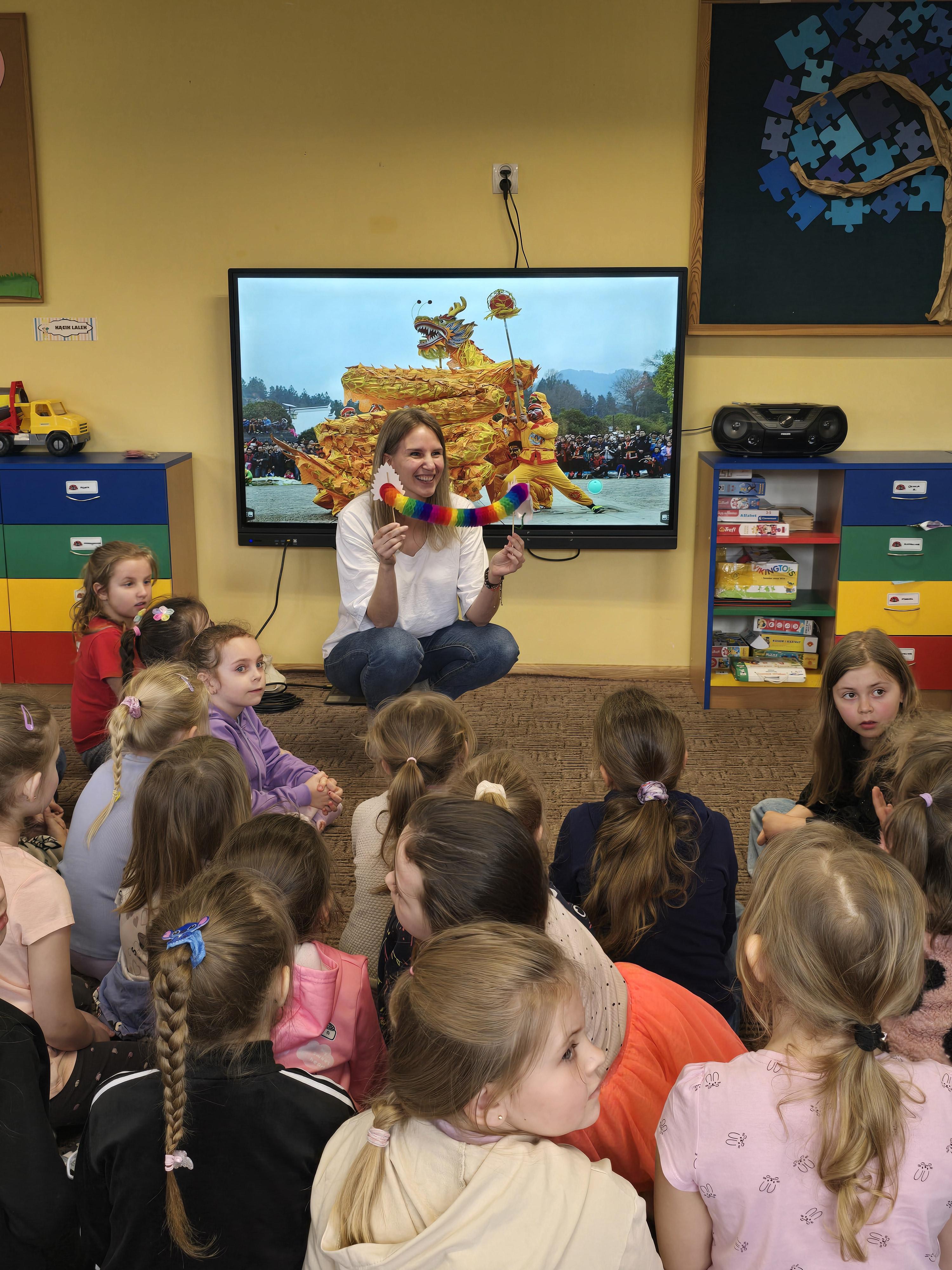 Nasze przedszkole odwiedziła Pani Aleksandra Brzostek-Przybyszewska, wykładowca jezyka chińskiego na UMK w Toruniu. Przybliżyła ona dzieciom historię i kulturę Chin, przedtawiła Postać Smoka oraz pismo chińskie, uważane za jeden z najstarszych systemów zapisu na świecie. Dzieci mogły też sprawności posługiwania się patyczkami.