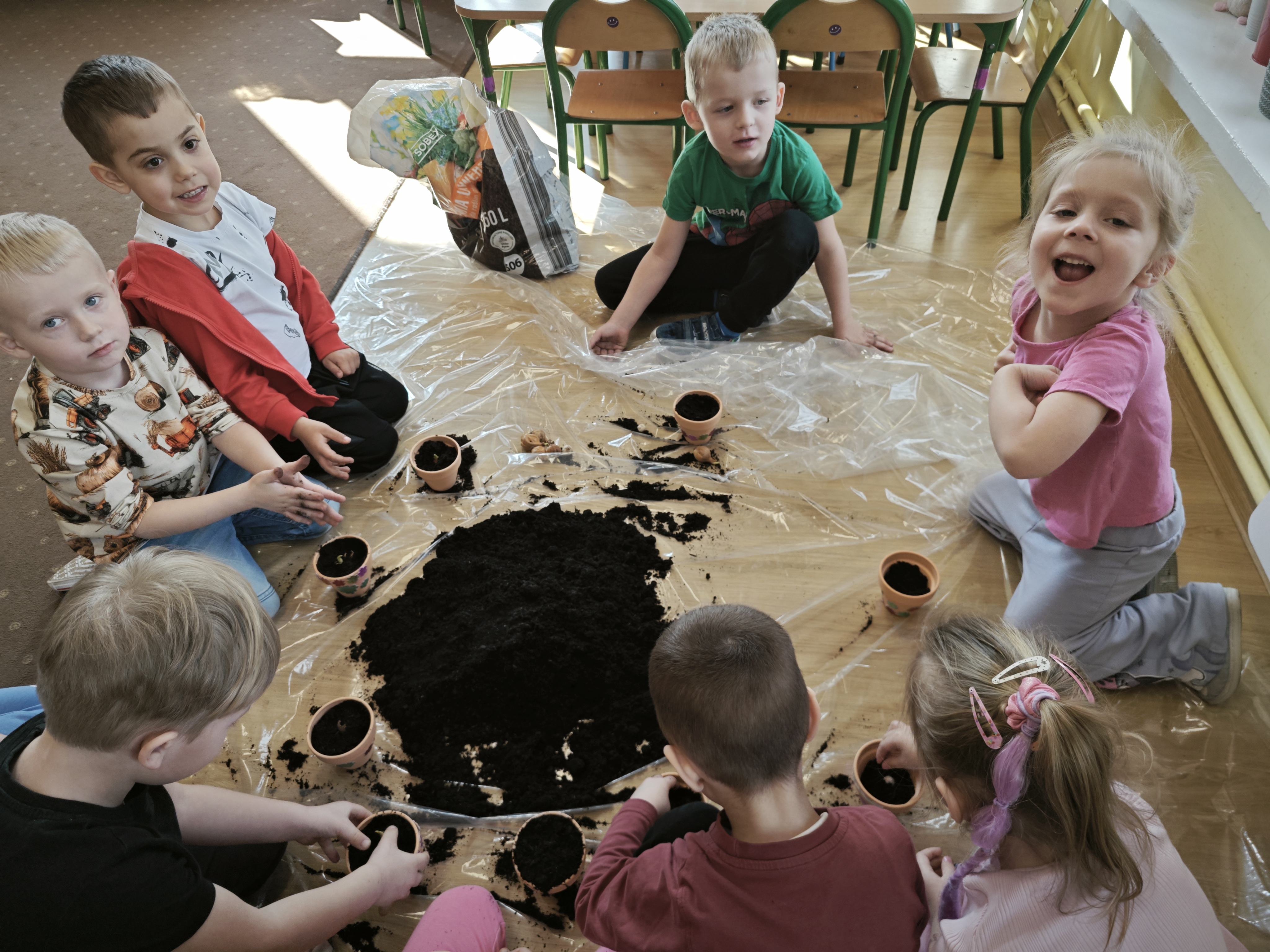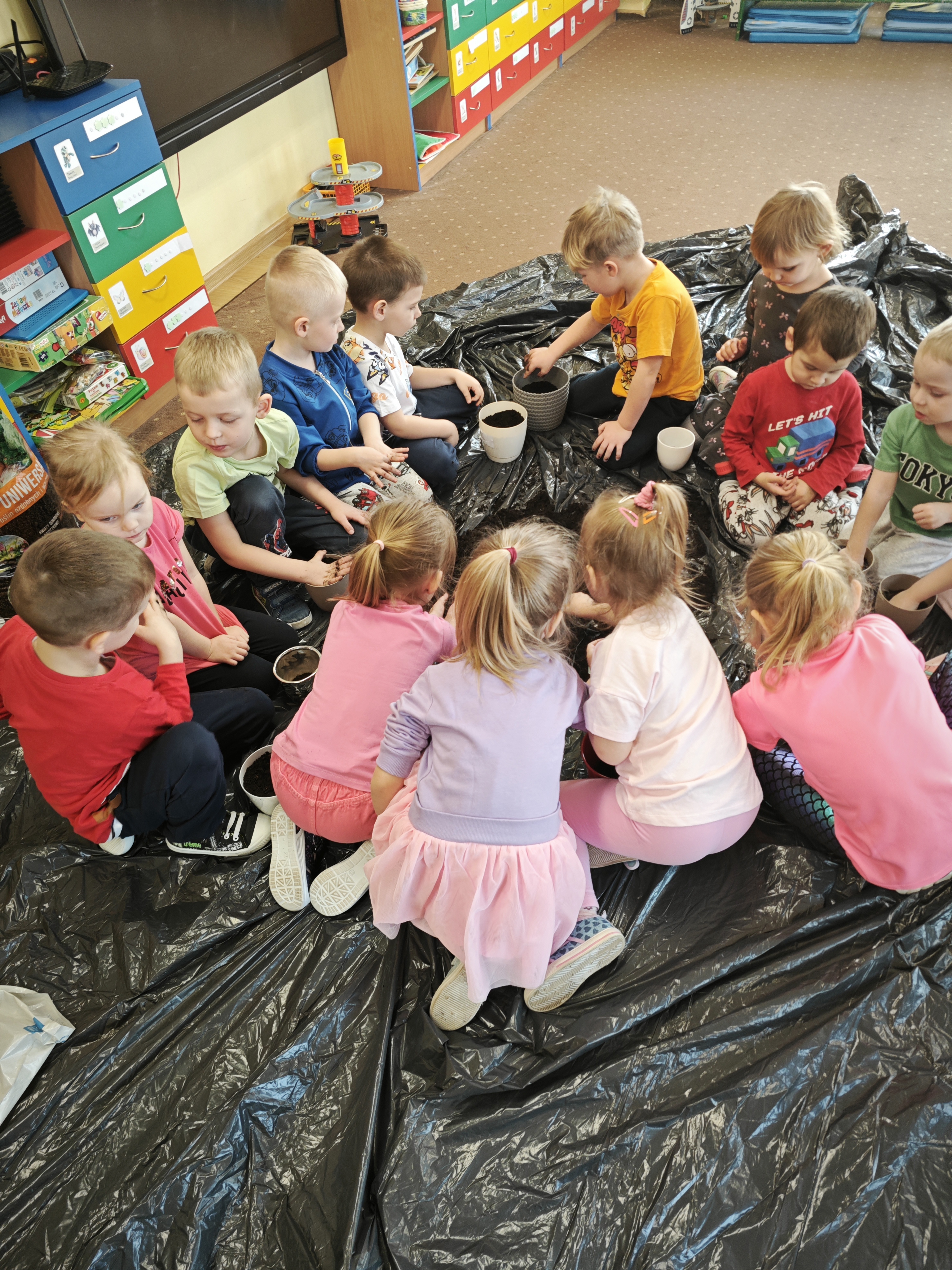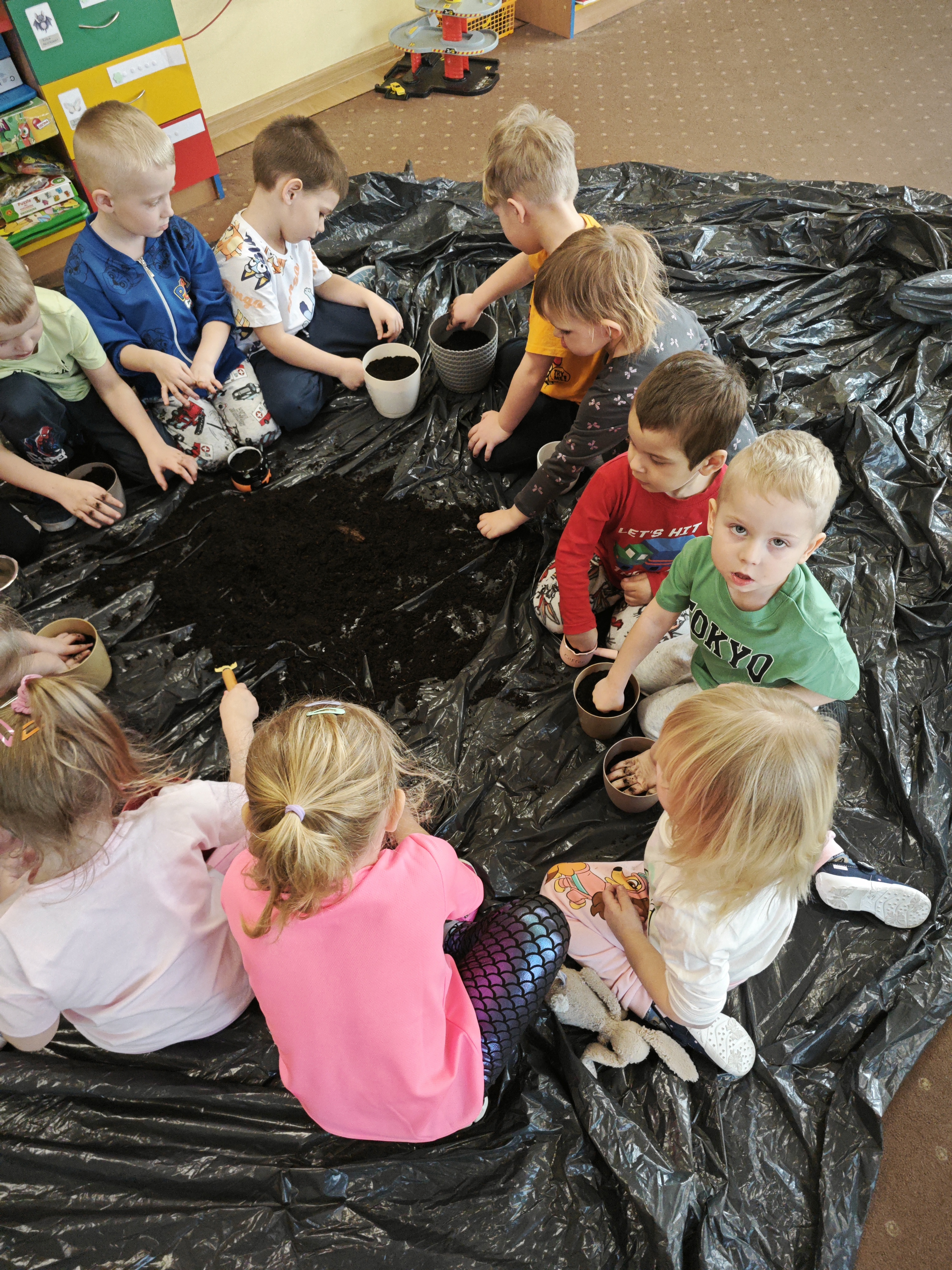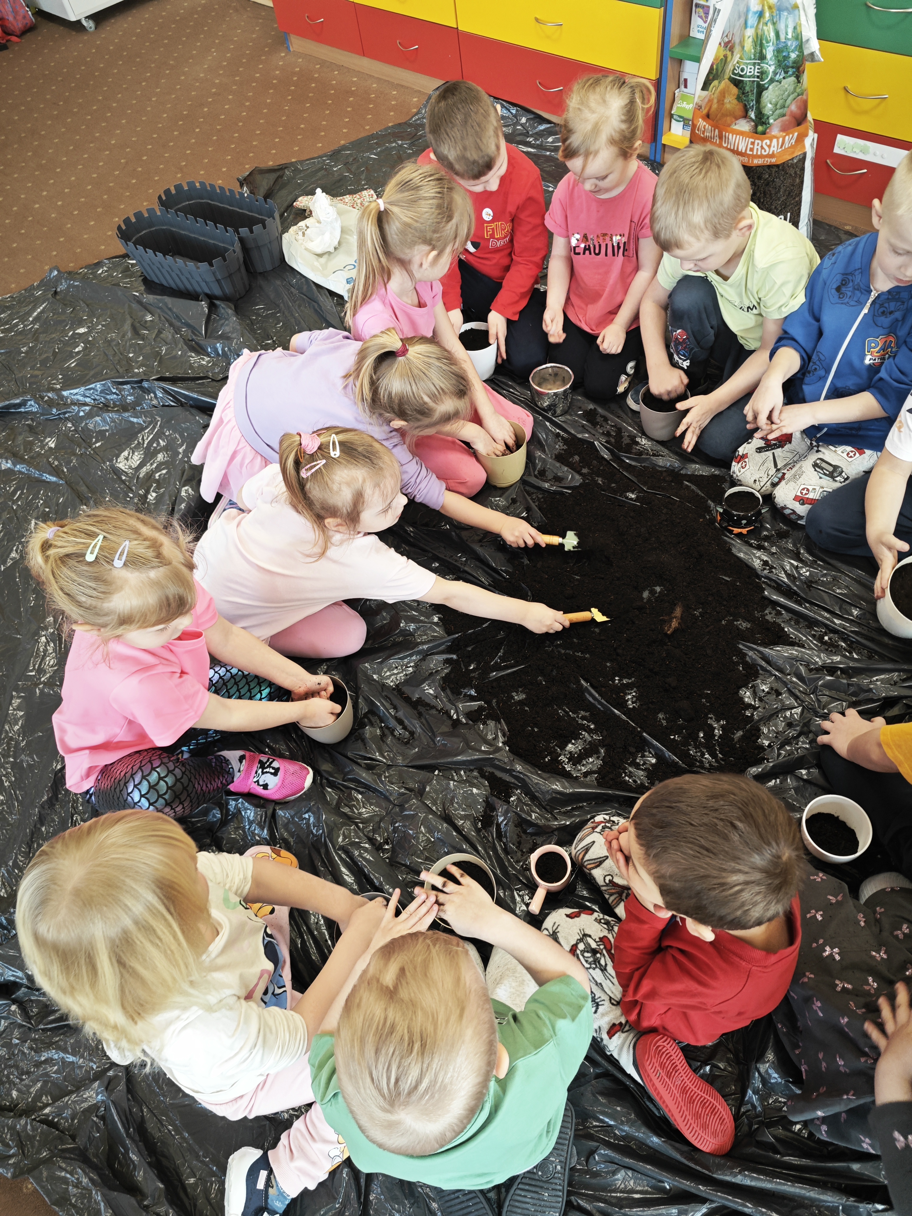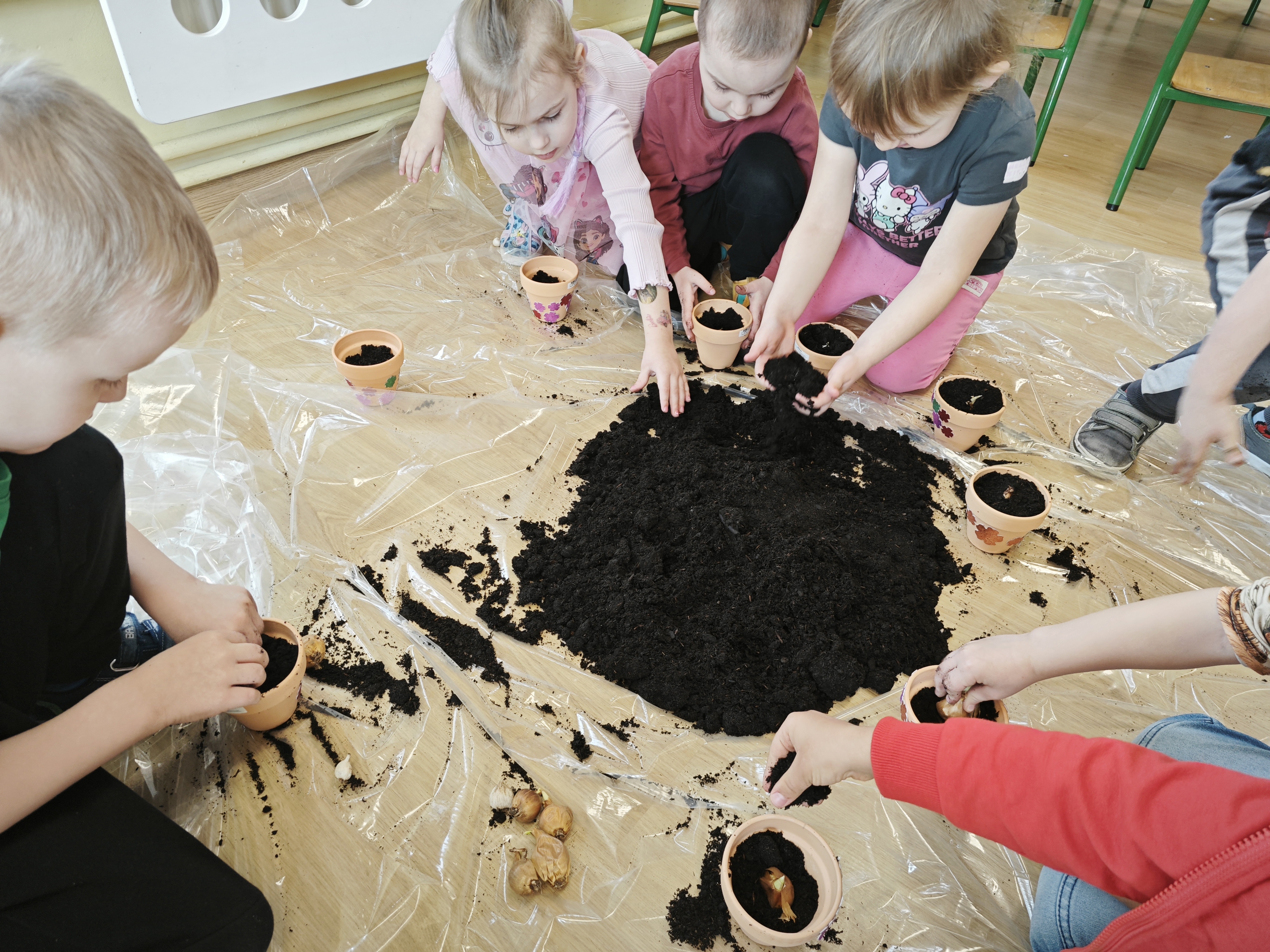 Powoli przygotowujemy się do wiosny. W tym roku urządziliśmy ogródek przedszkolny w naszej sali. Posadziliśmy sałatę, pomidory czy majeranek, a także stworzyliśmy kwietną rabatkę. Dzieci z zaangażowaniem brały udział w zajęciach.