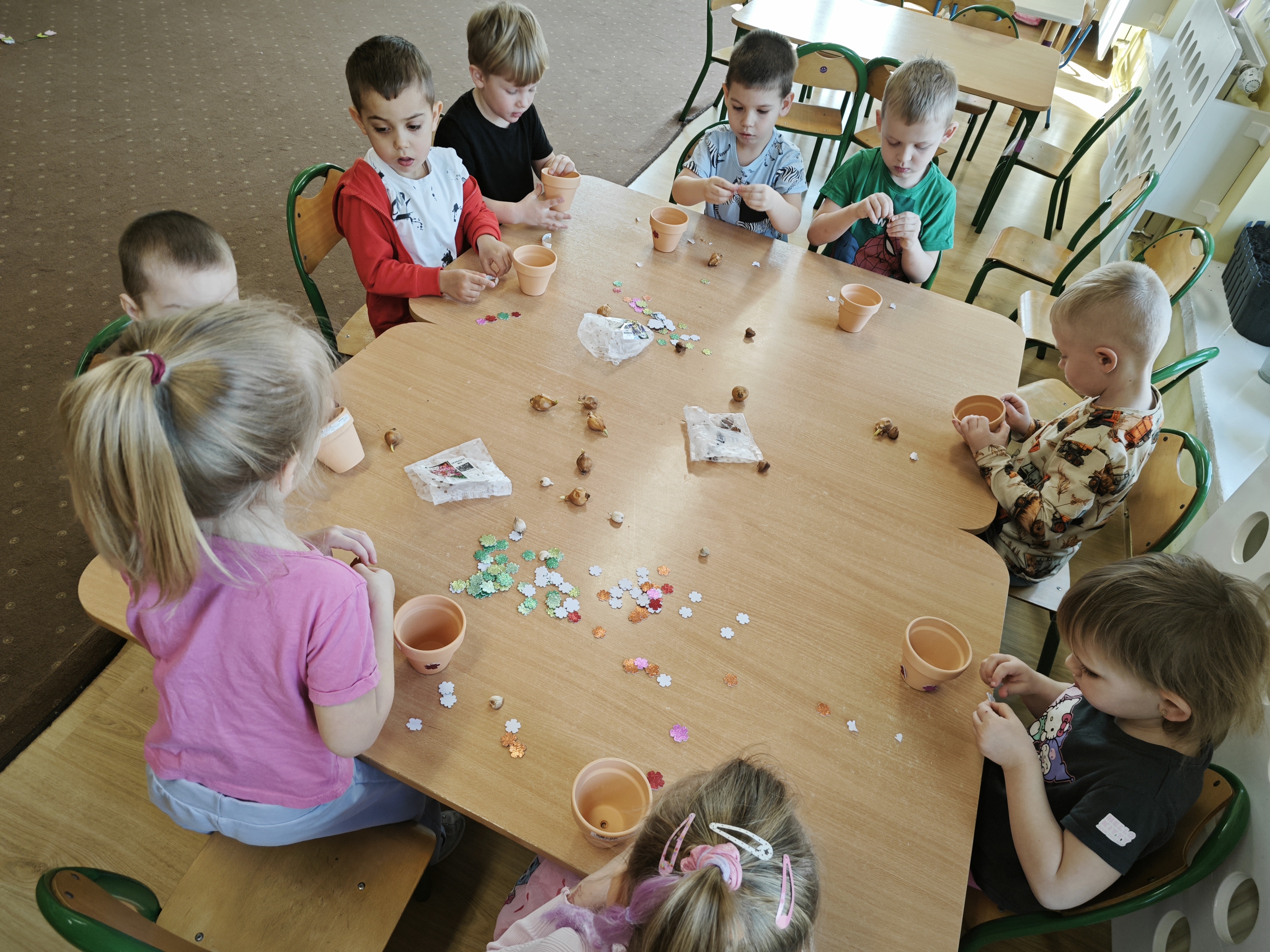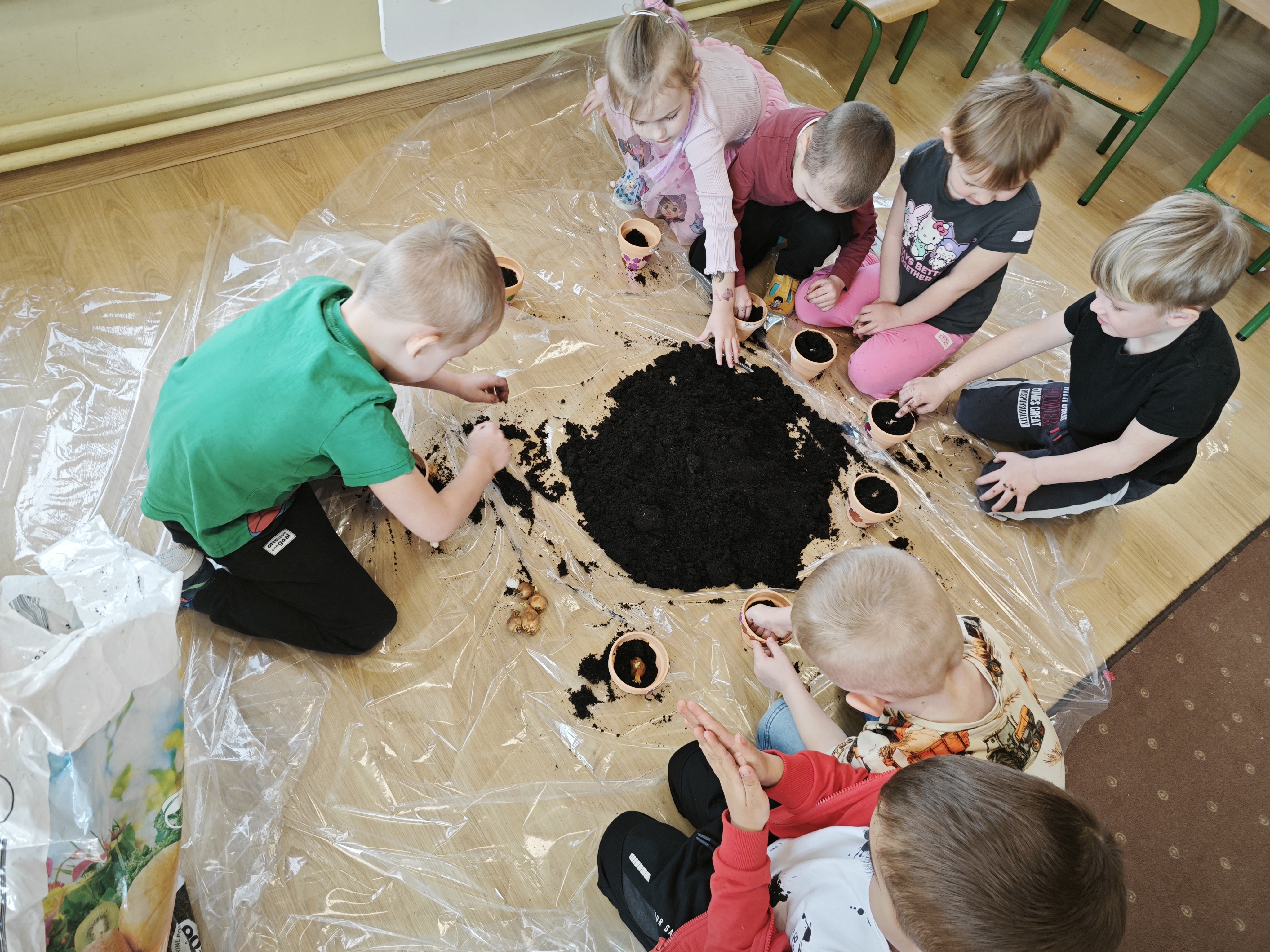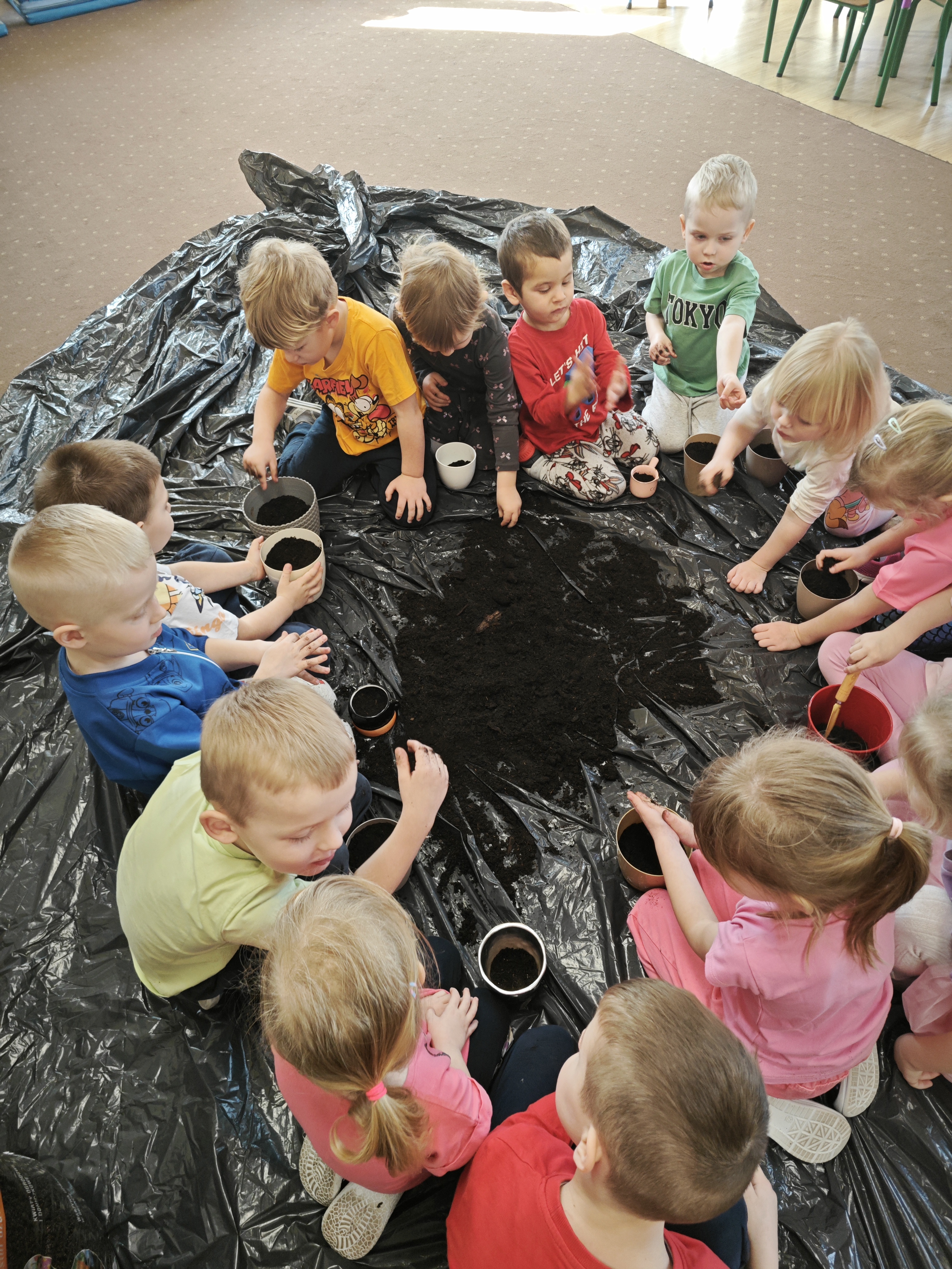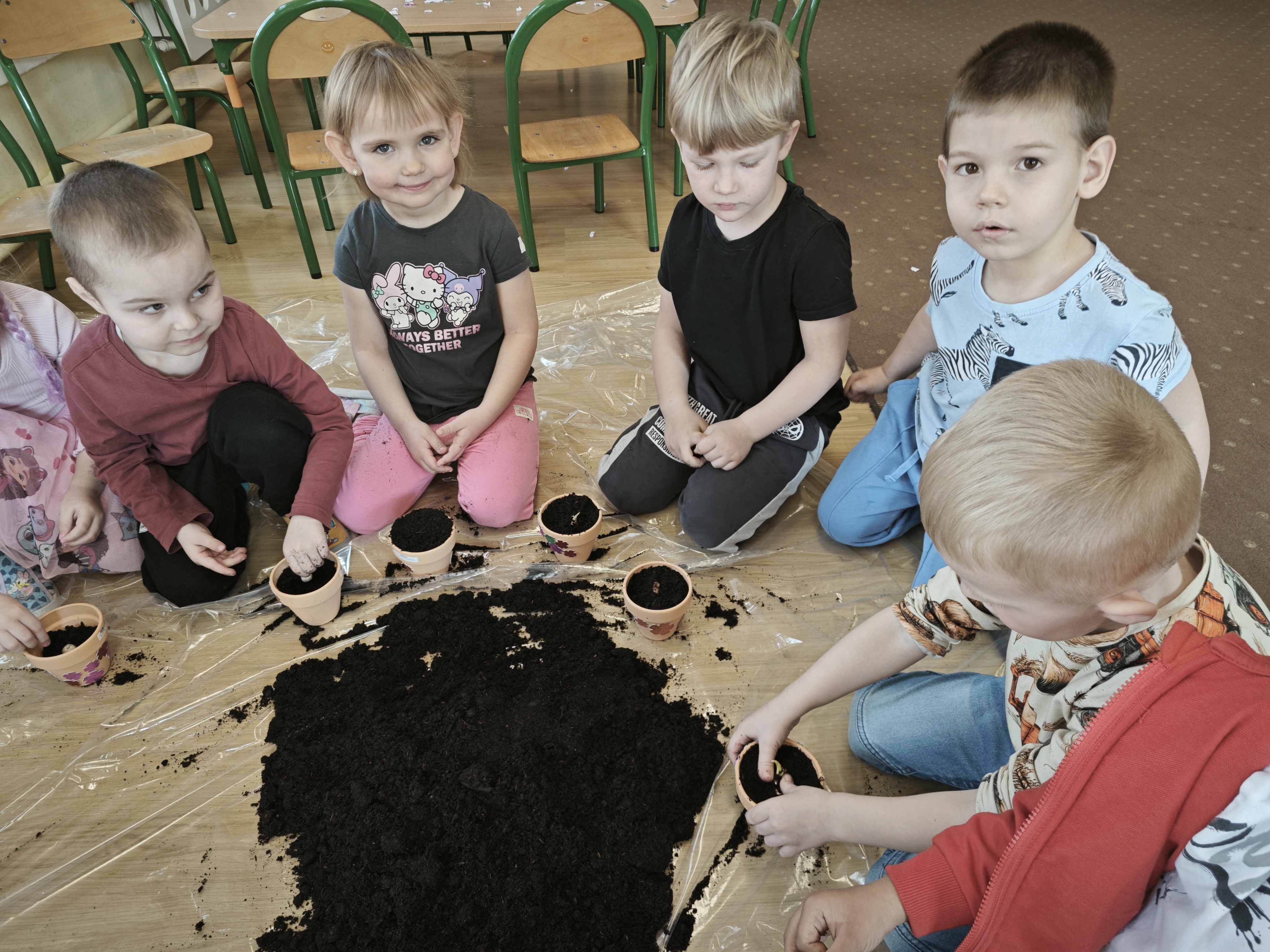 Powoli przygotowujemy się do wiosny. W tym roku urządziliśmy ogródek przedszkolny w naszej sali. Posadziliśmy sałatę, pomidory czy majeranek, a także stworzyliśmy kwietną rabatkę. Dzieci z zaangażowaniem brały udział w zajęciach.