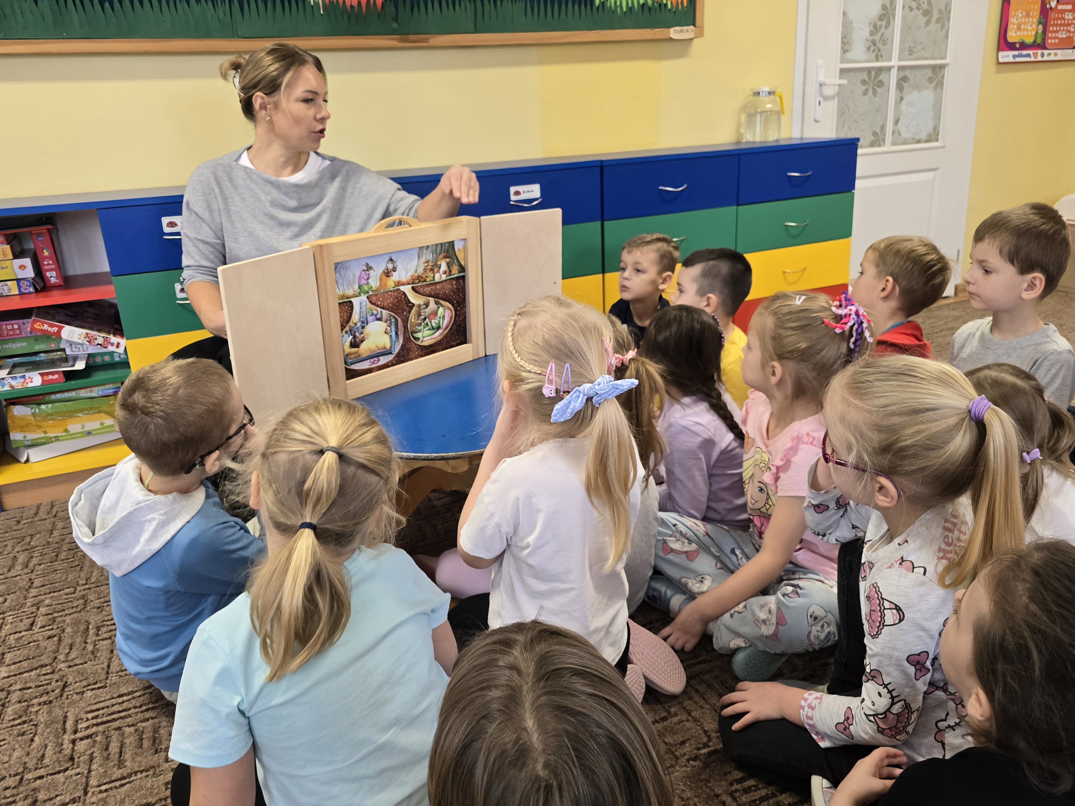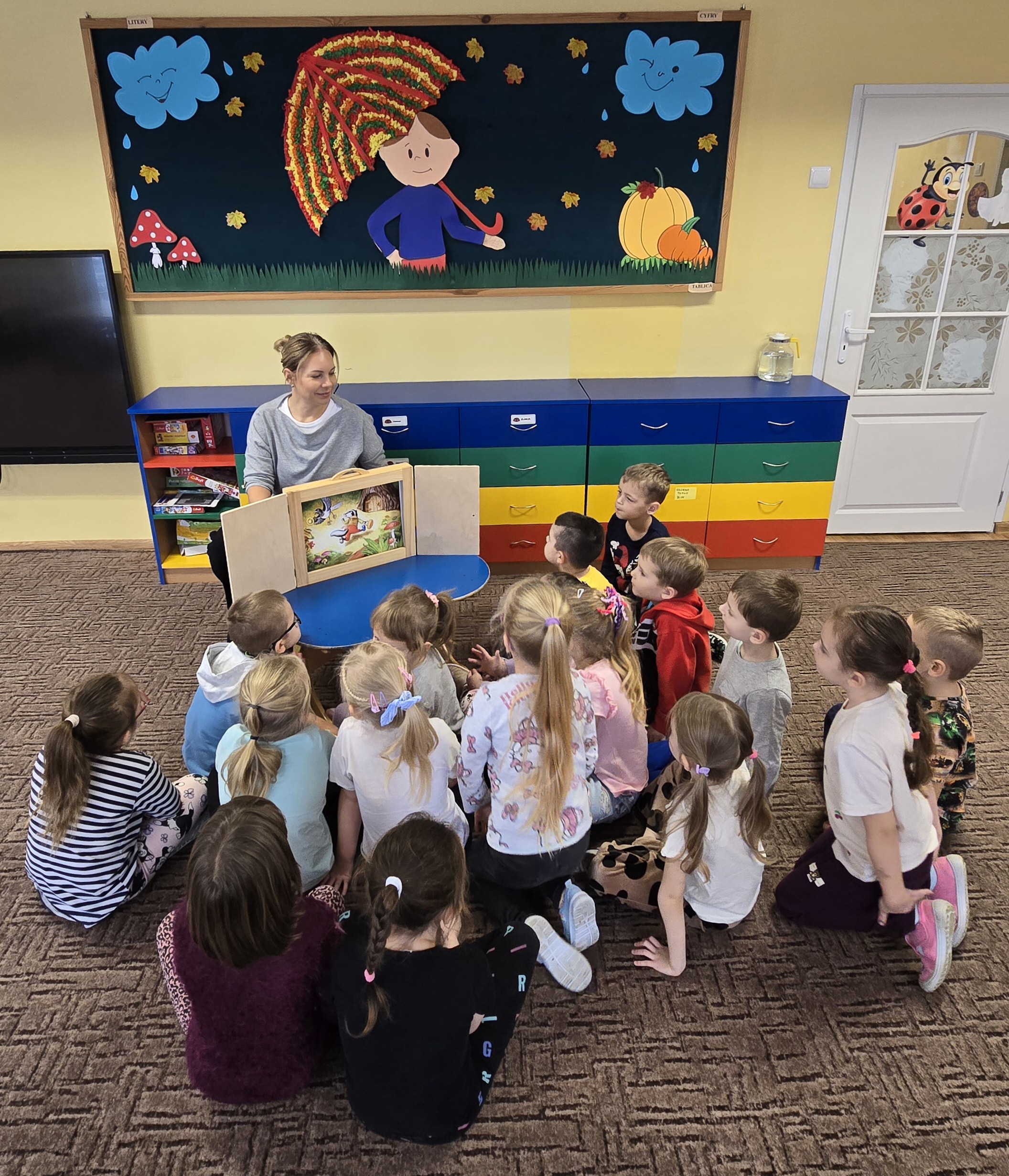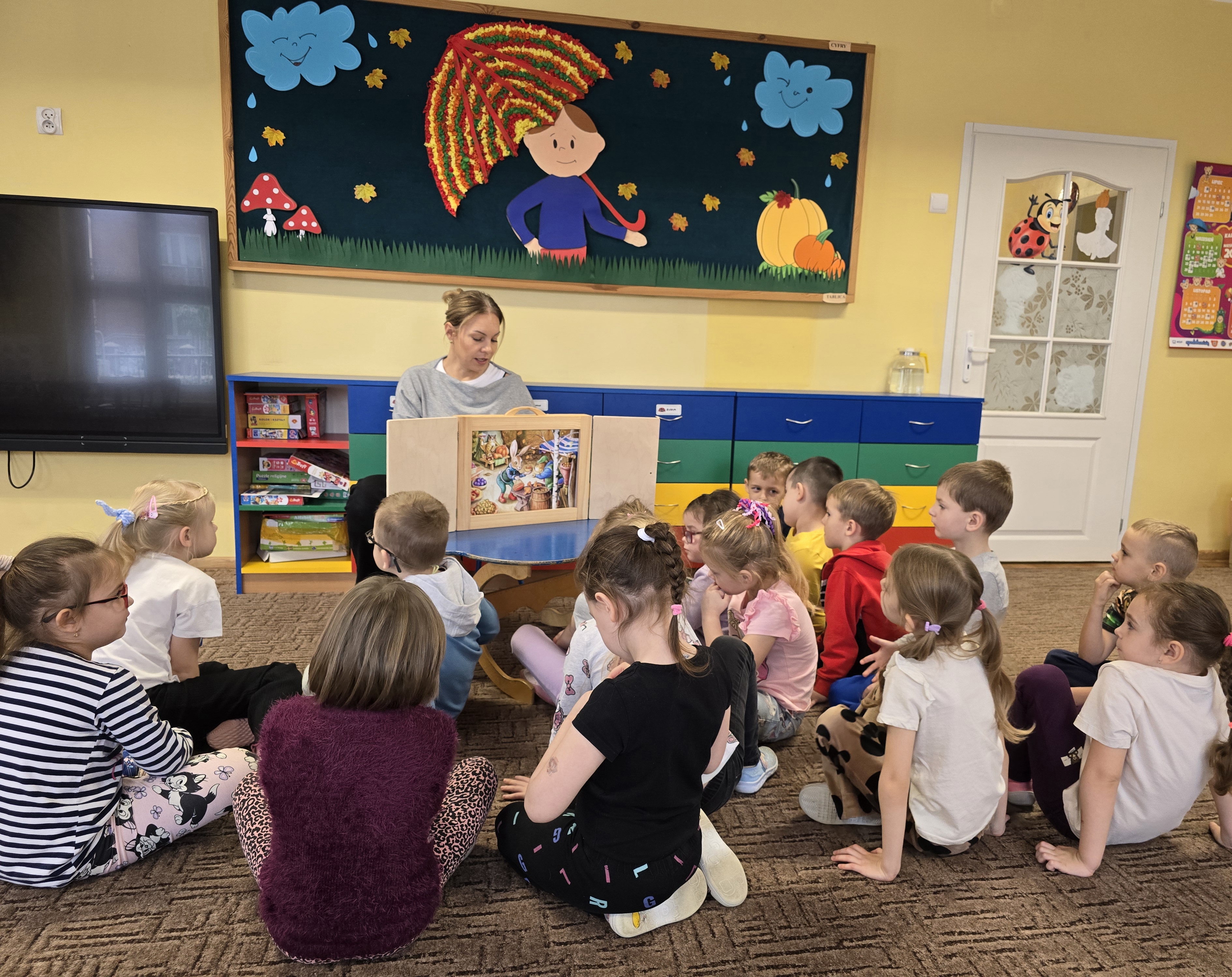 Tym razem dzieci miały okazję obejrzeć teatrzyk kamishibai, w którym zaprezentowana została opowieść pt. "Jesienny bal w lesie." Biedroneczki z wielkim zainteresowaniem słuchały historii i bezbłędnie odpowiadały na zadawane pytania, wykazując się pamięcią i spostrzegawczością.