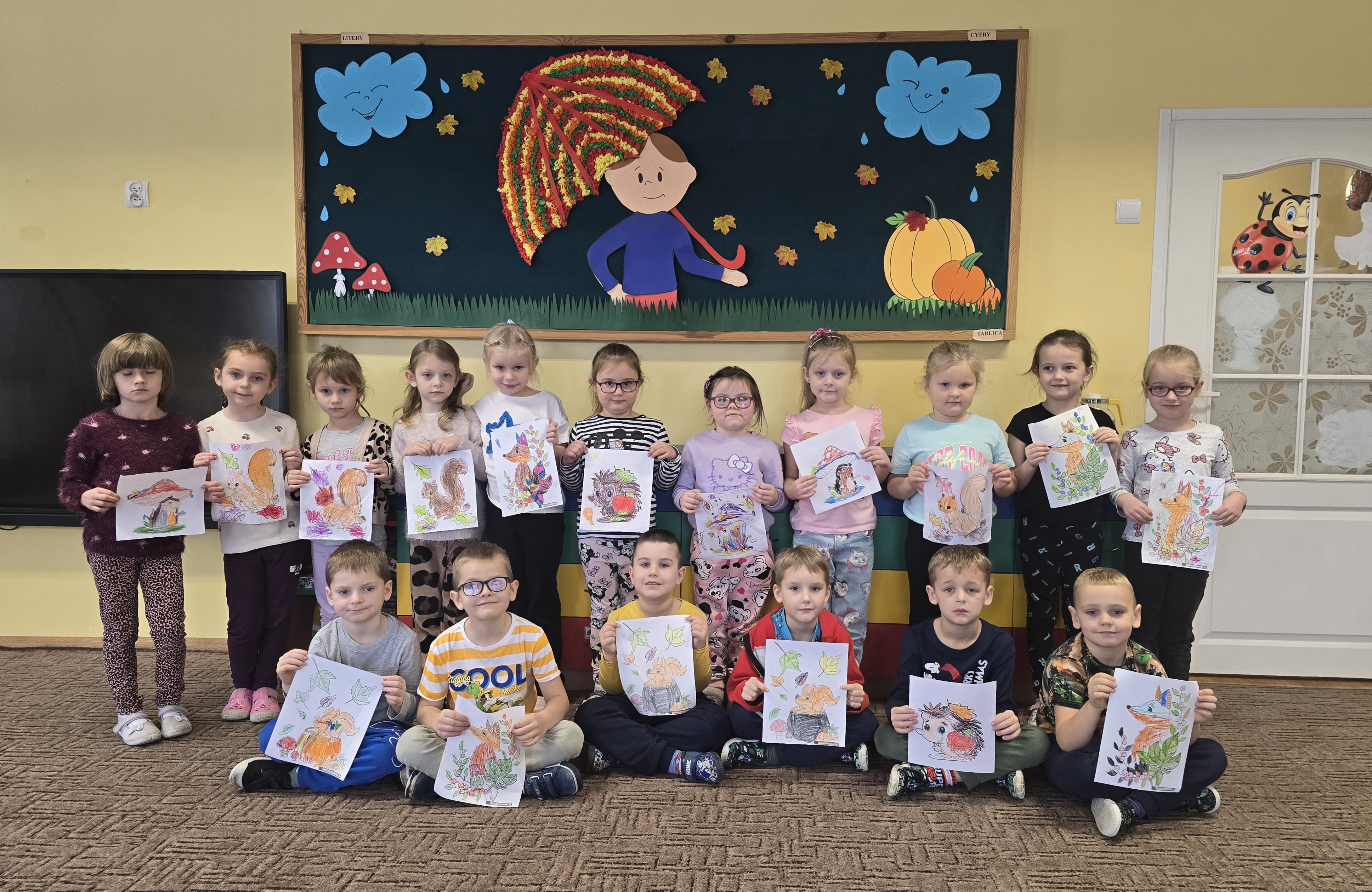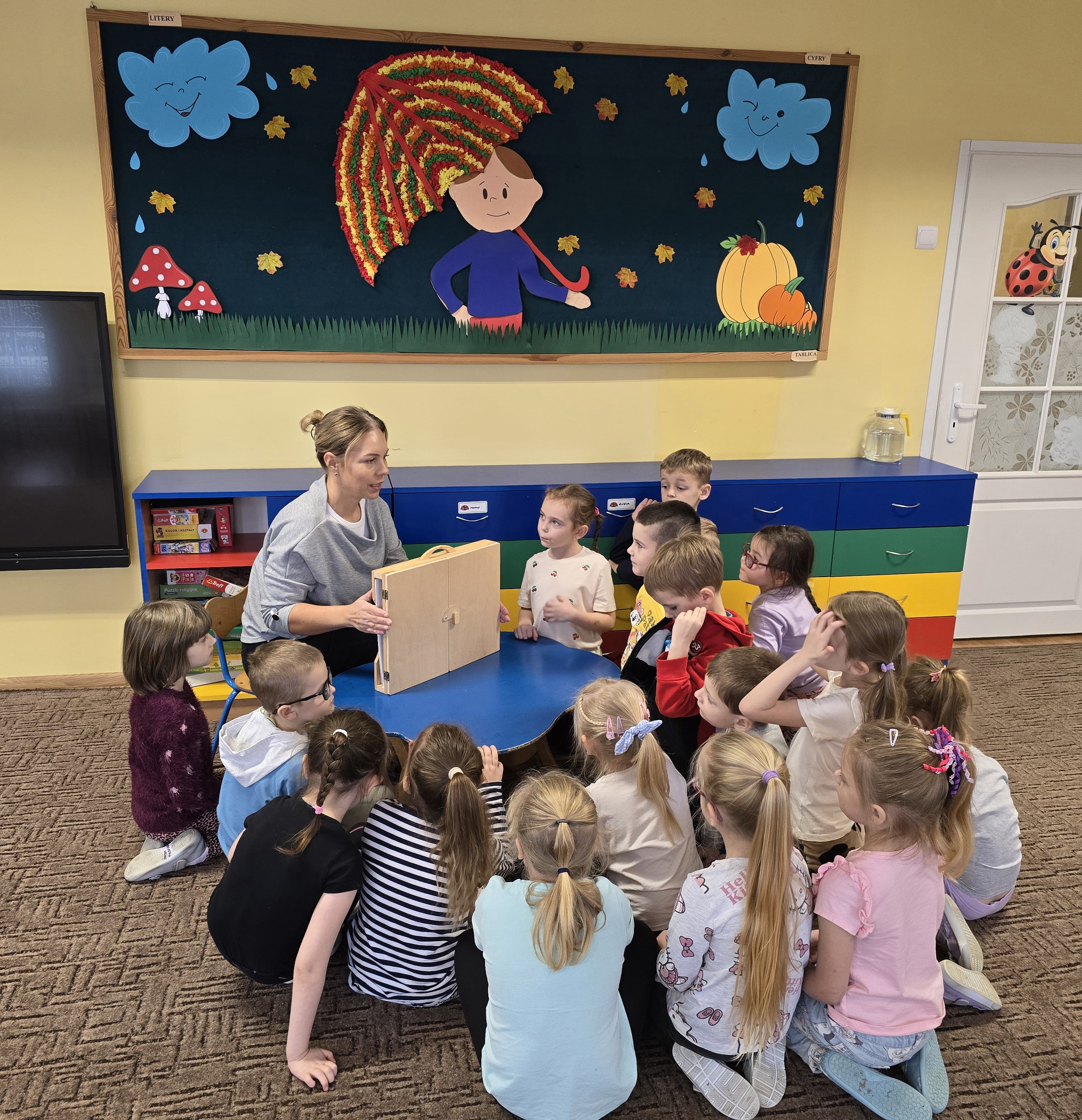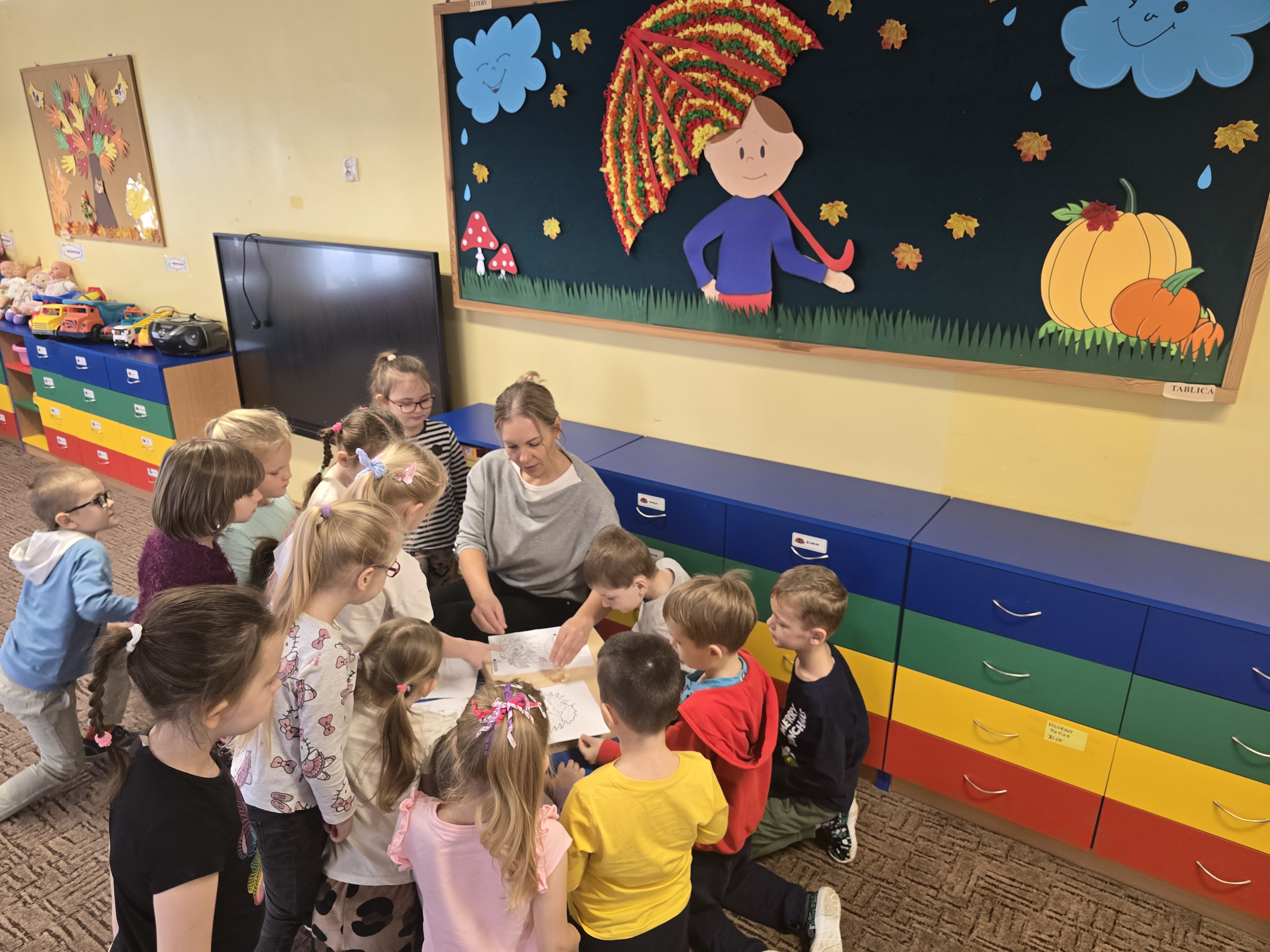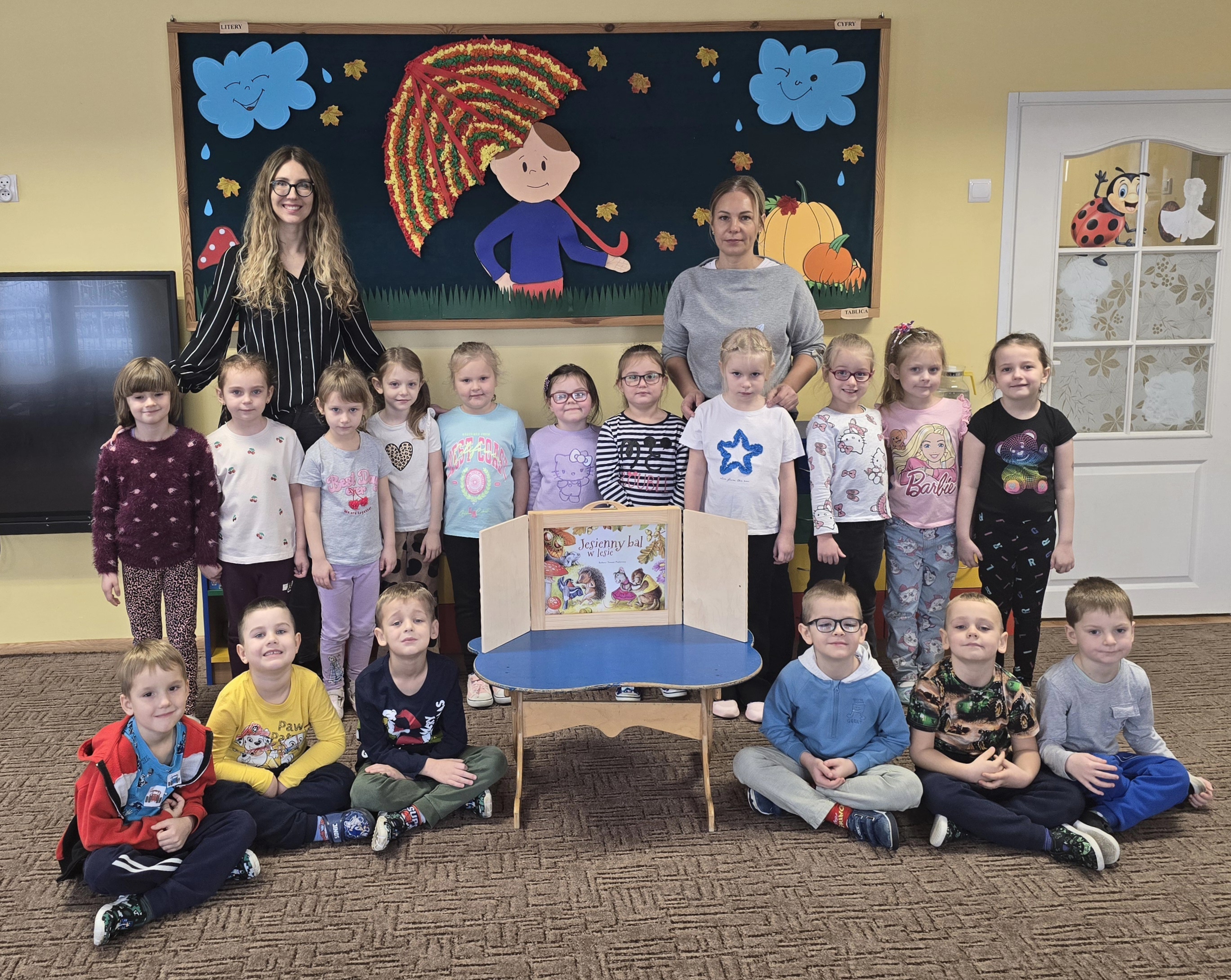 Tym razem dzieci miały okazję obejrzeć teatrzyk kamishibai, w którym zaprezentowana została opowieść pt. "Jesienny bal w lesie." Biedroneczki z wielkim zainteresowaniem słuchały historii i bezbłędnie odpowiadały na zadawane pytania, wykazując się pamięcią i spostrzegawczością.