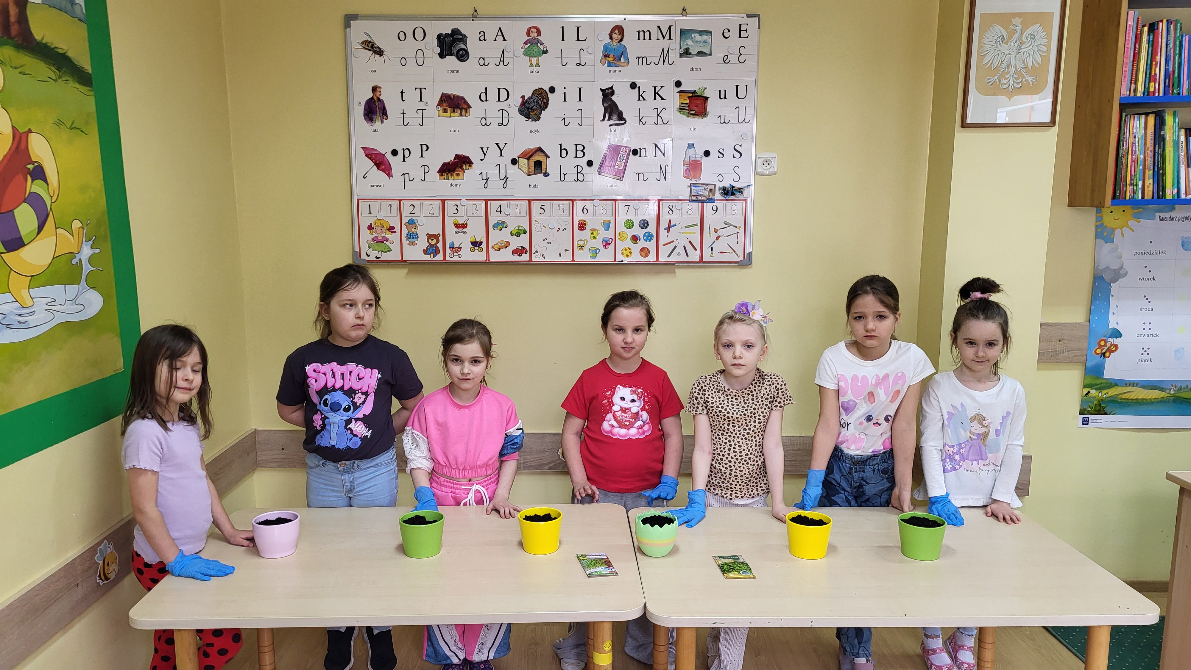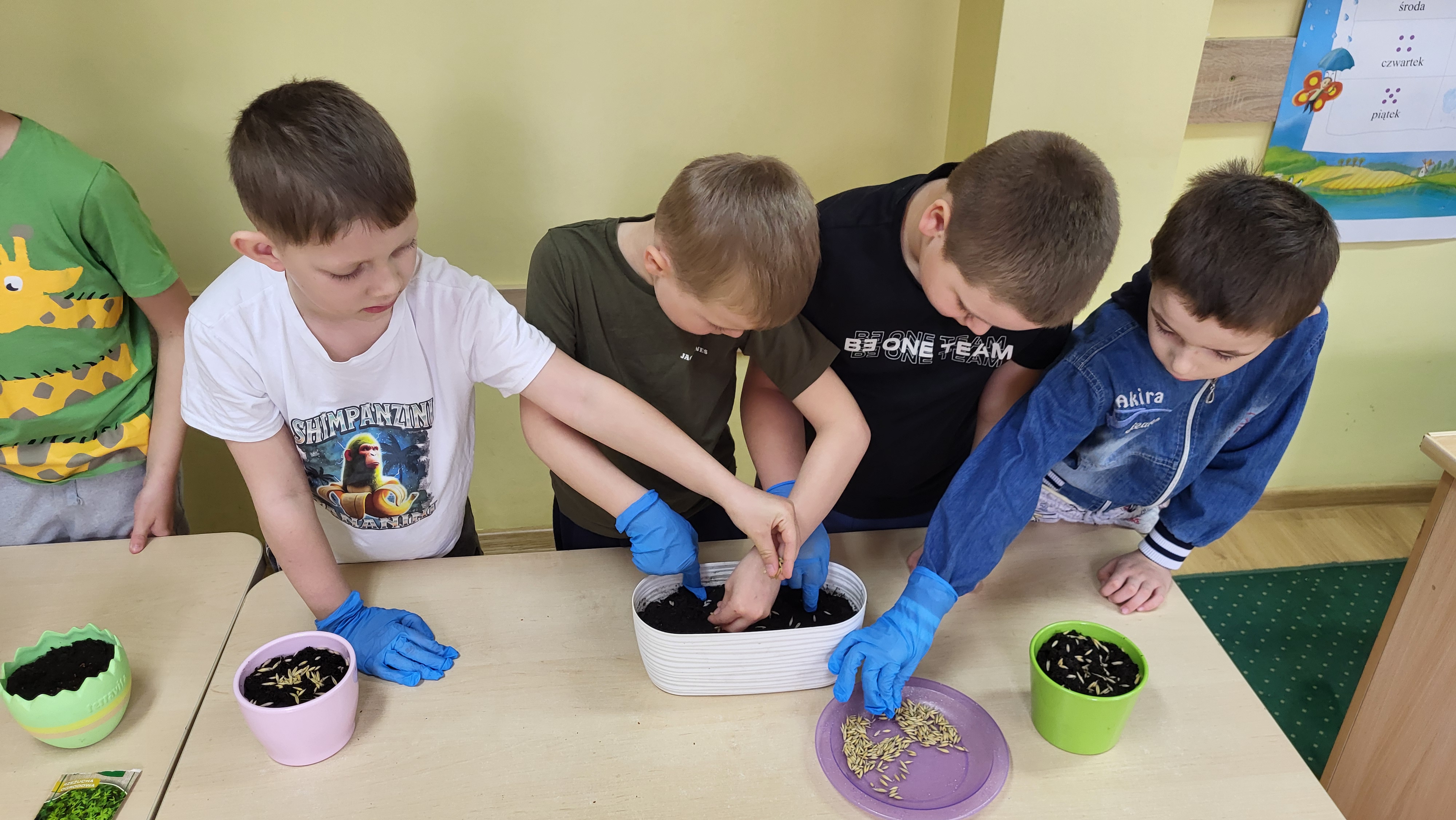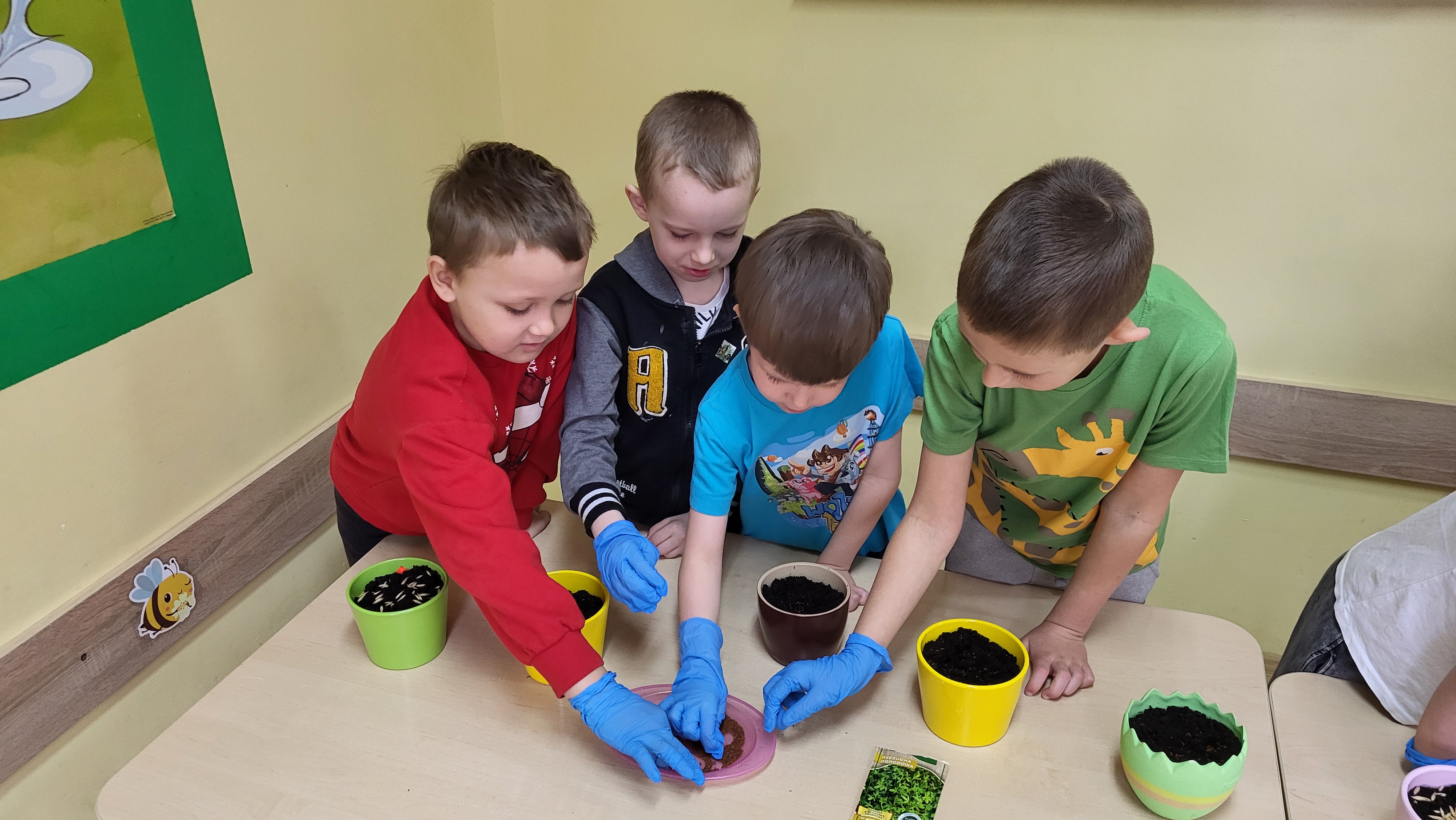 Rozpoczęliśmy od siania rzeżuchy i owsa – dzieci z zapałem przygotowywały doniczki i wysiewały nasiona, codziennie obserwując, jak roślinki rosną. Dzięki temu nie tylko uczyły się cierpliwości i systematyczności, ale też poznawały podstawy dbania o rośliny.