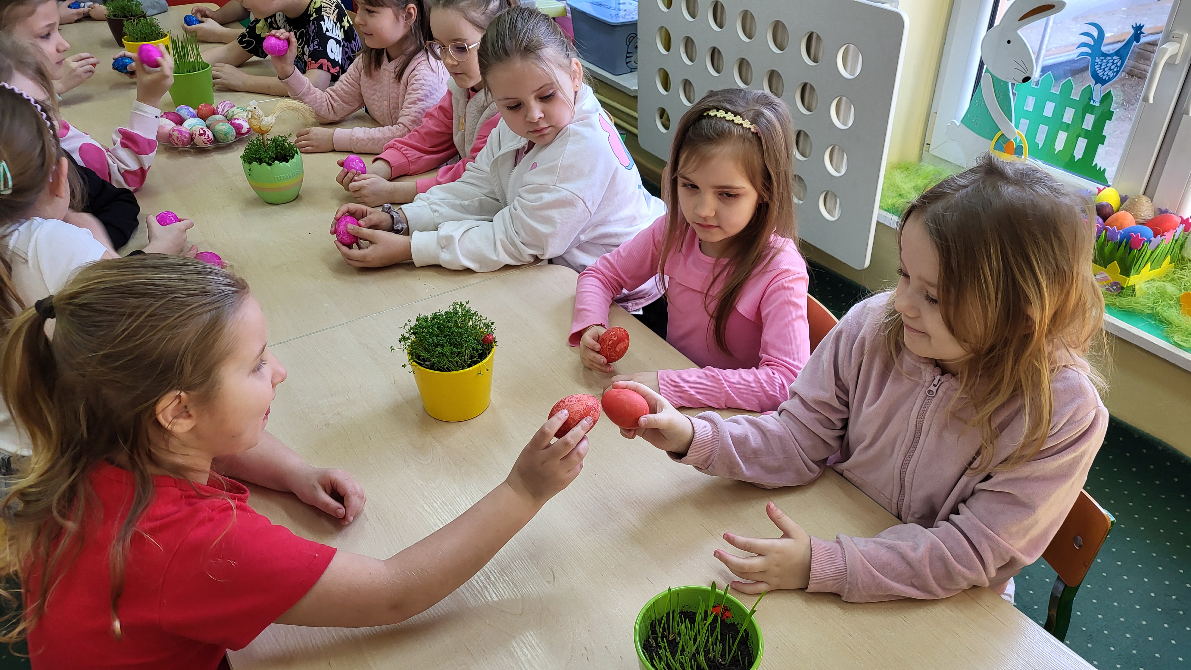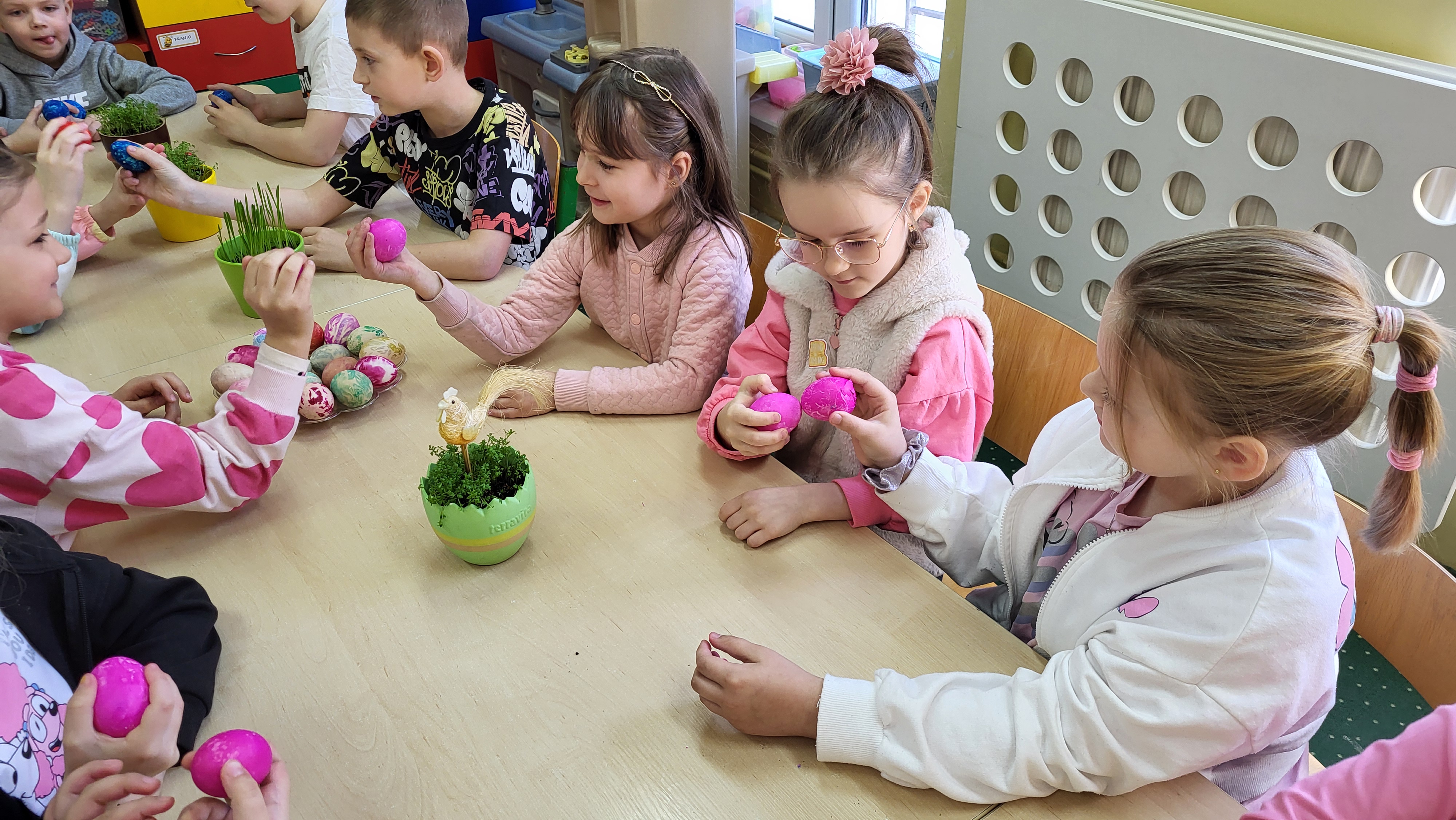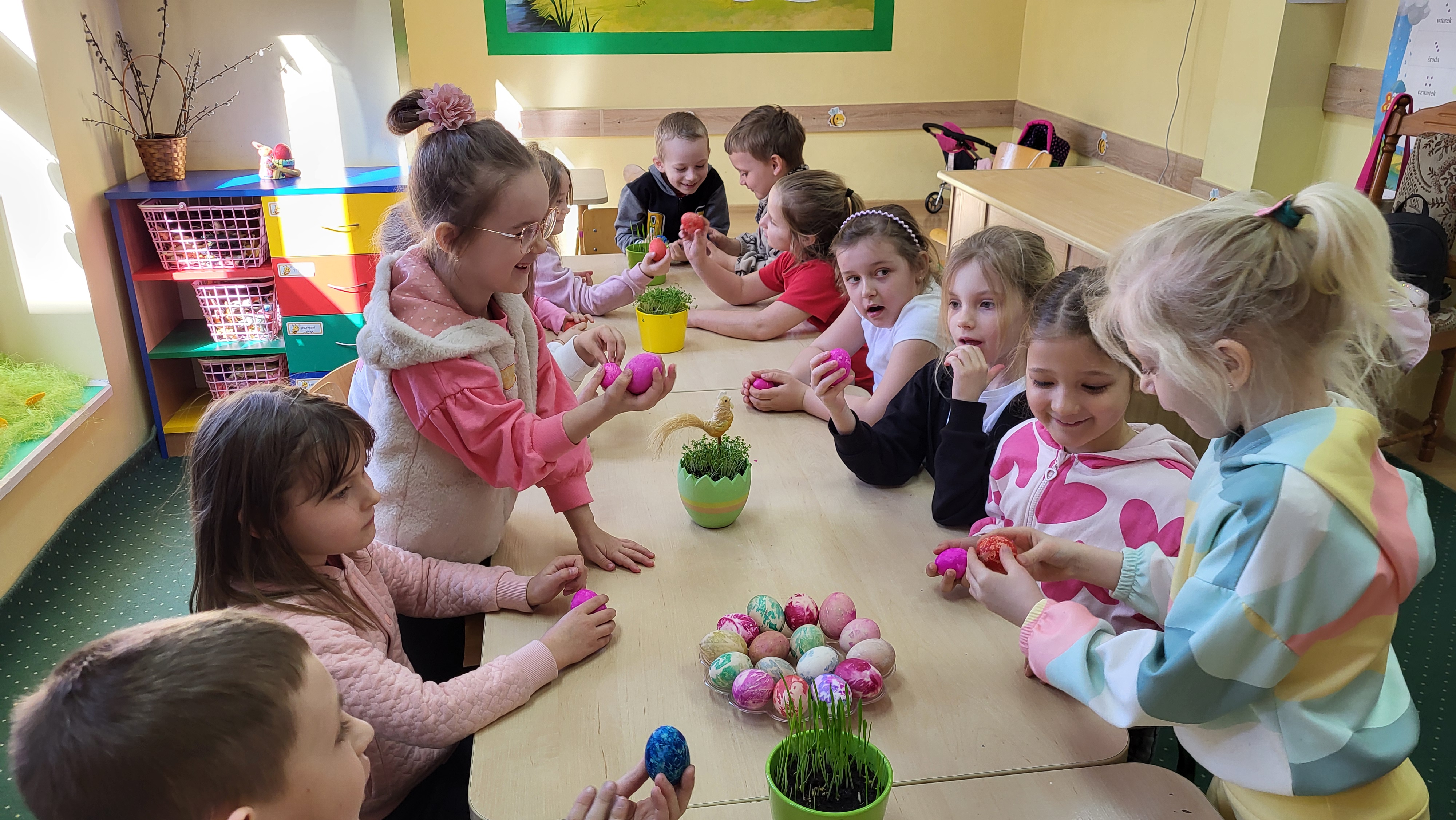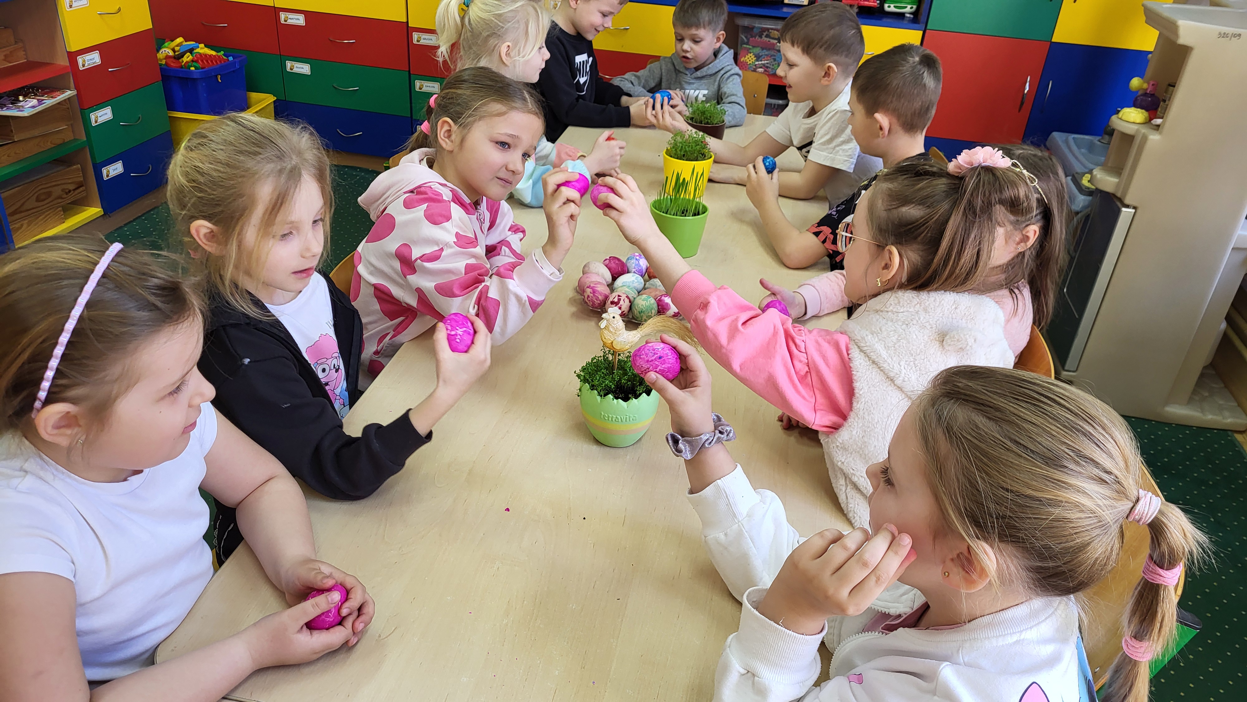 W tygodniu poprzedzającym Święta Wielkanocne nasze przedszkole zamieniło się w prawdziwą wiosenną pracownię! W ramach zajęć dydaktycznych i zabaw tematycznych Pszczółki miały okazję poznać wielkanocne tradycje, a także aktywnie włączyć się w przygotowania do tych radosnych świąt.