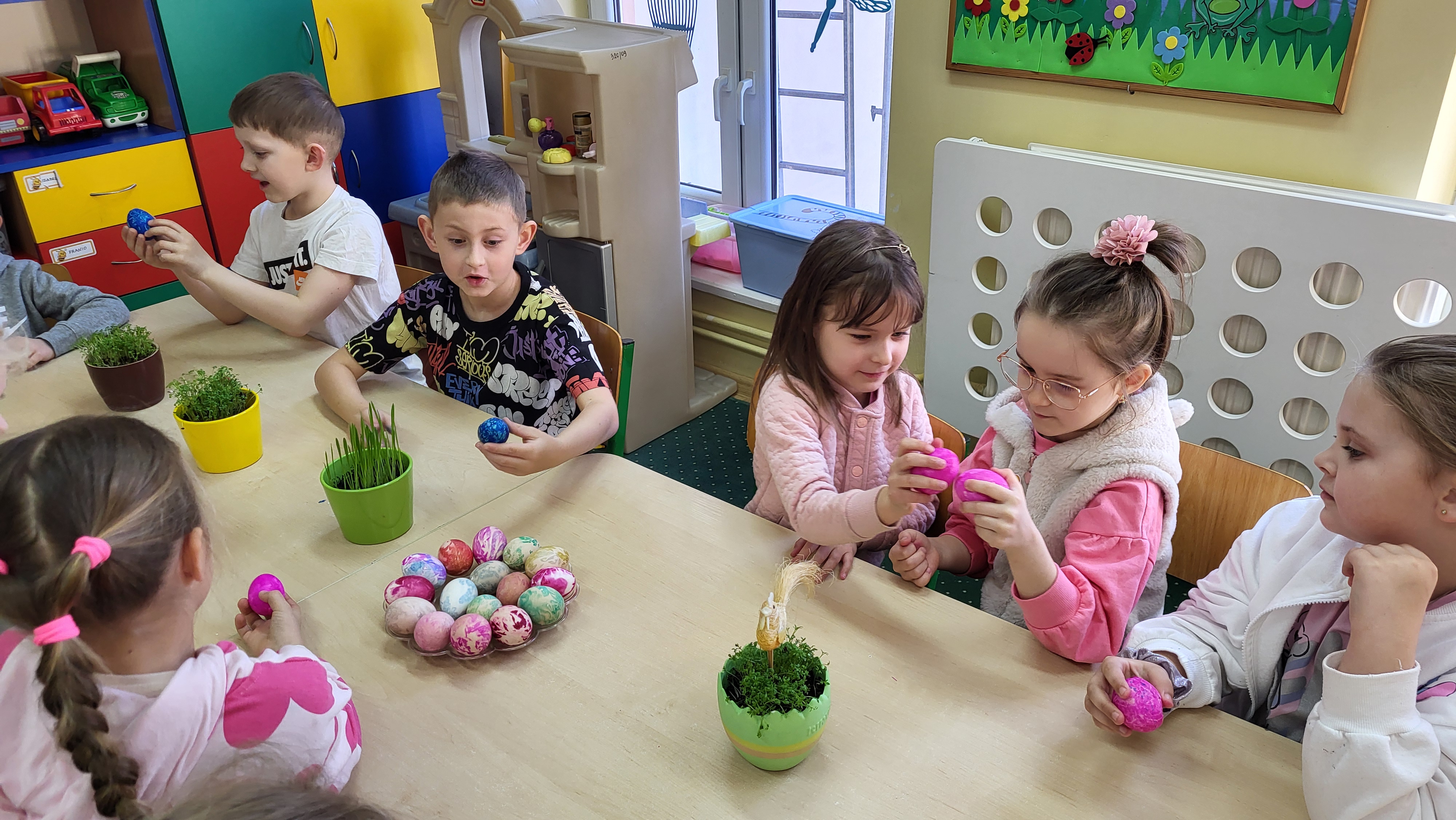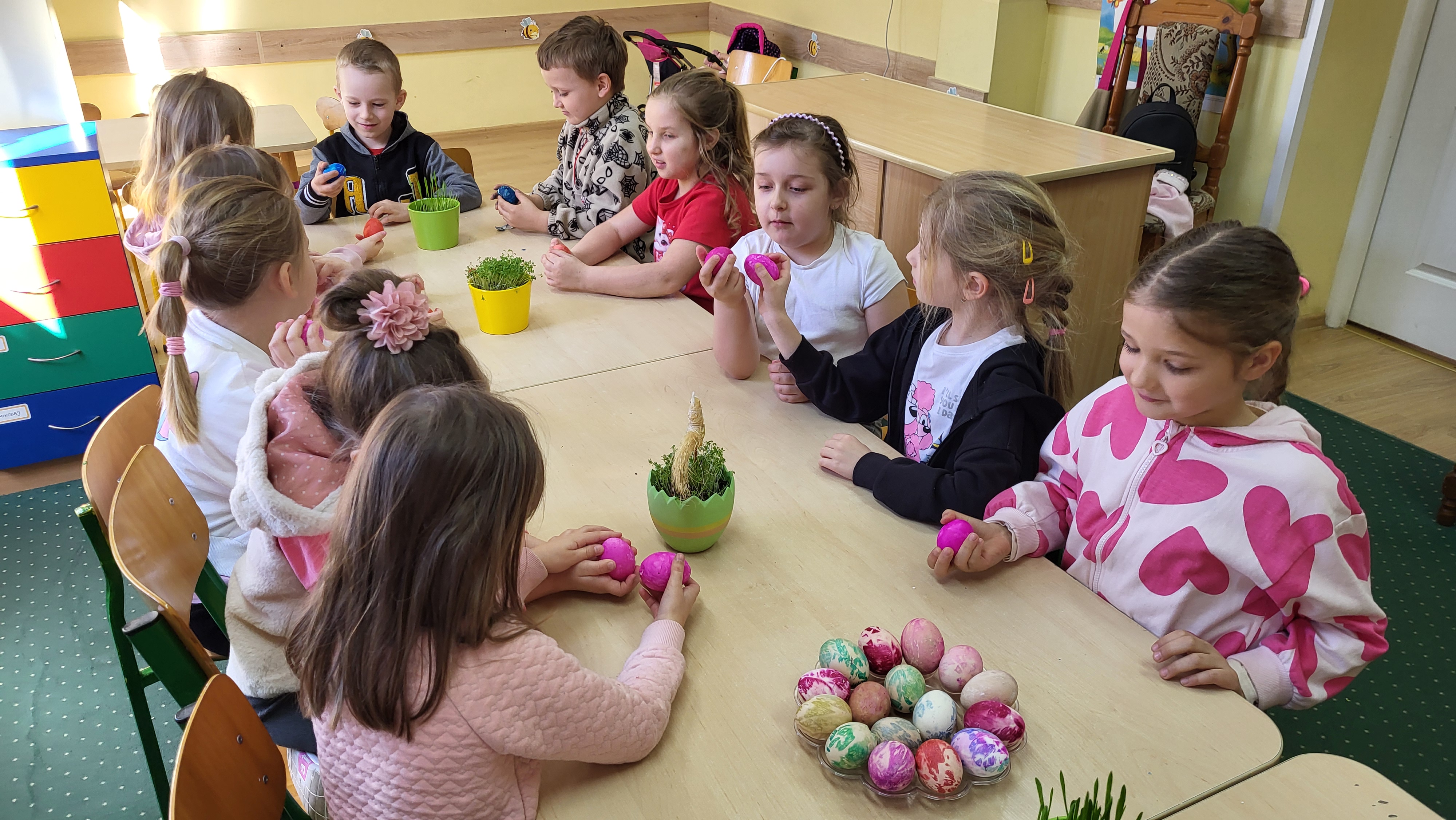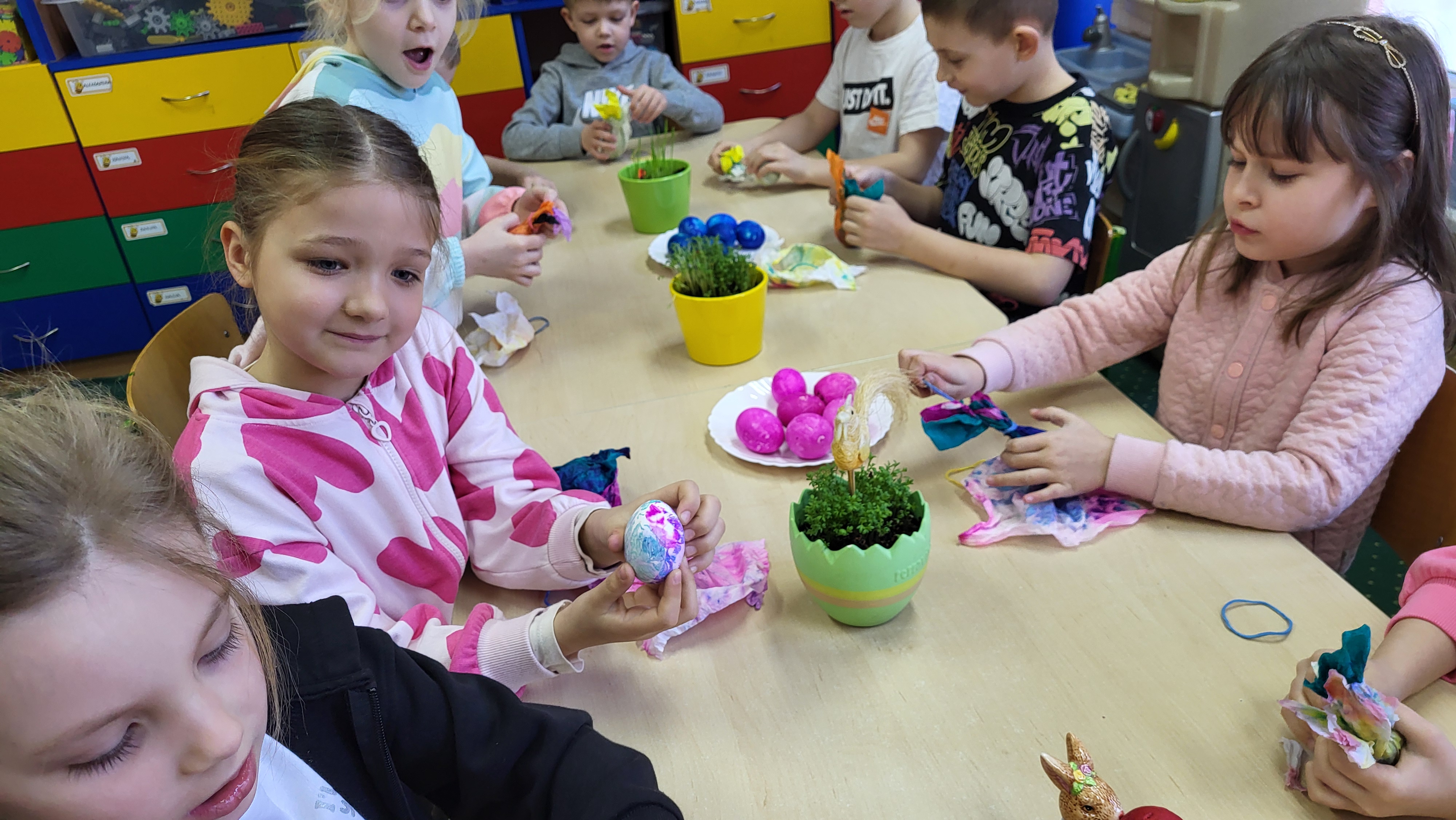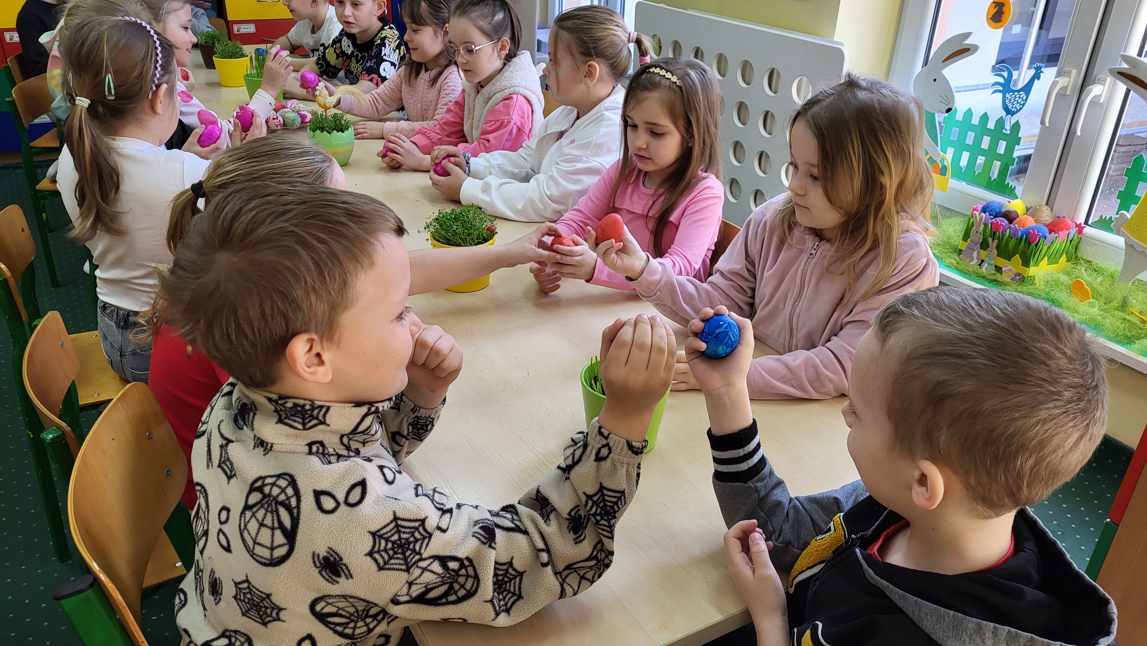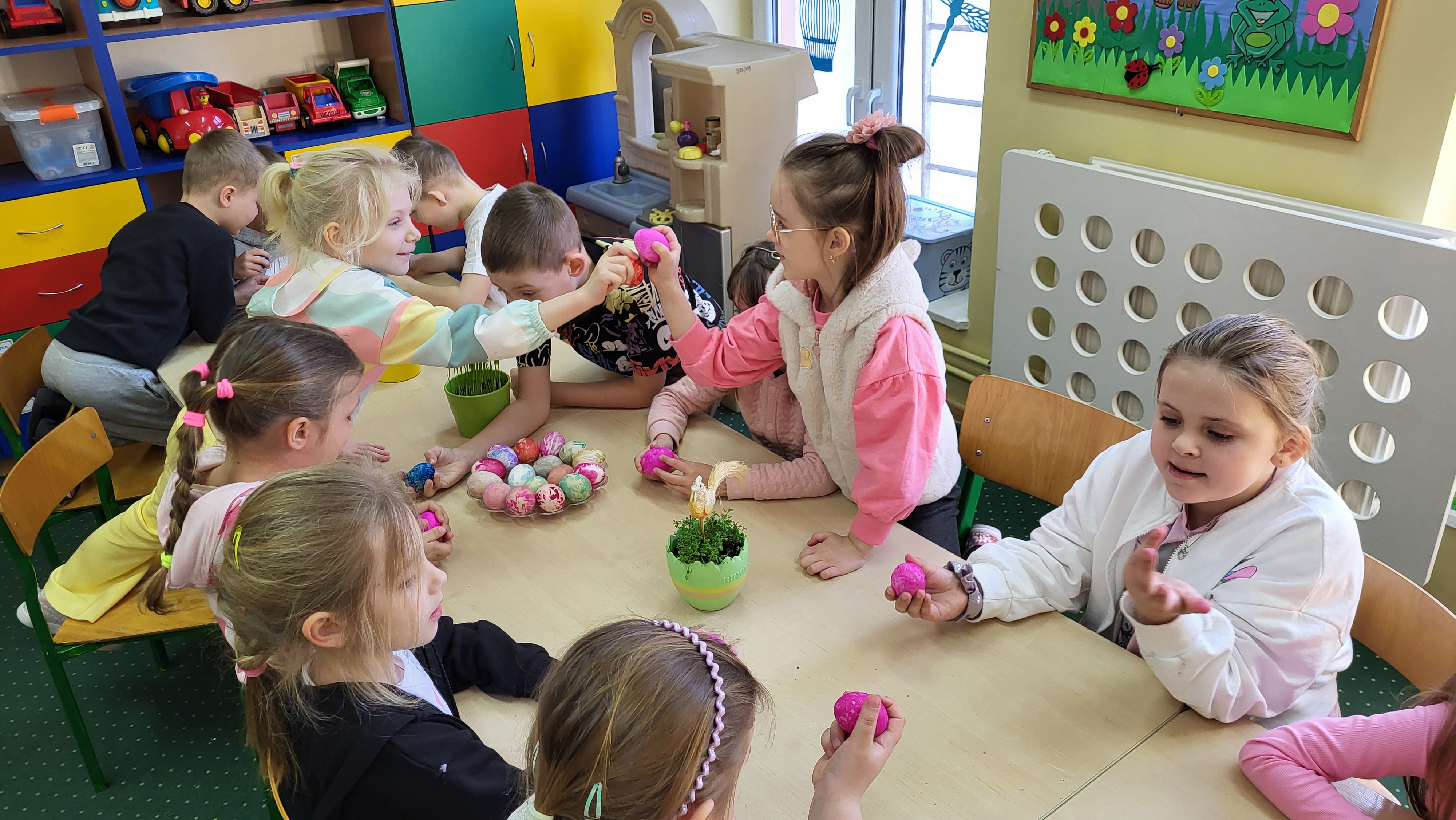 W tygodniu poprzedzającym Święta Wielkanocne nasze przedszkole zamieniło się w prawdziwą wiosenną pracownię! W ramach zajęć dydaktycznych i zabaw tematycznych Pszczółki miały okazję poznać wielkanocne tradycje, a także aktywnie włączyć się w przygotowania do tych radosnych świąt.