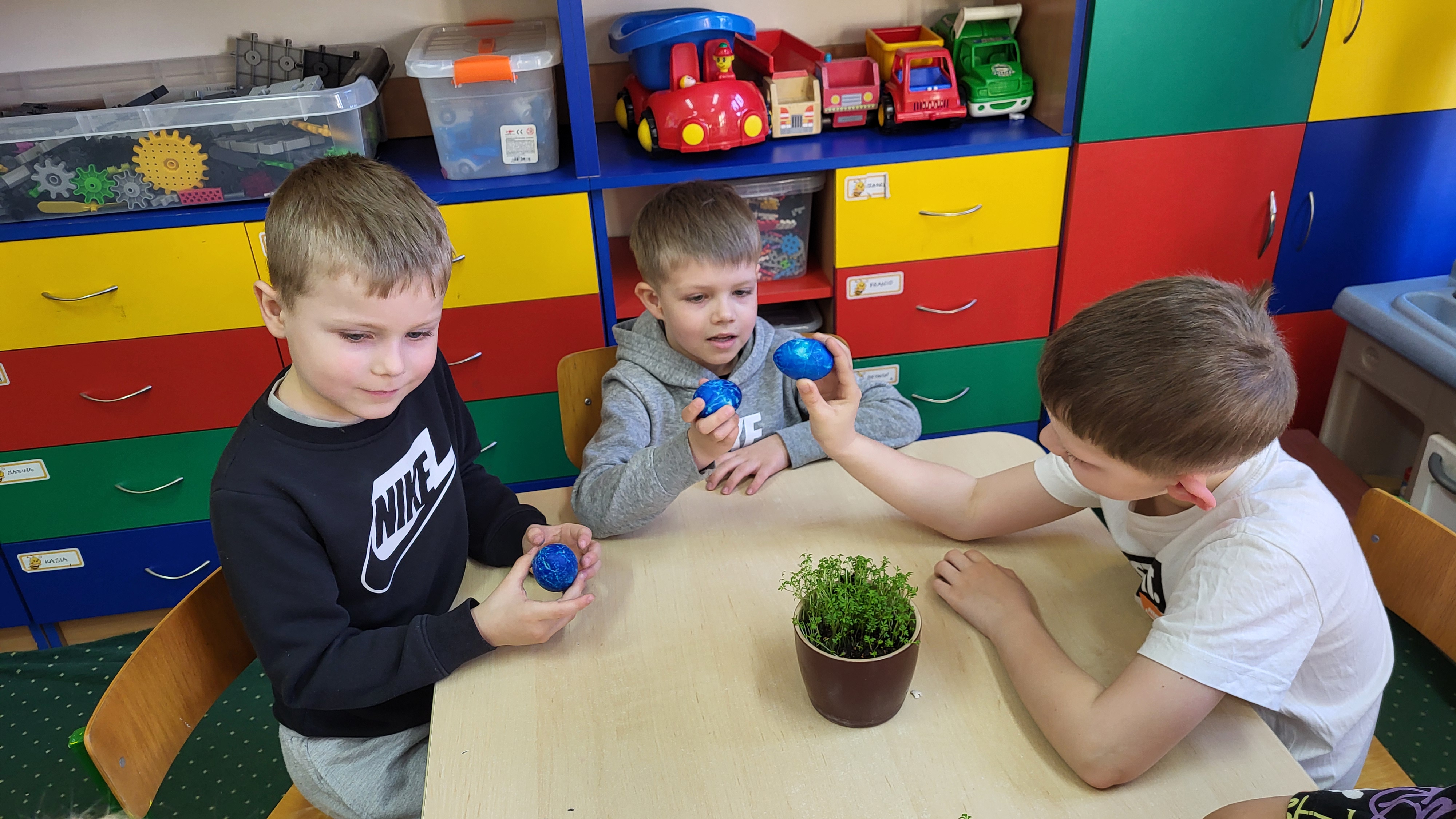 Nie zabrakło również twórczych działań plastycznych. Przedszkolaki wykonały "eksperymentalne pisanki", barwiąc jajka bibułą na dwa sposoby, kolorowe drewniane jajeczka czy też bazie kotki w wazonach. Były też zabawy wielkanocne np."czyje jajko wygra", które dostarczyły nam wiele uśmiechów :)