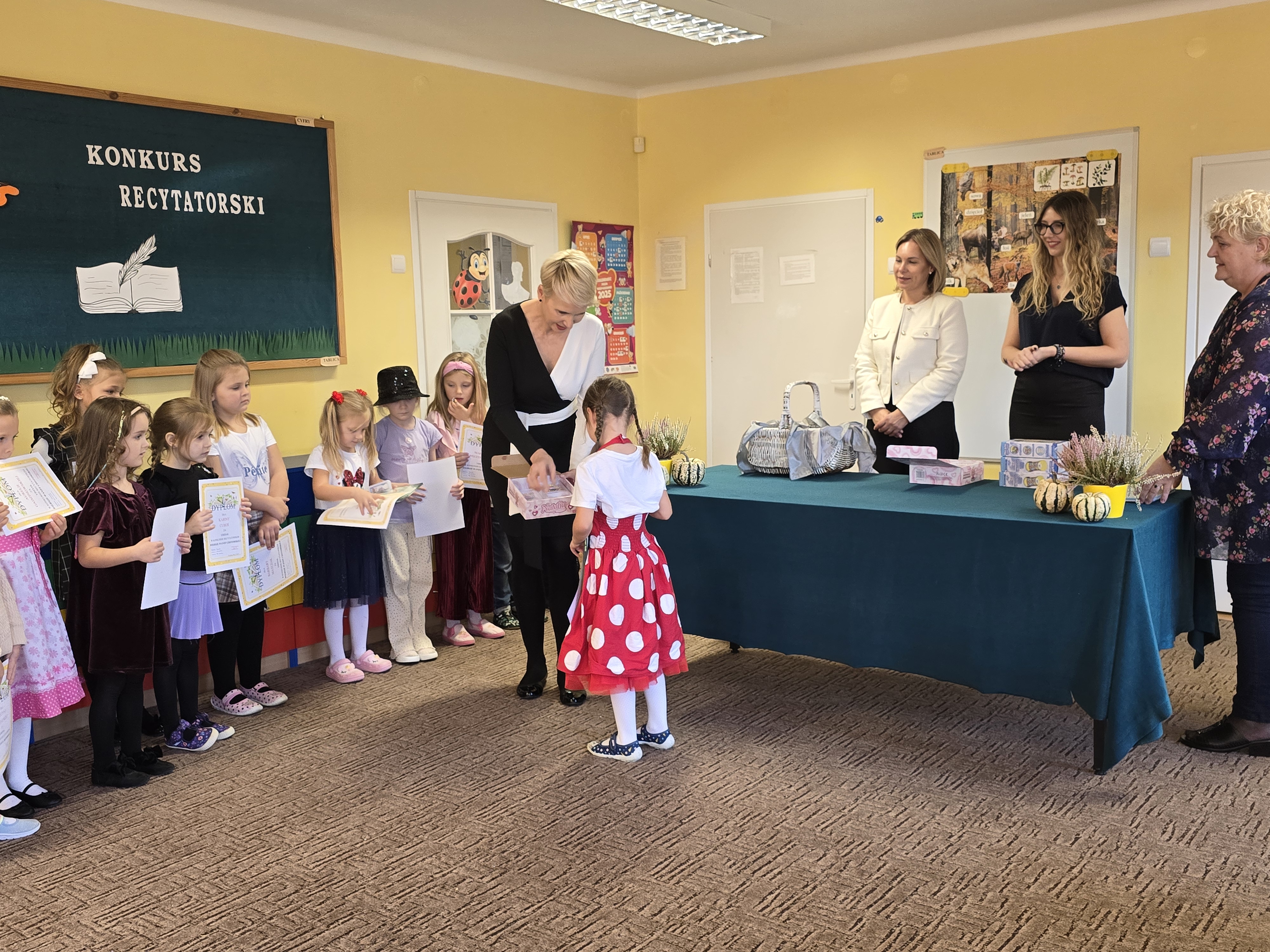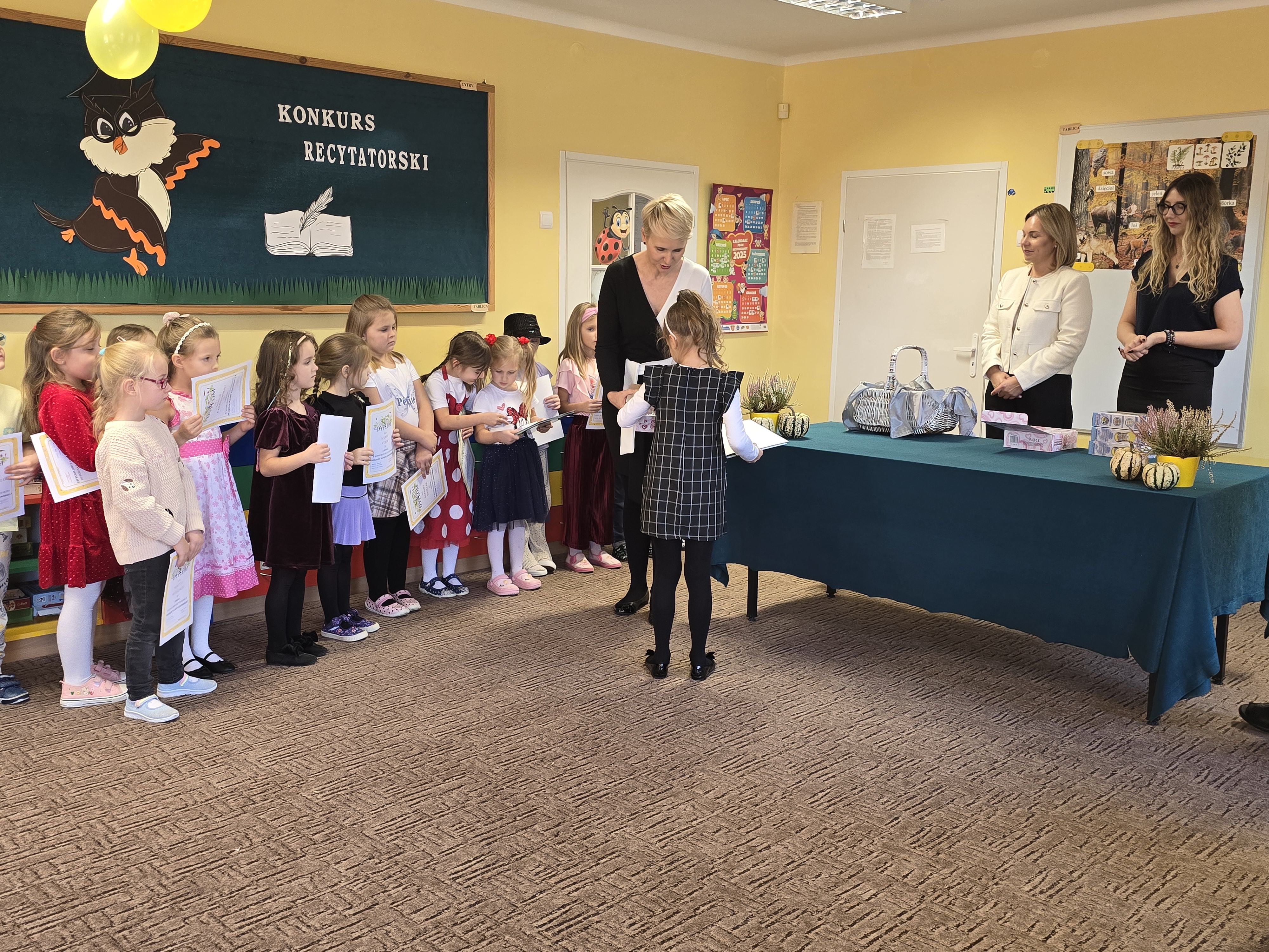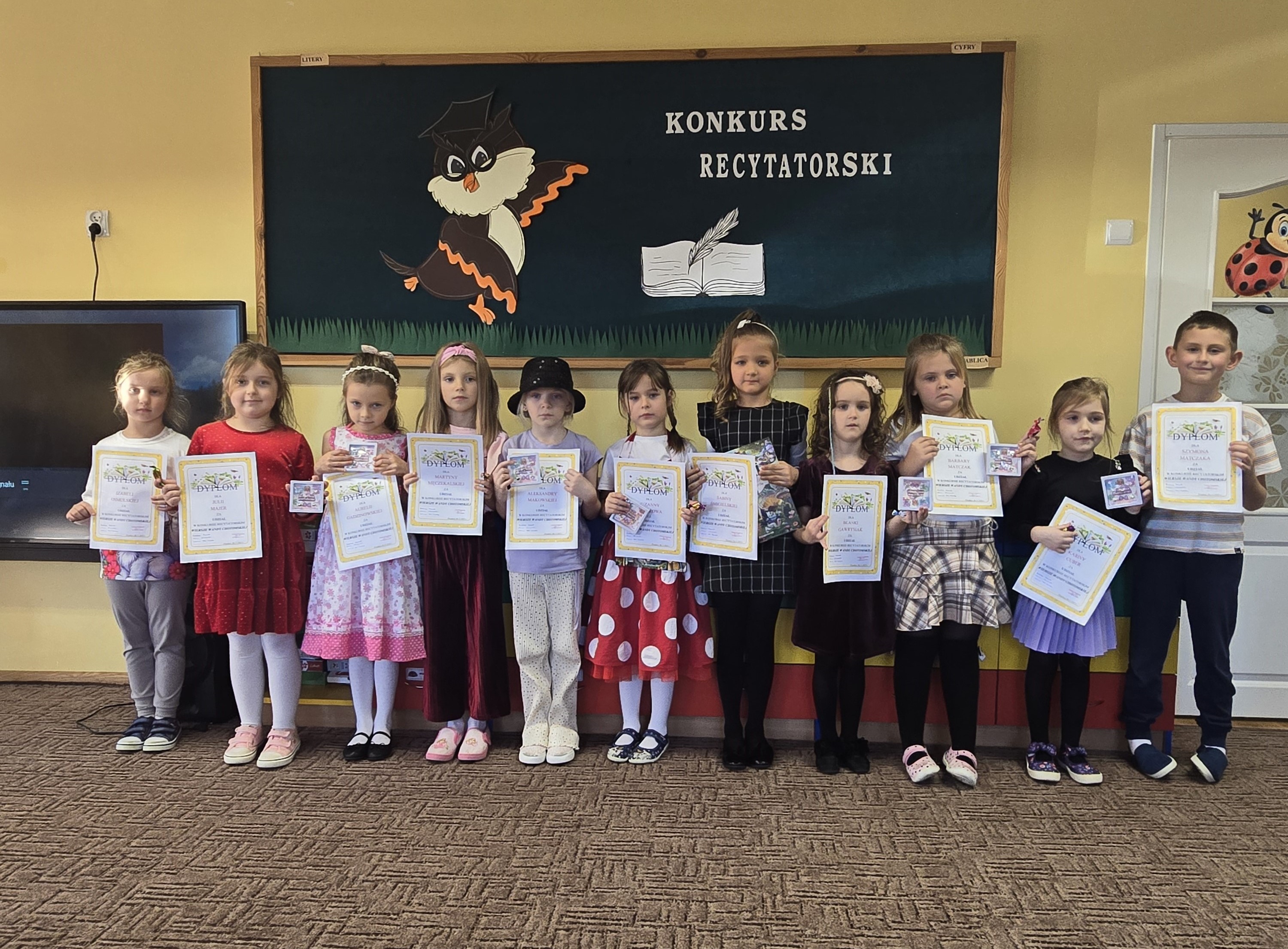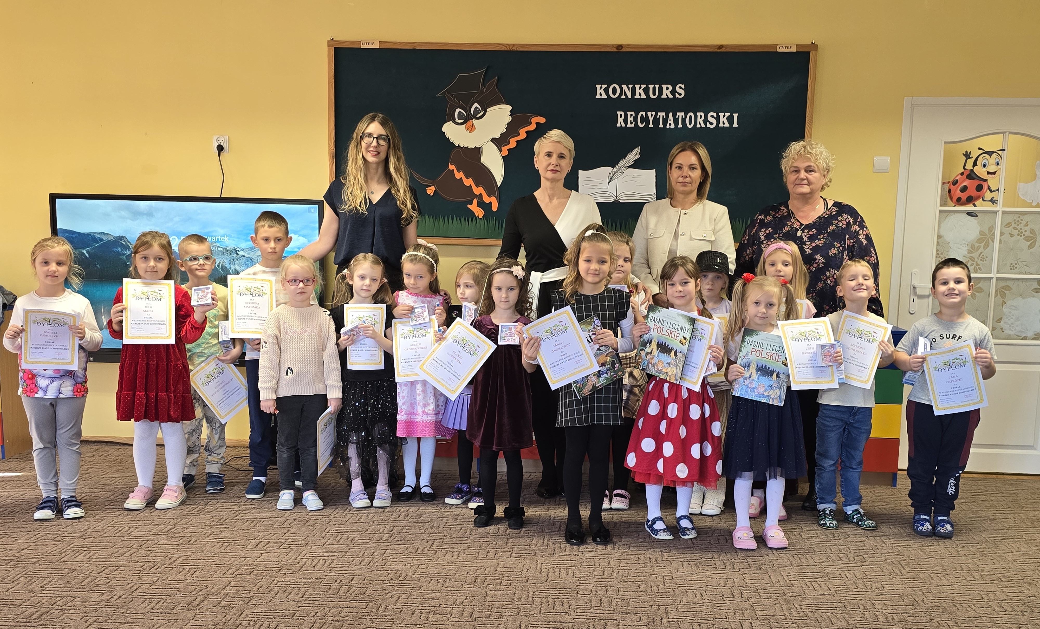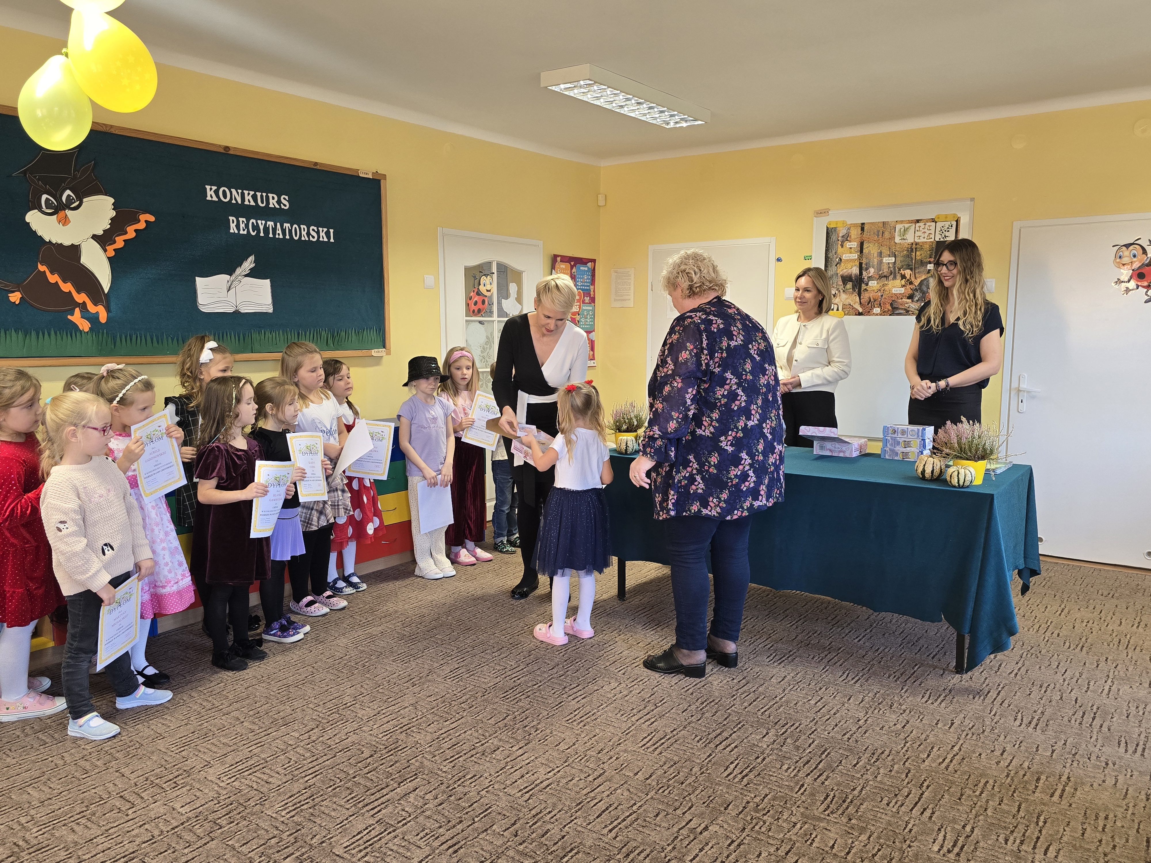 Chęć udziału w konkursie zgłosiła ponad 20 dzieci z naszego przedszkola, którzy zaprezentowali przygotowane wiersze przed komisją konkursową w składzie: Pani Wioletta Janicka - dyrektor przedszkola, Pani Anna Borzenda - wychowawca grupy Pszczółki, Pani Malwina Ptak-Chęcińska - wychowawca grupy Biedronki oraz Pani Ewelina Mazurek - z Biblioteki Publicznej w Przedczu. Wszyscy pięknie recytowali wiersze, prezentując opanowanie pamięciowe, interpretację tekstu, kulturę słowa oraz indywidualny wyraz artystyczny.