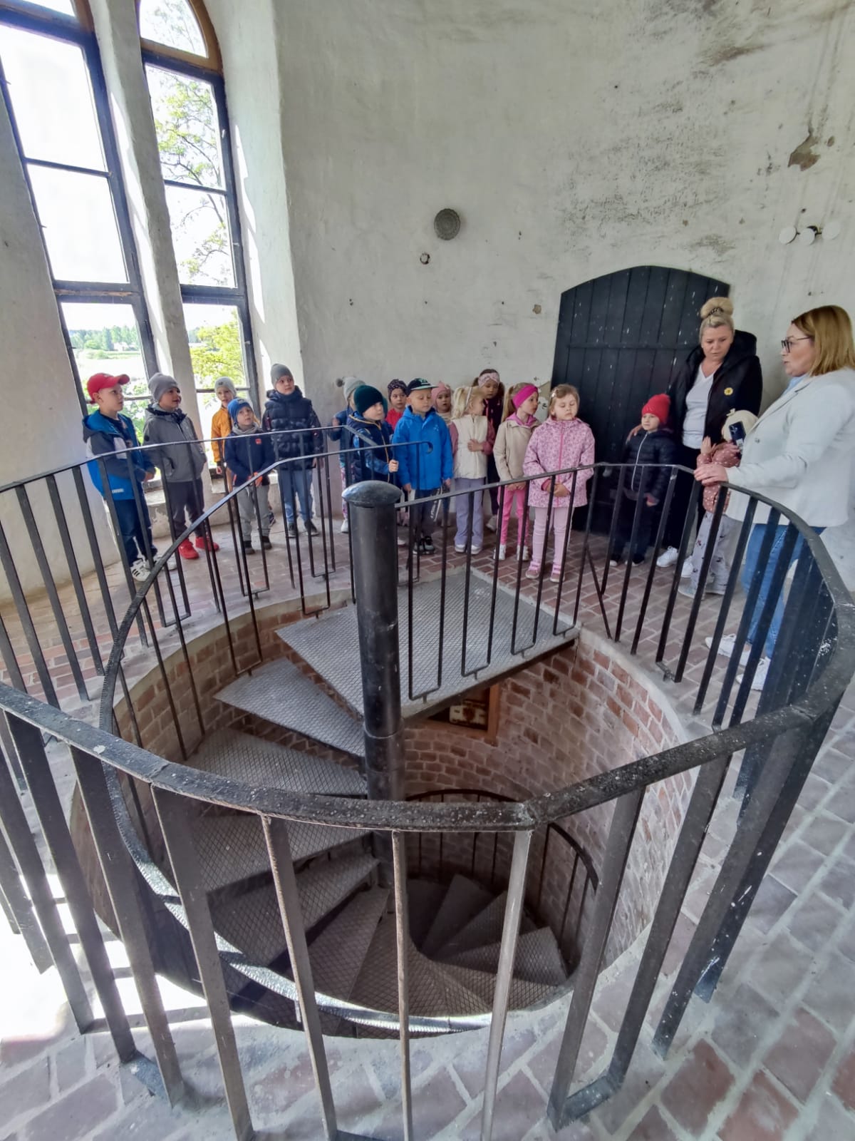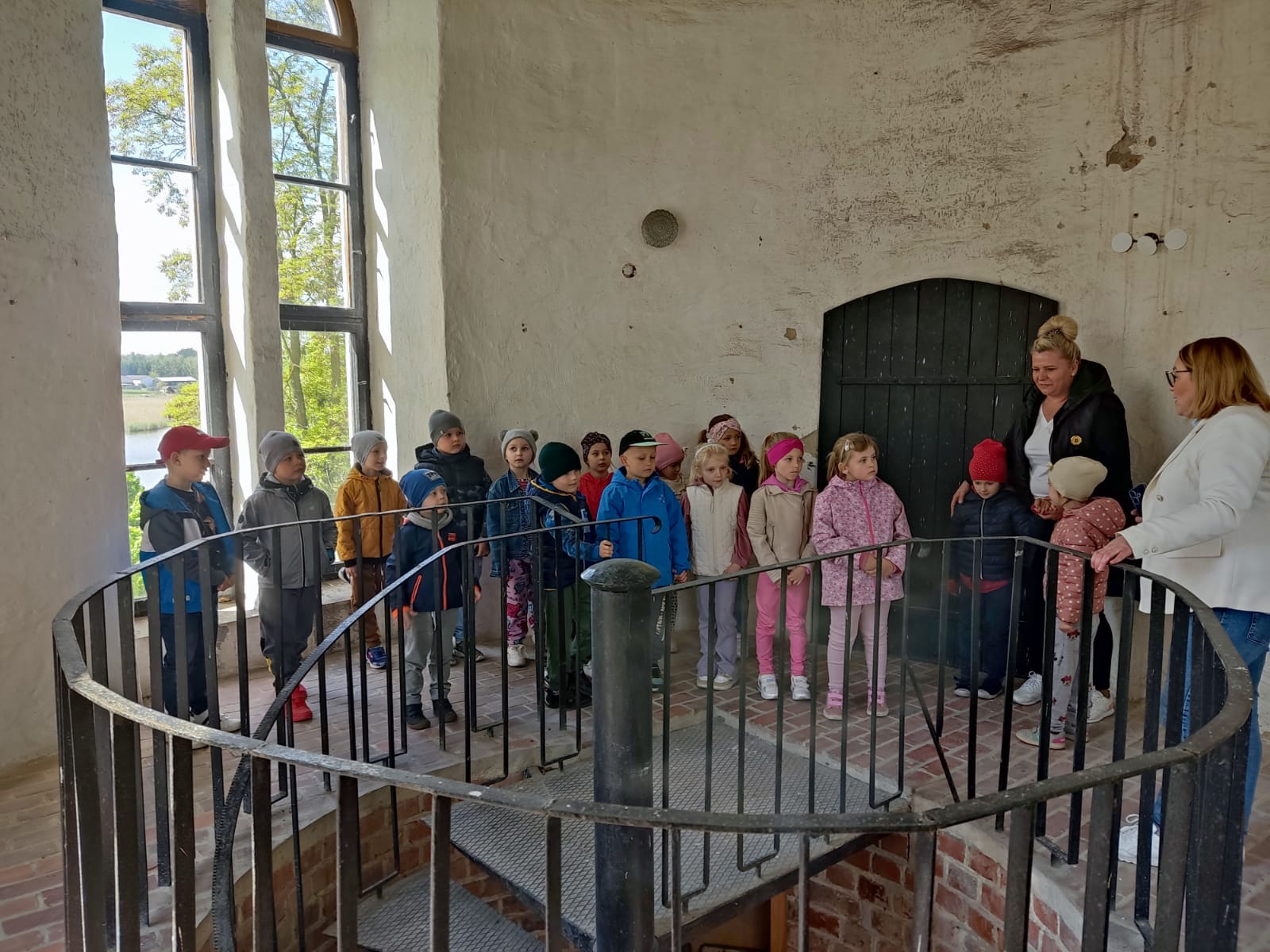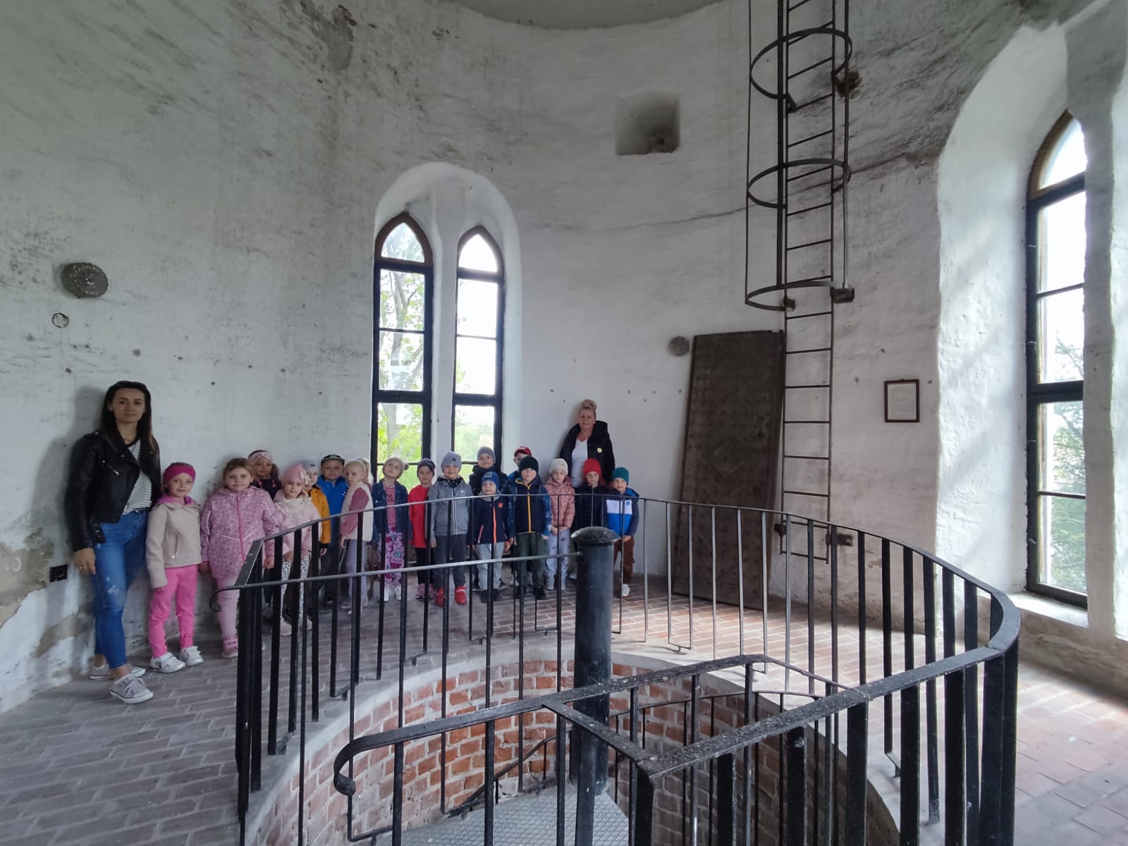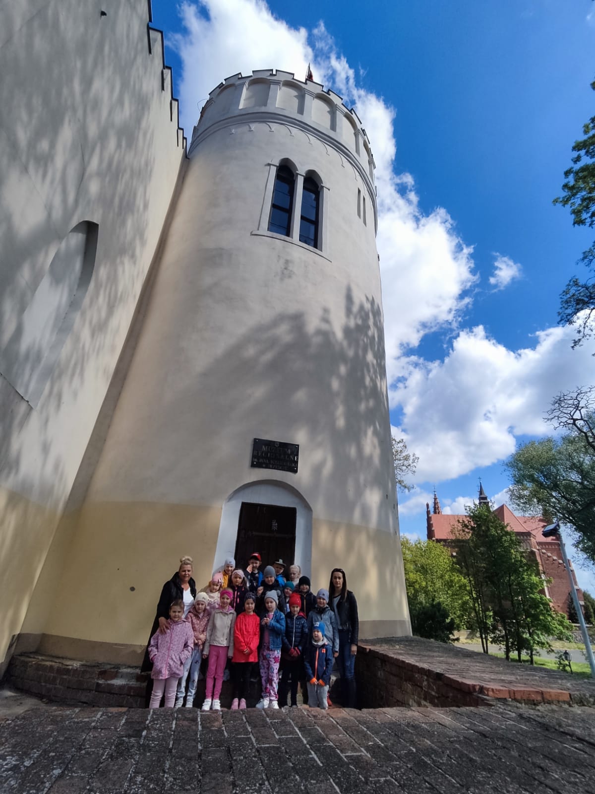 Następnie, pani dyrektor Domu Kultury Agnieszka Wardzińska, zabrała nas na Basztę Zamkową, z której pięknie widać panoramę miasteczka. Jest to zabytek świadczący o znaczeniu miasta w dawnych czasach, pozostałość po średniowiecznym zamku wybudowanym około 1360 roku na zlecenie króla Kazimierza Wielkiego. Obejrzeliśmy również wiele historycznych przedmiotów znajdujących się w zbiorach Domu Kultury.