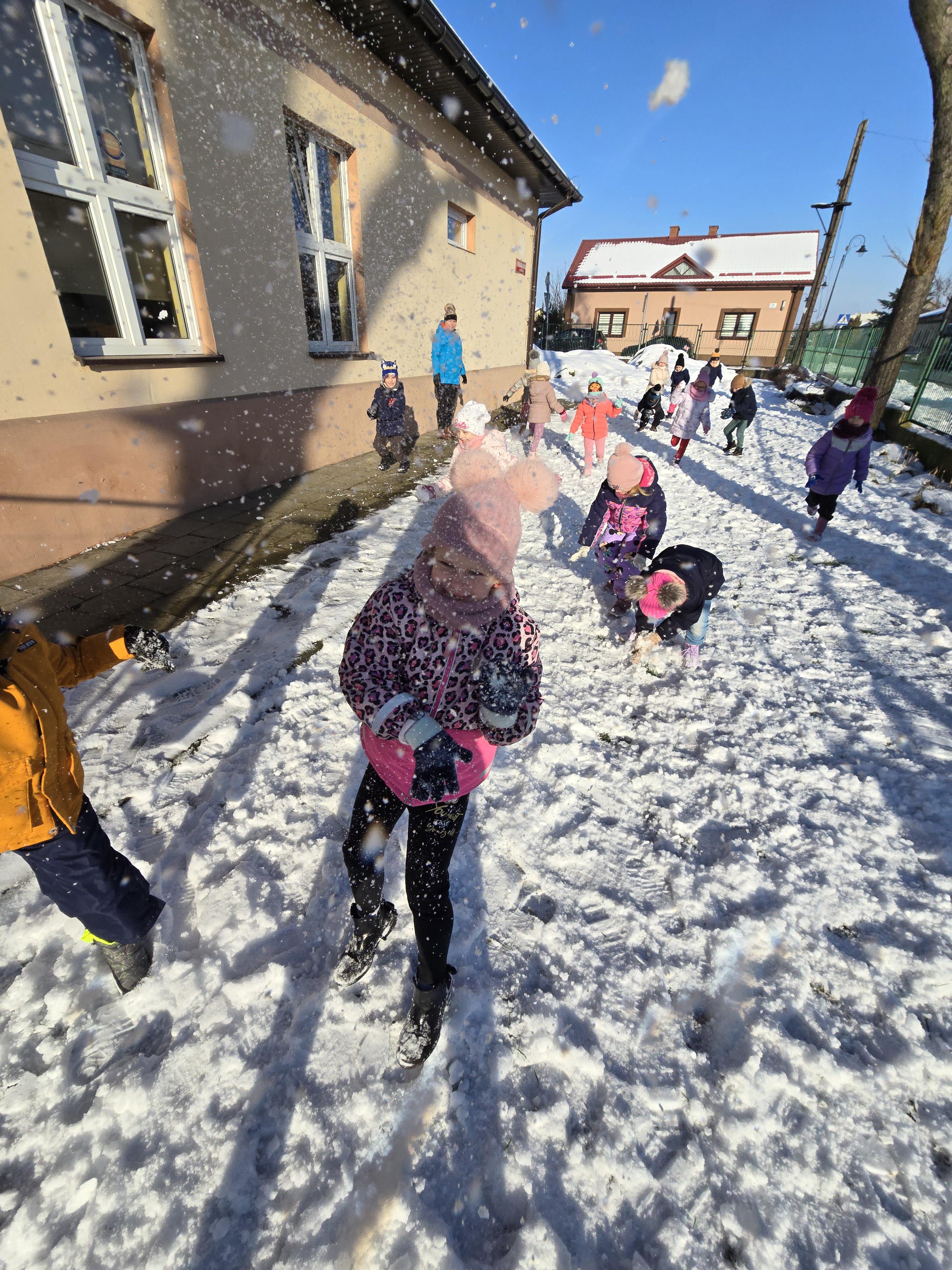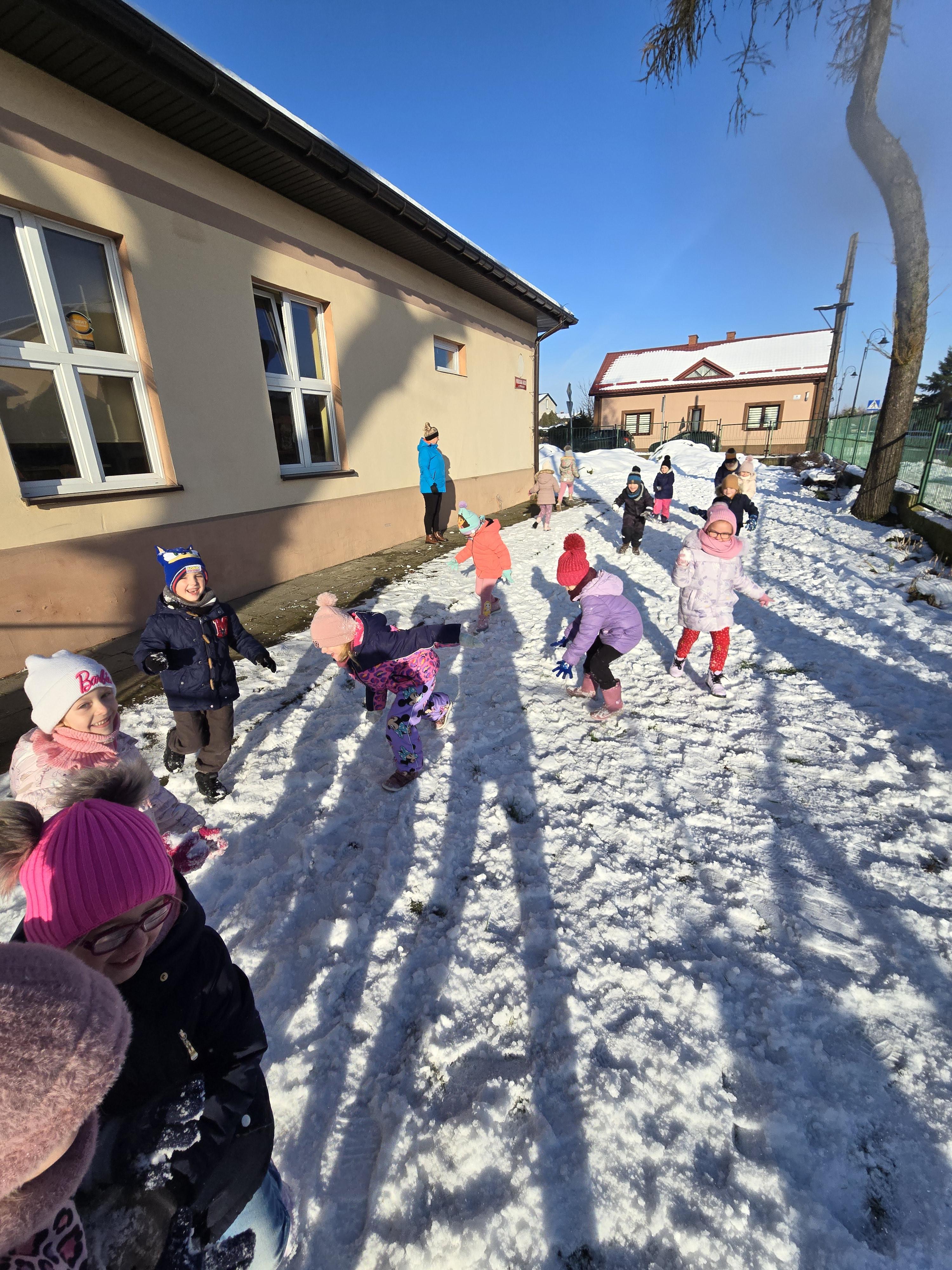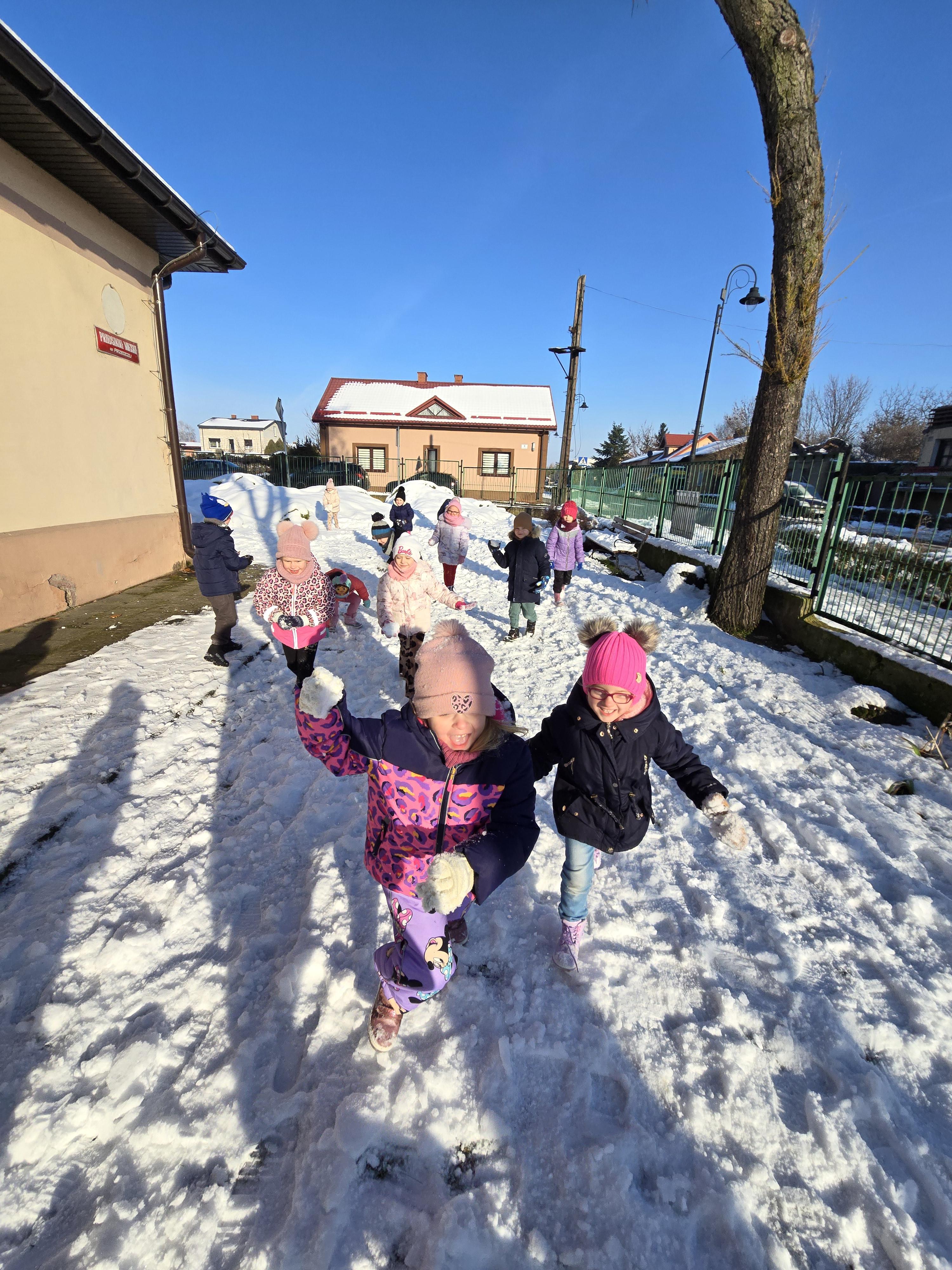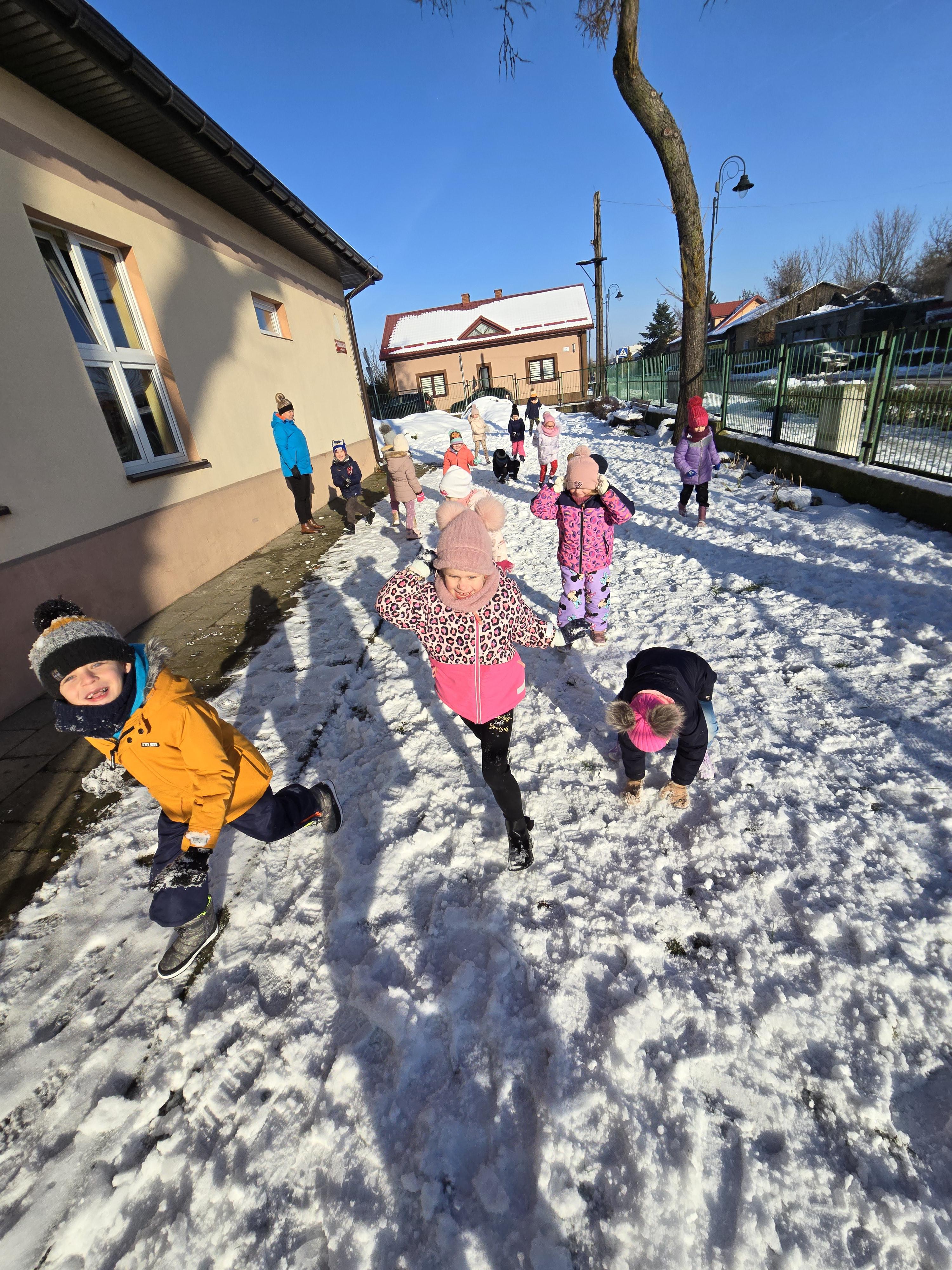 Tegoroczna zima płata nam figle, raz jest ciepło, a za chwilę mróz szczypie nas w nos. Wreszcie pojawił się pierwszy śnieg, który ucieszył bardzo dzieci.